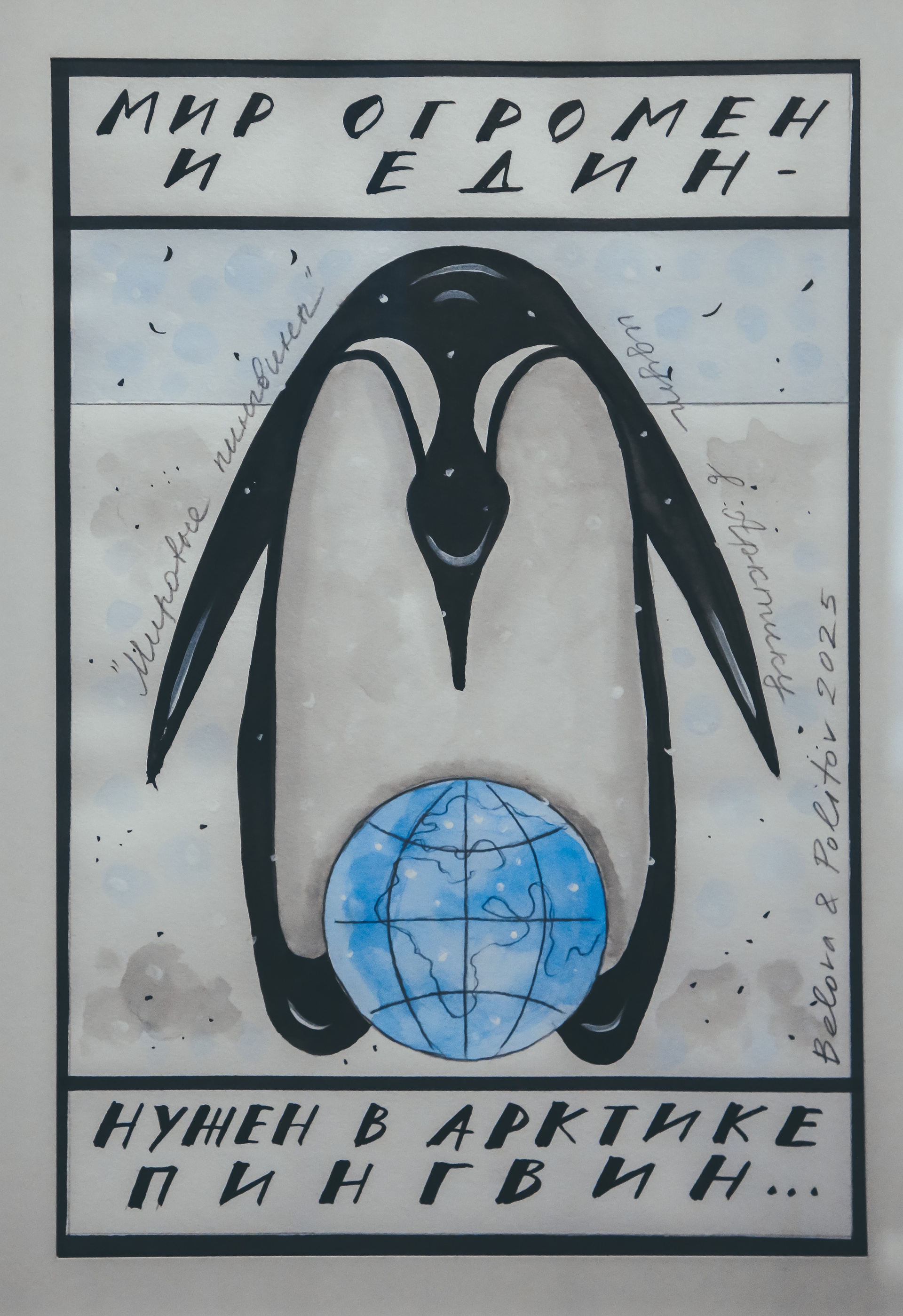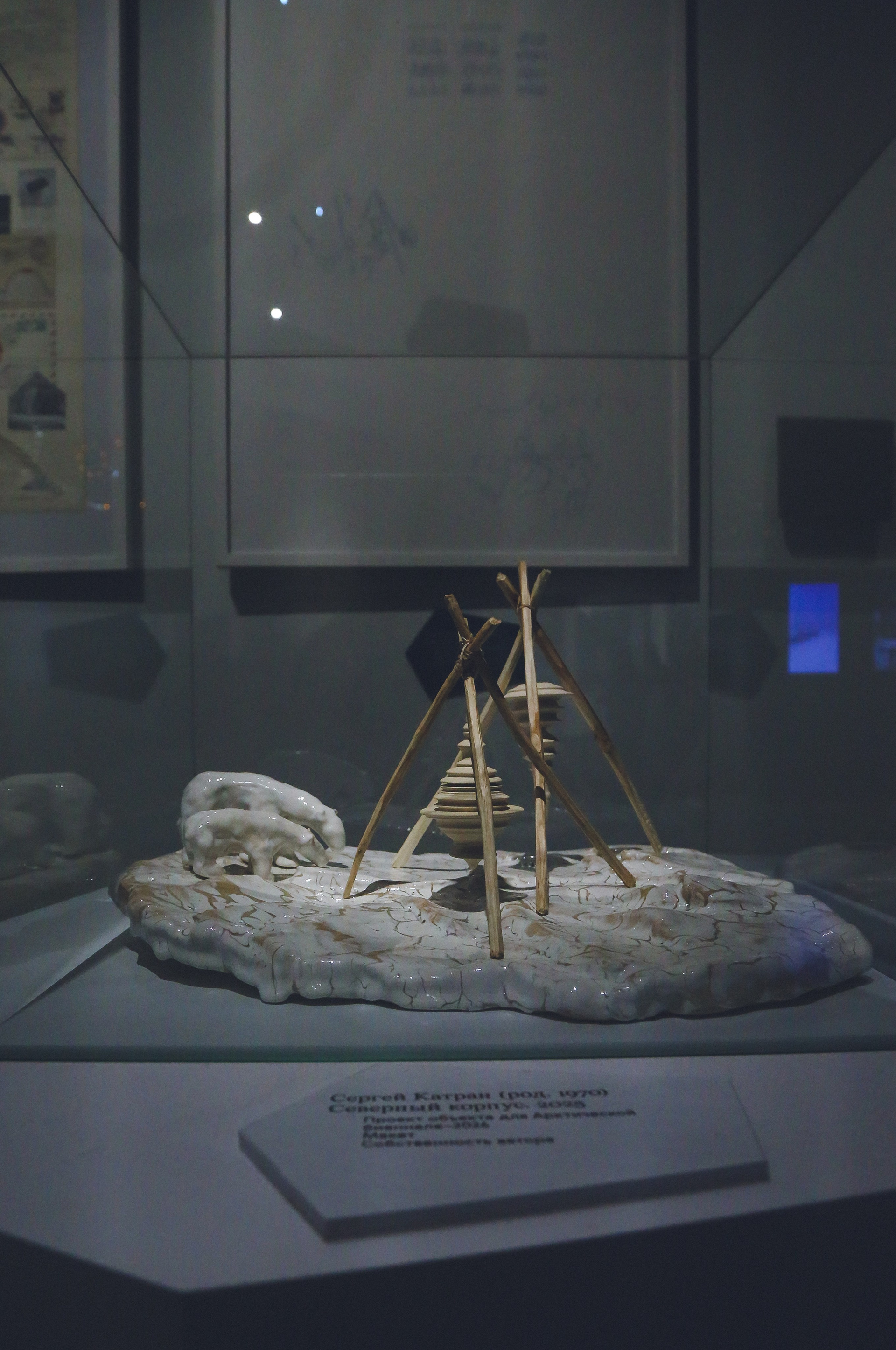 Завершает экспозицию работы и проекты инсталляций для Арктической биеннале 2026, среди которых особенно запомнились абсурдные, но милые «Мировые пингвины» Марины Беловой и Алексея Политова — вращающийся театр теней с поясняющим плакатом «Мир огромен и един / нужен в Арктике пингвин». А центральное место в этом зале занимает масштабная работа «Ледокол Я» художника Александра Пономарева, ставшего всемирно знаменитым благодаря своим смелым перформансам и инталляциям, — корабль под супрематическим черным флагом, который рассекает льды, созданные автором из каленого белого стекла, разбитого на мелкие кусочки. Притом именно Пономарев является идейным вдохновителем и комиссаром предстоящей Арктической архитектурно-художественной биеннале, что уже сейчас будоражит умы любителей искусства, однако в силу того, что пройдет на ледоколе в условиях Крайнего Севера, — будет куда менее доступна, чем нынешняя роскошная выставка в Третьяковке.