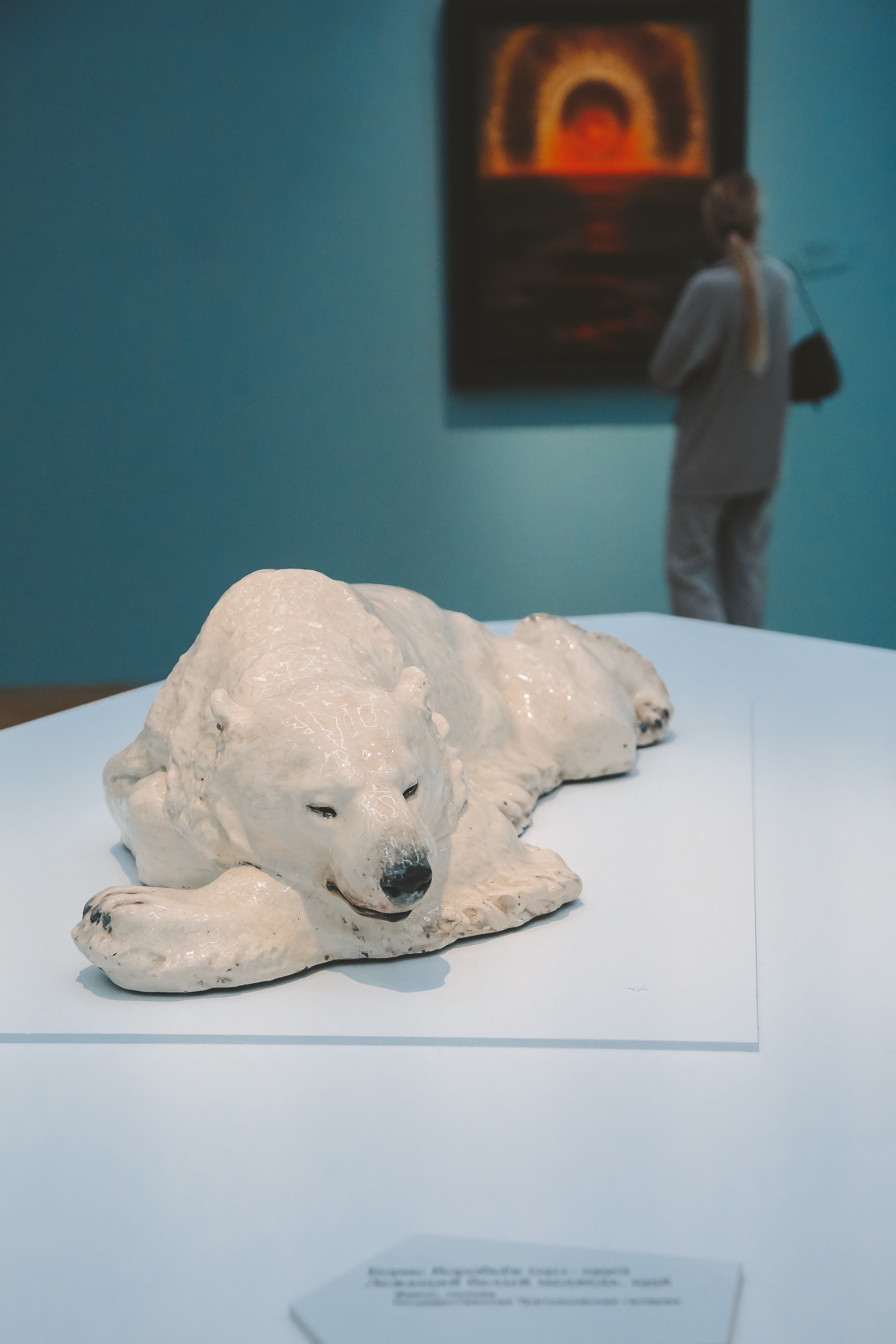 Советский период, как можно догадаться, и самый продуктивный в плане освоения Арктики, и самый обширный в части художественного осмысления. Тут и завораживающие, сочные полотна «Полуночное солнце» Климента Редько и «Не для туристов» Игоря Рубана (не только художника, но также Почетного полярника) — просто феерия красок, и наивная живопись ненецких мастеров — Константина Панкова и Тыко Вылко (ему в совсем юном возрасте давал уроки сам Александр Борисов, живший во время своих экспедиций среди ненцев как обычный кочевник-оленевод). Словно король выставки, расположился роскошный фаянсовый белый медведь работы скульптора-анималиста Бориса Воробьева по соседству с другими скульптурами: вырезанная из дерева женщина с голубыми глазами, синими волосами и чайкой на плече олицетворяет Белое море (работа ученика Дейнеки — Александра Богословского), а неподалеку можно найти немного гротескного Витуса Беринга, также из расписного дерева, авторства Аделаиды Пологовой.