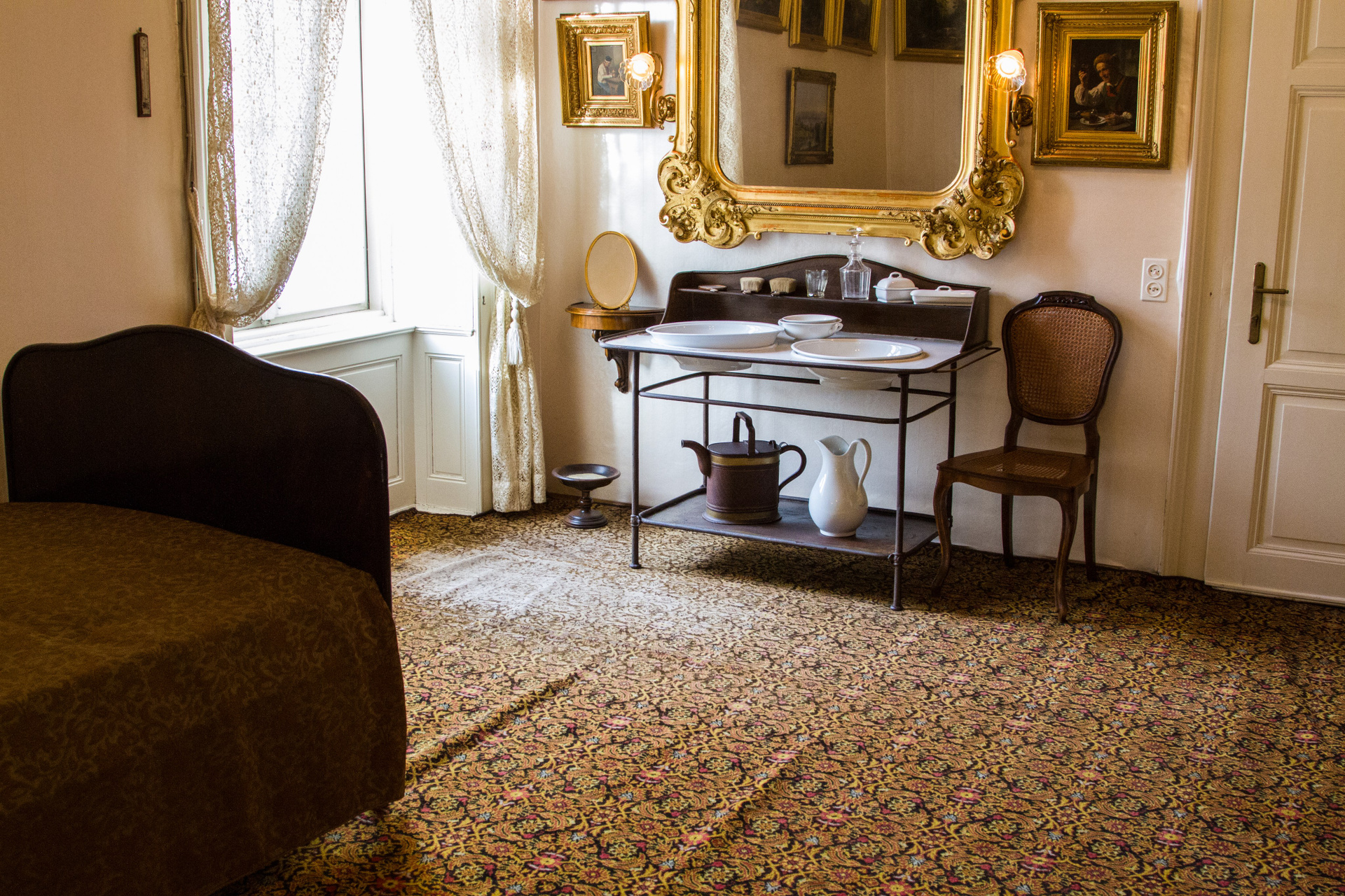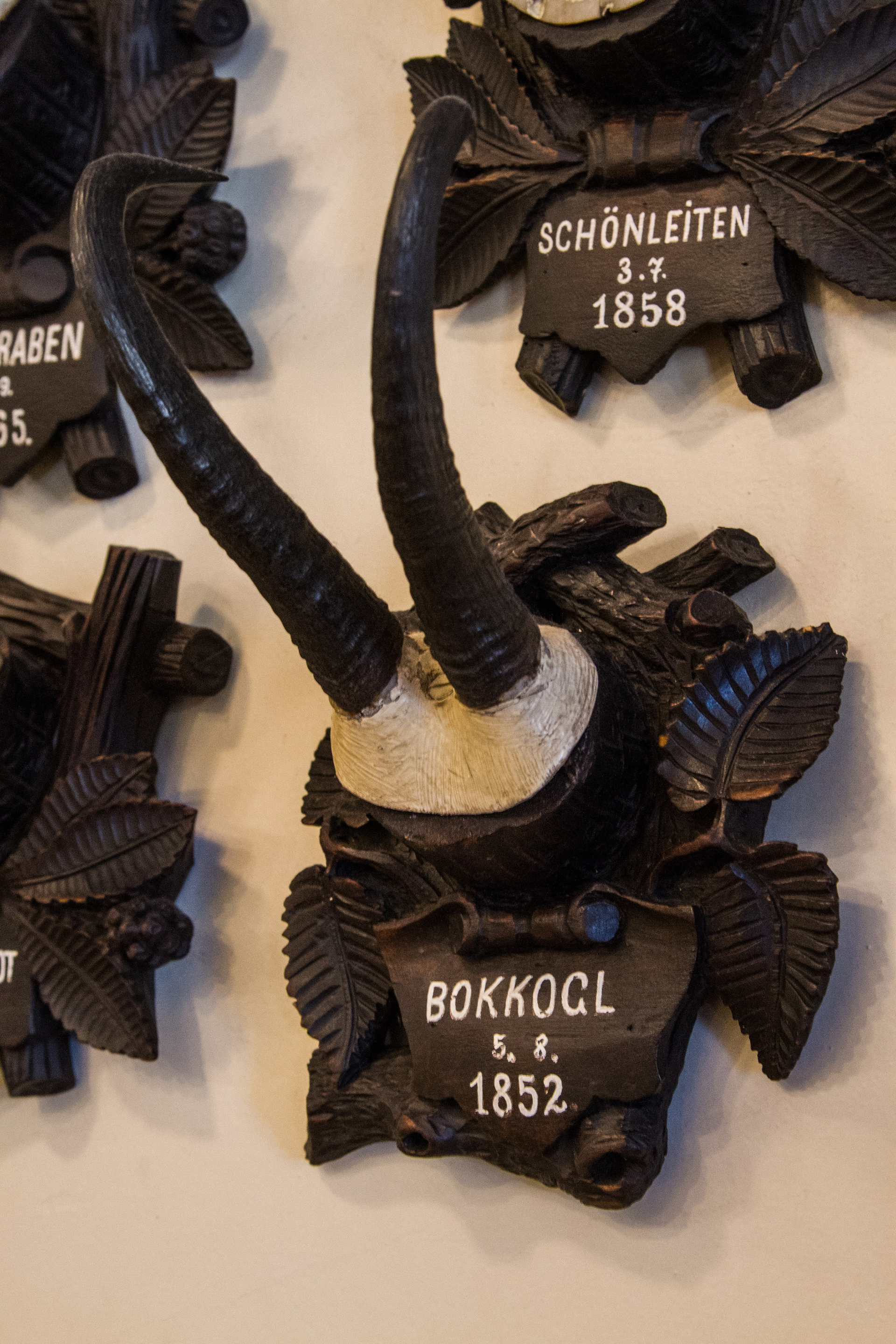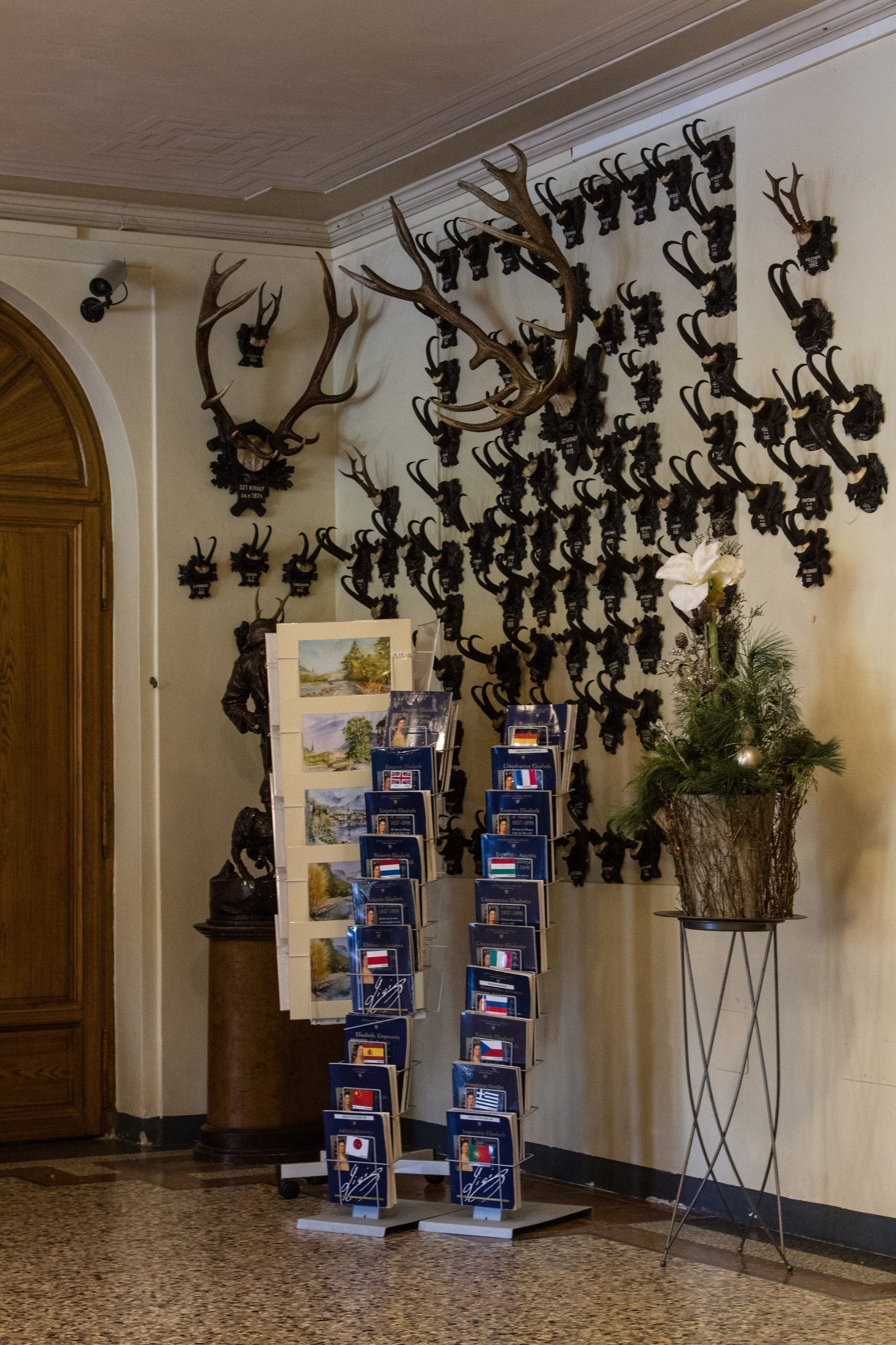 Я упоминала, что в Бад-Ишле множество симпатичных особняков, поскольку в разные годы здесь отдыхали или даже жили весьма долгое время известные и творческие личности — композиторы, художники и т. п. Но наибольшее внимание все-таки привлекает вилла кайзера Франца Иосифа, в которой он провел почти 60 летних сезонов. Подарена она была императору его матерью по случаю бракосочетания с баварской принцессой Елизаветой (Сисси), а сейчас принадлежит их правнуку Маркусу Габсбург-Лотарингскому и функционирует как музей. Порядок организации экскурсий в котором, к слову, не очень тщательно продуман: по вилле водят группы с гидом, говорящим исключительно по-немецки (и это учитывая, что половина экскурсантов ни слова не понимает!), а еще весьма увлеченно и, соответственно, пространно. Как результат — многие очень быстро от этого устают, разбредаются по комнатам, процесс затягивается, так что следующим группам приходится долго ждать своей очереди. Почему бы не отказаться от «группового» формата и не раздать всем аудиогиды — загадка!.. Но ничего не поделаешь — пришлось нам примерно тридцать минут гулять в холле, рассматривая сувениры и изучая охотничьи трофеи кайзера, благо — тут их тьма-тьмущая: кажется, более сотни рогов оленей и серн, под каждым экспонатом — аккуратная табличка с временем и местом добычи.