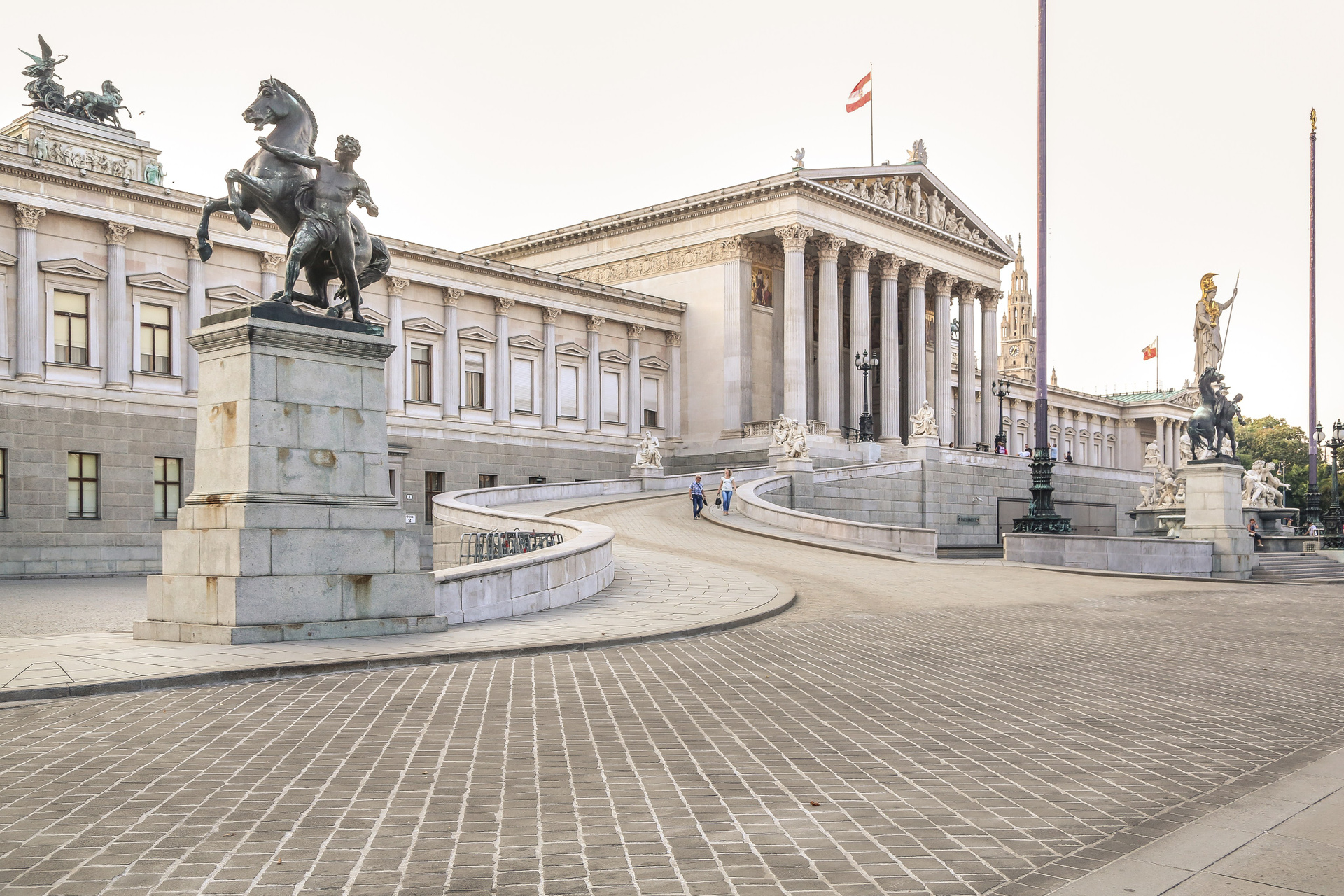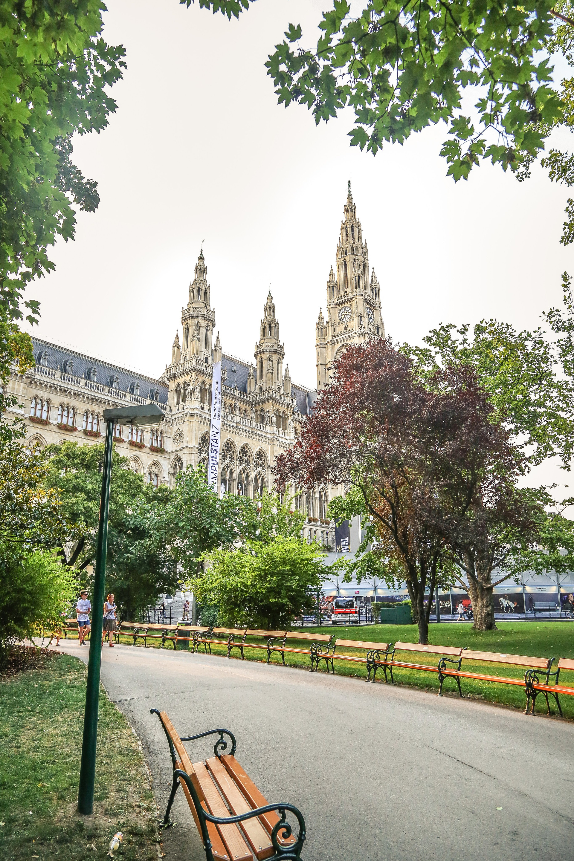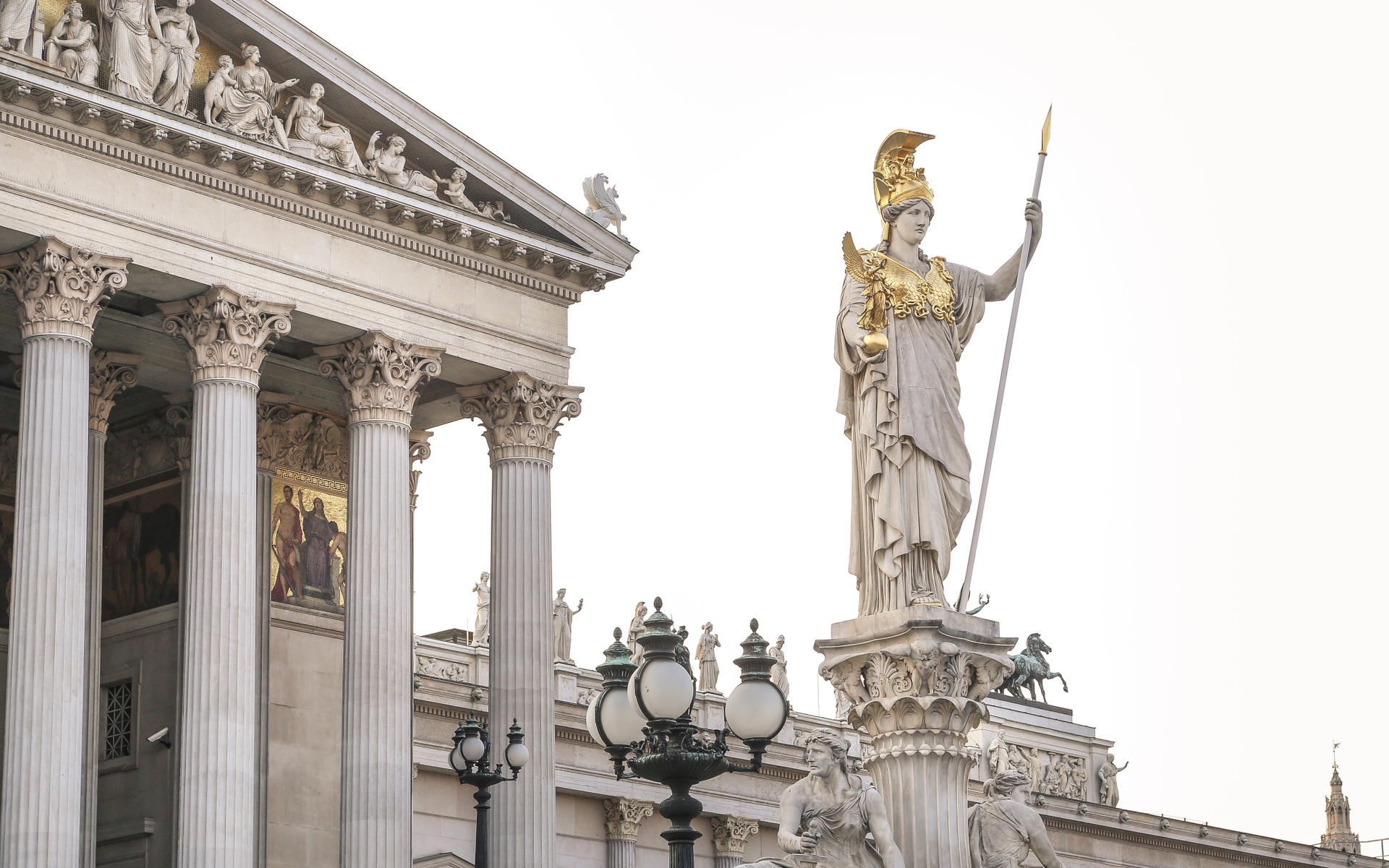 Здания некоторых государственных органов в Вене очень похожи на храмы — эдакие святилища справедливости, свободы и права, словно в идеальном обществе. И краше всего, естественно, Ратуша/готический собор и Парламент/древнегреческий храм. Стоят они, кстати, бок о бок в западной части Ринга, так что стометровая башня ратуши с фигурой рыцаря на вершине выглядывает из-за коринфской колоннады.