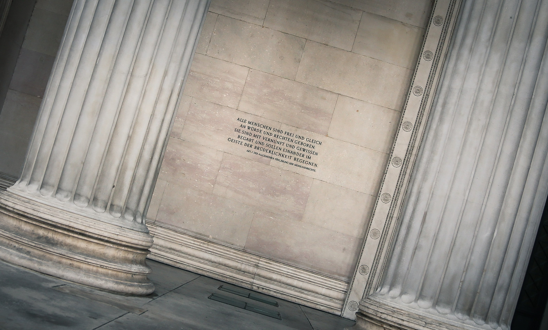 Кстати, о духе. Больше всего в здании австрийского парламента мне нравится фраза, начертанная на его стене: «Все люди рождаются свободными и равными в правах. Они наделены разумом и совестью и должны поступать в отношении друг друга в духе братства». Так звучит первая статья Всеобщей декларации прав человека. Мне кажется, отличная идея — когда среднестатистический парламентарий каждый день по дороге на работу наталкивается взглядом на подобные слова, его сознание не может не меняться в лучшую сторону. Вот бы и нам перенять.