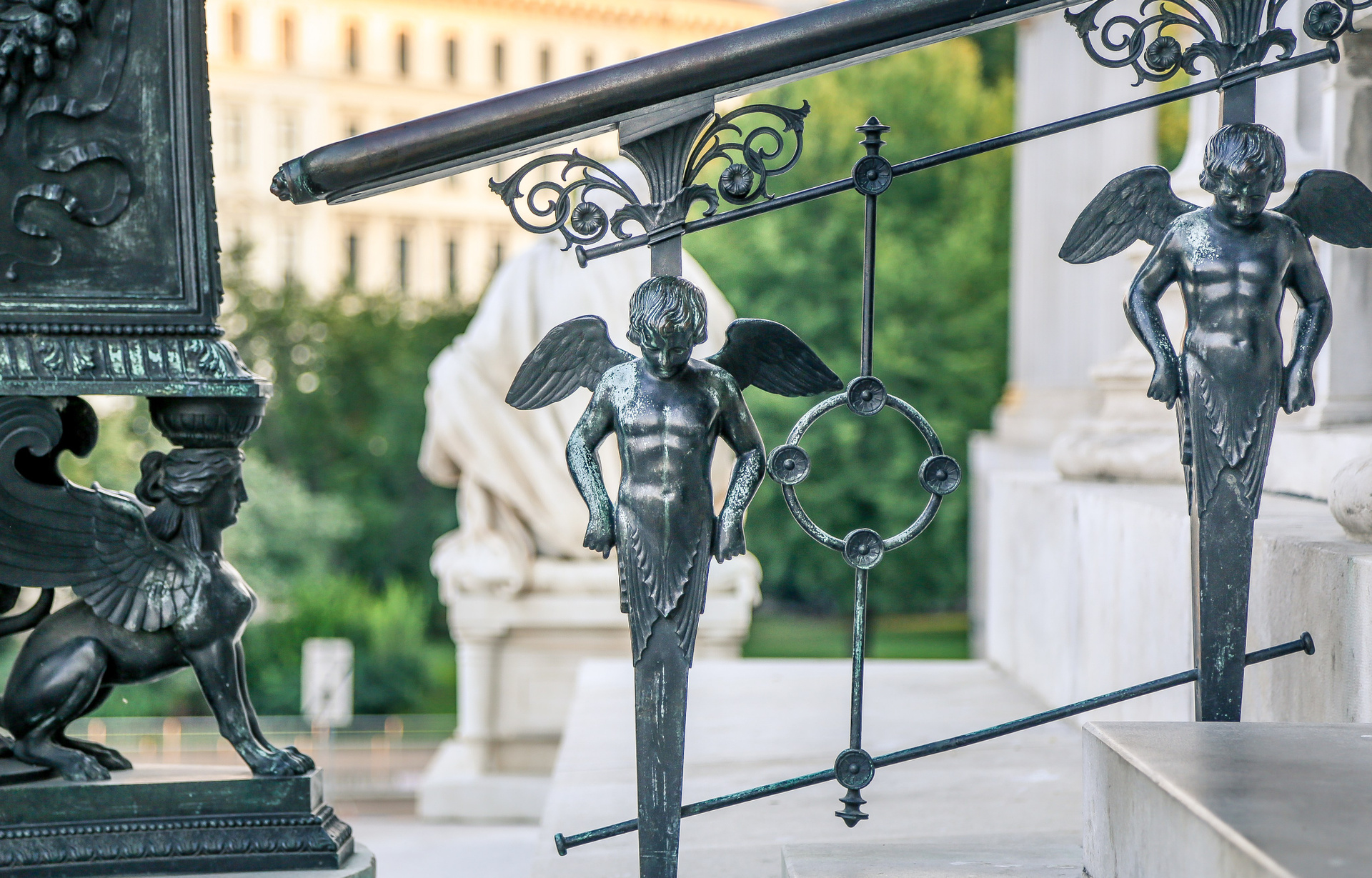 В ту пору юношеский оркестр Башмета концертировал в Вене, выступление закончилось поздно, так что гулять по городу мы с друзьями отправились уже за полночь и дошли как раз до района административных органов — побродили вокруг ратуши, вернулись к импозантному парламенту. Ребятам захотелось поближе рассмотреть величественную колоннаду, однако пандусы, ведущие к ней, оказались ночью перегорожены (видимо, чтобы бездомные часом не устроили себе там ночлежку). Но что европейцу суровая преграда, то русскому музыканту… кхм, индифферентно)) Ничтоже сумняшеся перелезли они через заграждение и начали с радостными гиками носиться меж фигур античных историков. Я же успокаивала себя тем, что «Хоэс Хаус» и не такое видел — в начале 20-го столетия там царил ужасный базар, как в нашей Думе девяностых. Правда, внутренне все-таки съеживалась, представляя, как с минуты на минуту появится полиция или охрана и всех нас повяжут под укоризненными взглядами мраморных статуй. Однако то ли дух свободы в Австрии силен, то ли местные службы безопасности не столь параноидальны по сравнению, например, с русскими ФСОшниками, но в любом случае всё обошлось.