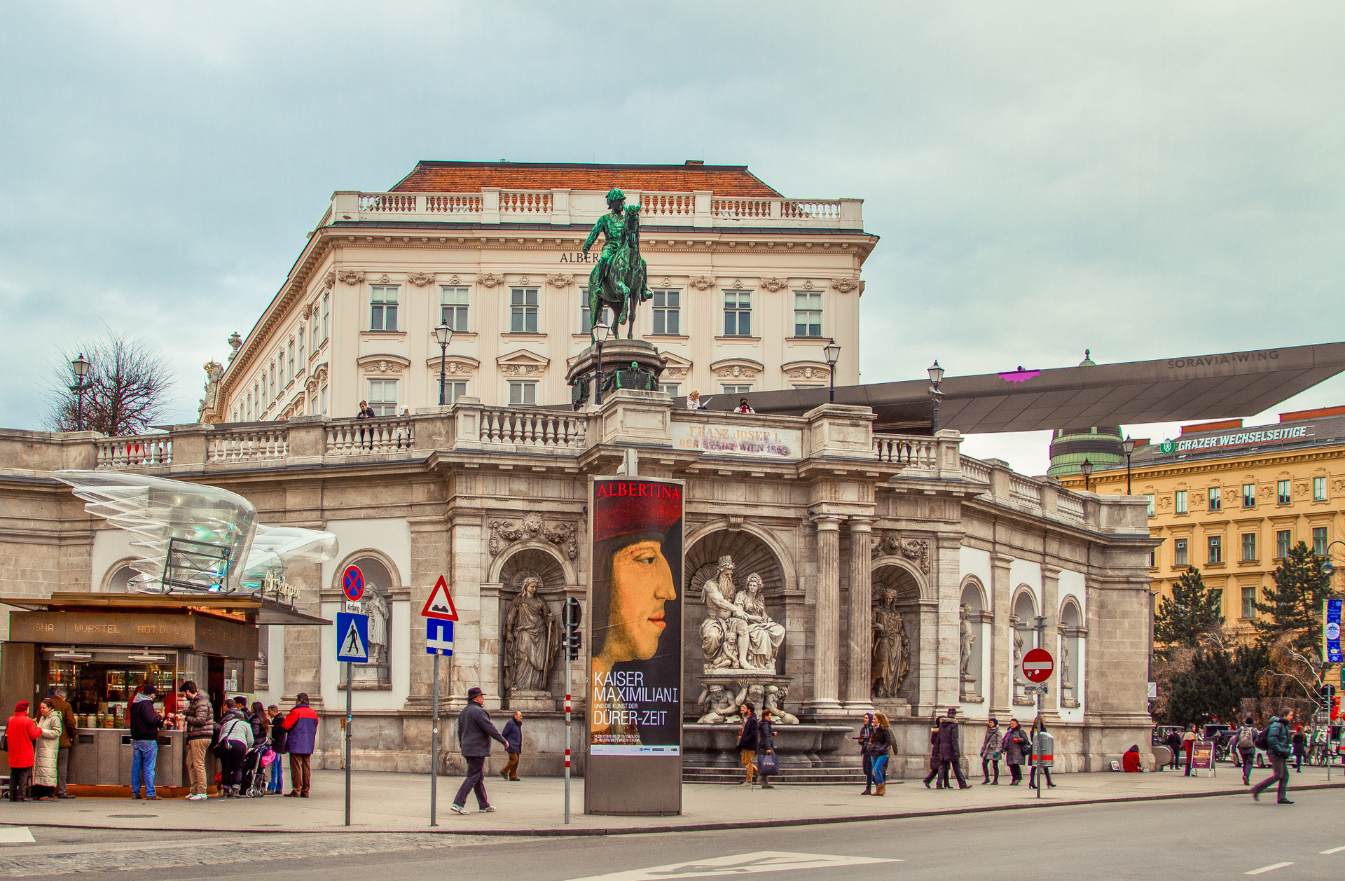 Хофбург — семь веков власти, поэма в камне. Всякий очередной Габсбург на троне расширял и достраивал что-то — театры, конюшни, ворота, площади, всего не перечесть… Накануне Первой мировой был закончен величественный «Новый дворец». Сохранился и Старый, а еще Швейцарский дворик, Императорская капелла, Испанский манеж, Национальная библиотека, площадь Ин-дер-Бург — свидетель судилищ и парадов. Это целый комплекс зданий, на юге ограниченный садами — Фольксгартеном и Бурггартеном, а на западе тянущийся до Оперного театра — на него смотрит галерея Альбертина, находящаяся в бывшем дворце эрцгерцога Альбрехта и тоже считающаяся частью Хофбурга.