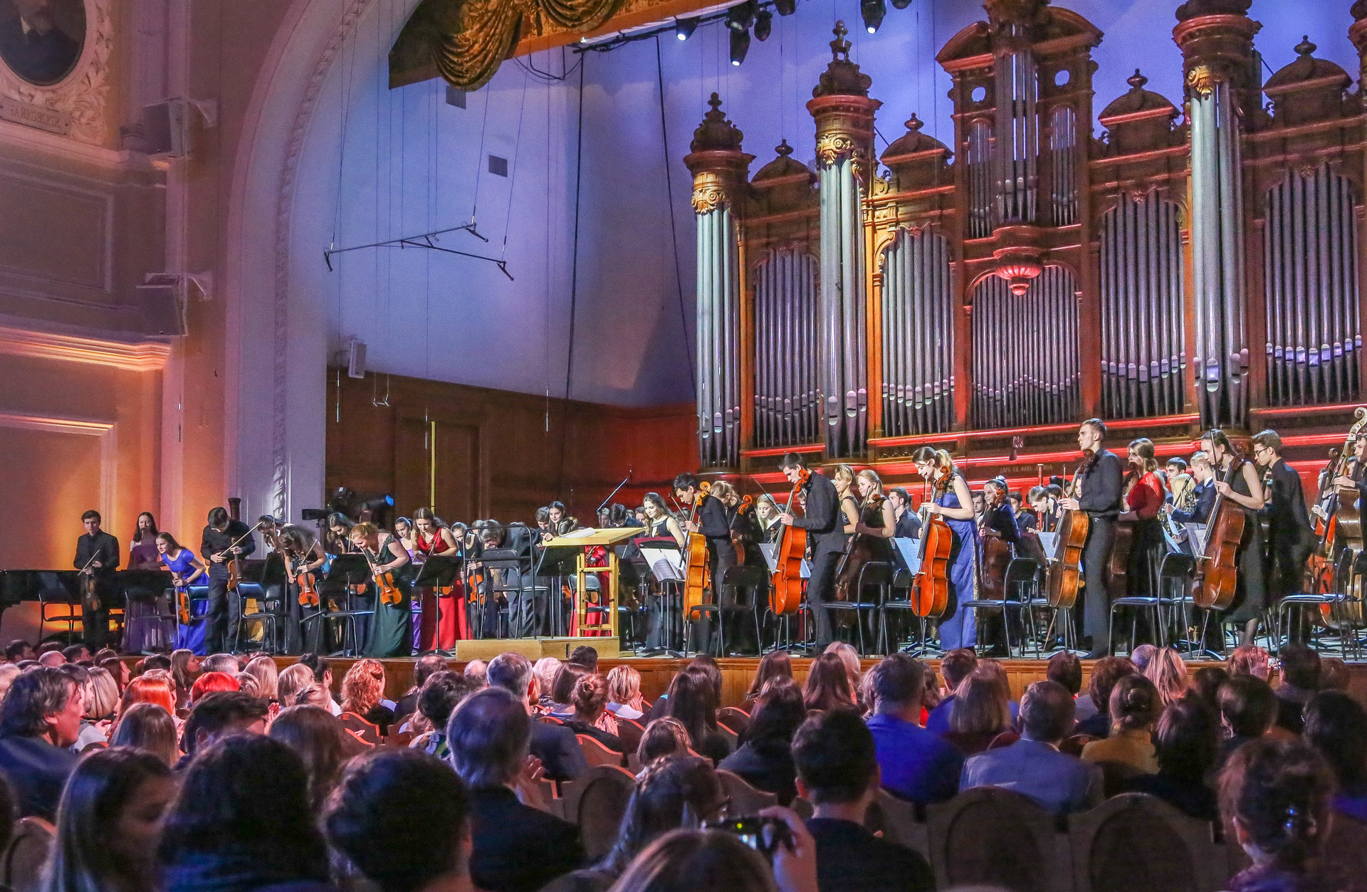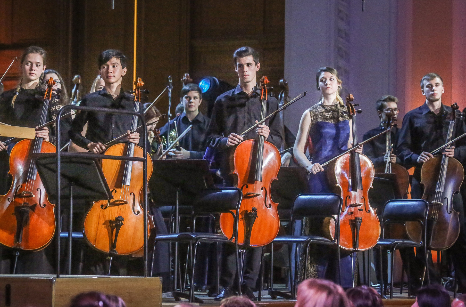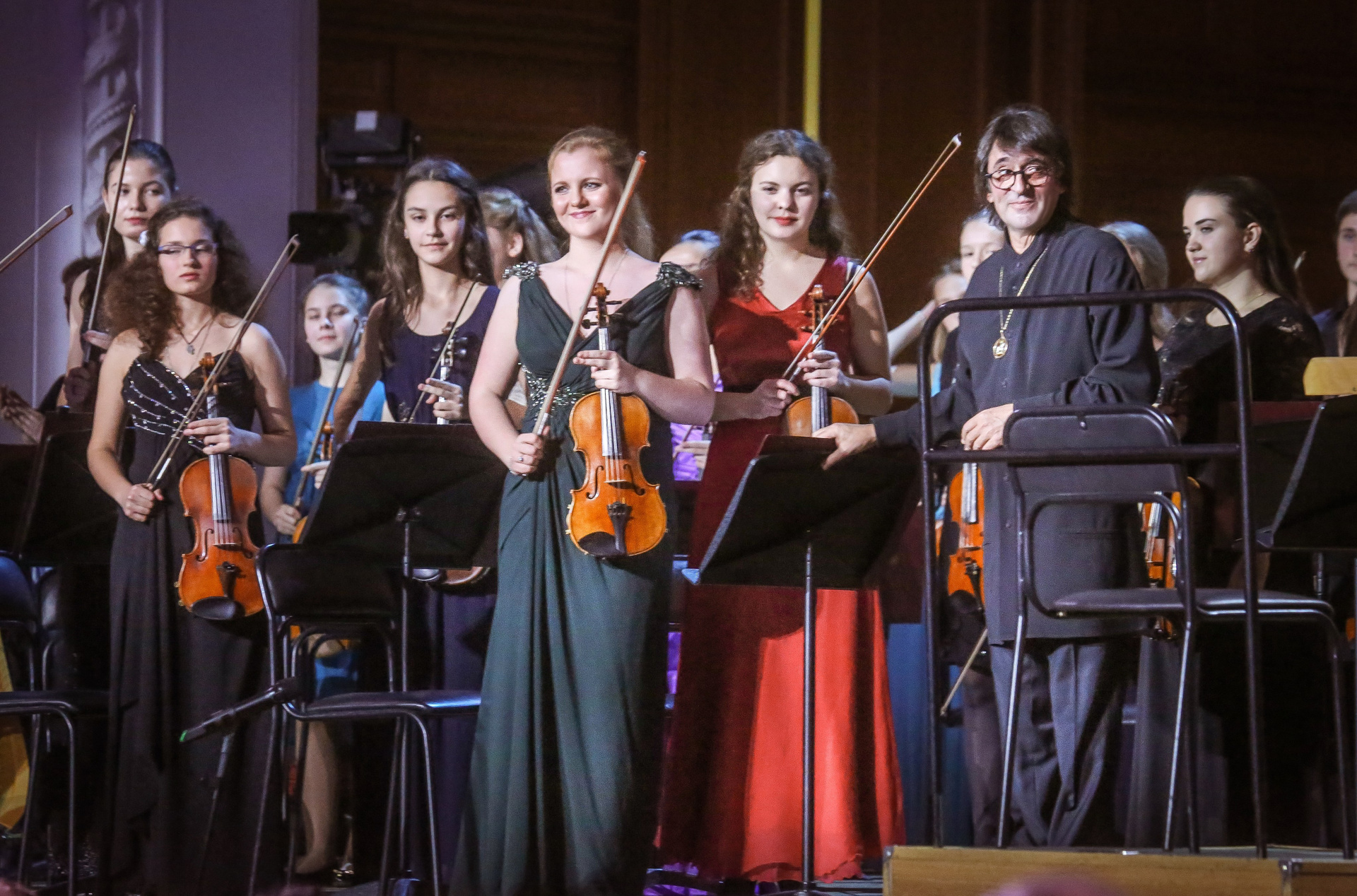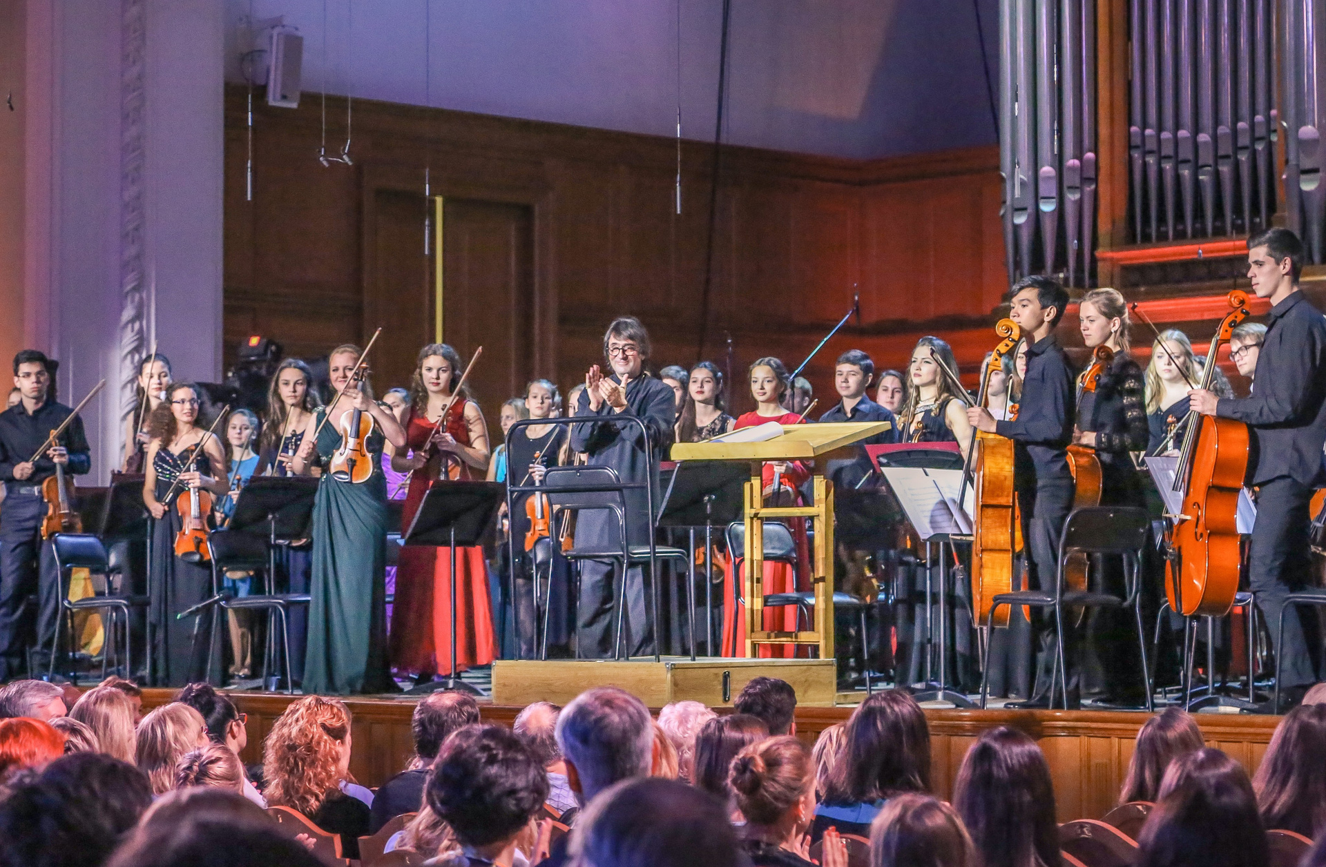 А четыре года назад их полку прибыло: в 2012-м Юрий Башмет устроил беспрецедентное и масштабное прослушивание среди учащихся музыкальных школ и вузов разных городов, по результатам которого был сформирован Всероссийский юношеский симфонический оркестр. С тех пор подобный конкурс у них случается каждый сезон — для пополнения и обновления состава, после чего коллектив отправляется в гастрольное турне по России или Европе. Нынешний год не стал исключением — с мая по октябрь прошел новый всероссийский отбор, затем ребята в течение недели интенсивных репетиций в пансионате на Николиной Горе готовили концертную программу, а с начала ноября стартовала череда выступлений: в телепроекте «Большая опера», на церемонии вручения грантов Мэра Москвы в театре «Геликон», в концертном зале Мариинского театра, и, наконец, 6 ноября на закрытии фестиваля «Ars Longa» в Большом зале Консерватории, который по этому случаю принарядился и предстал в необычном празднично-пестром освещении.