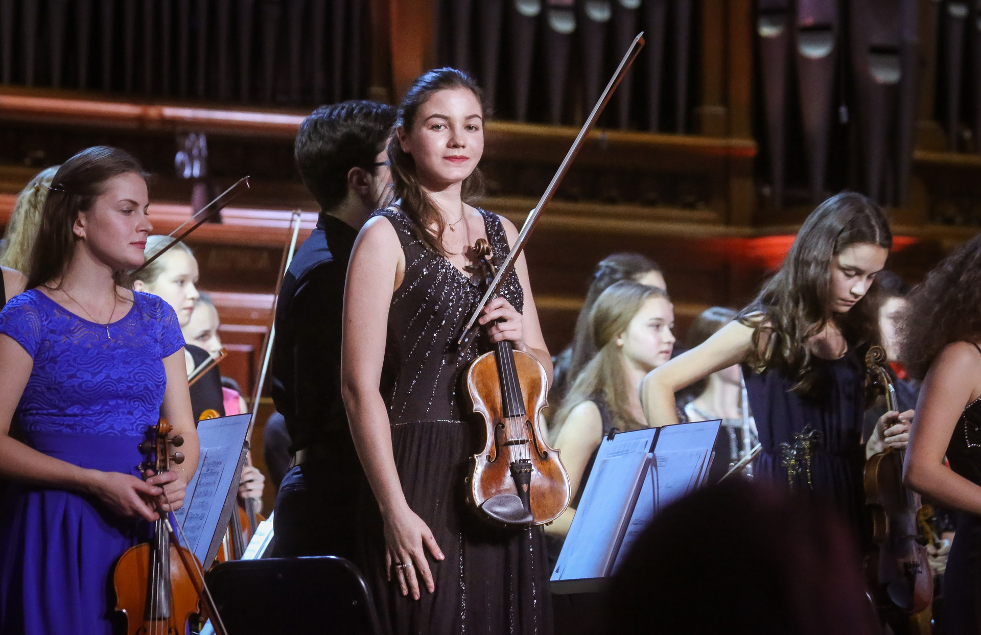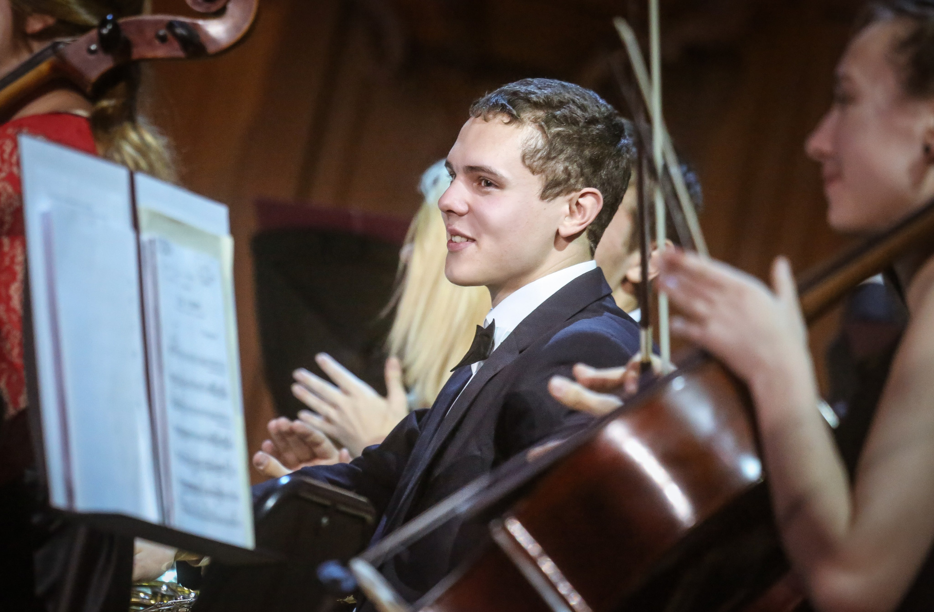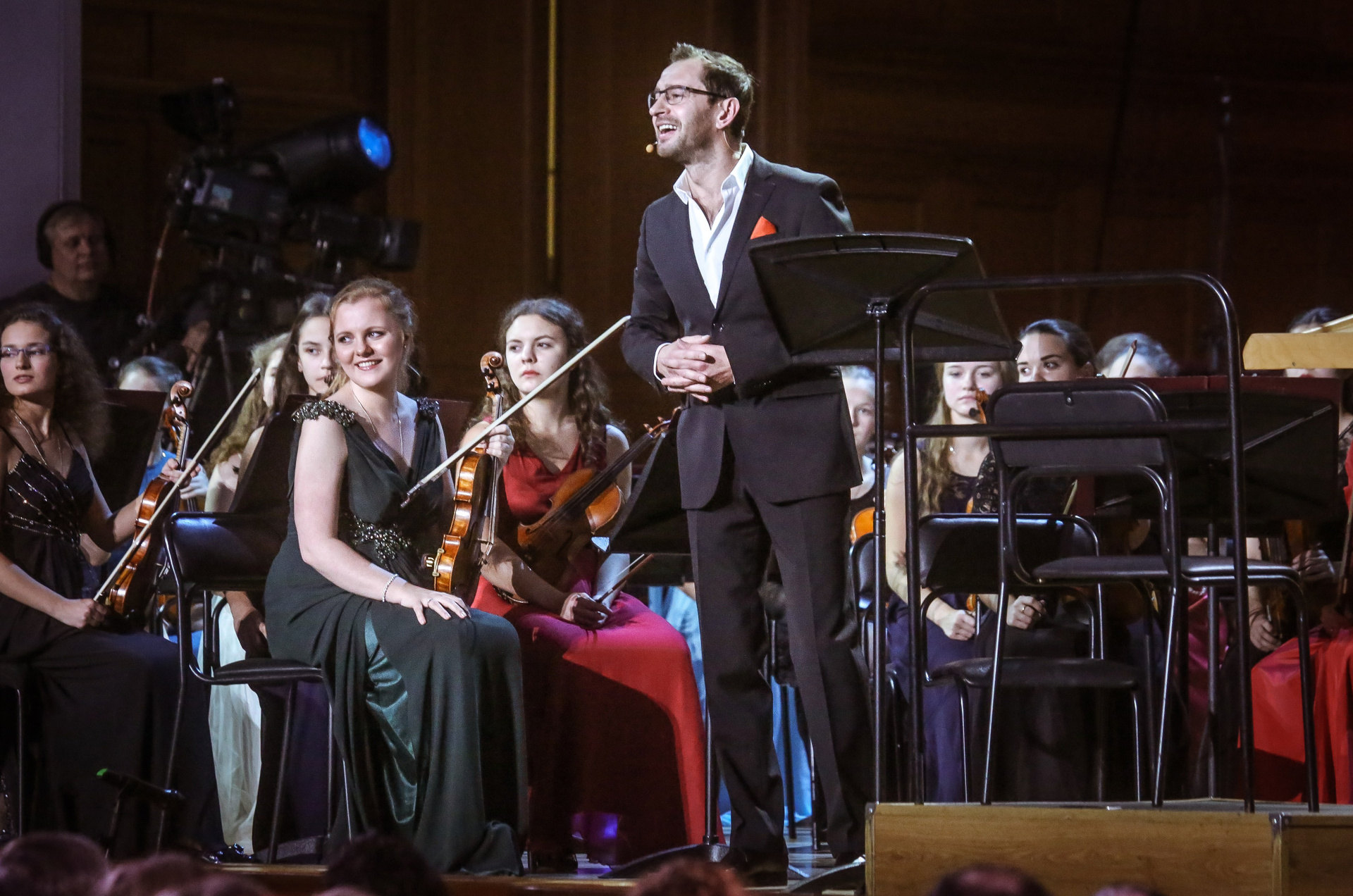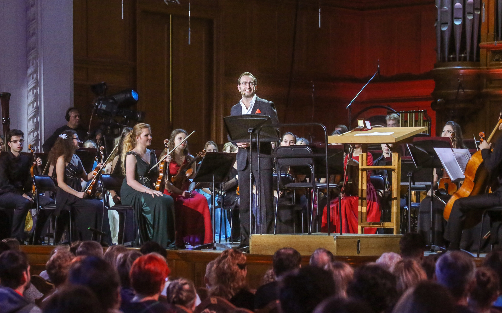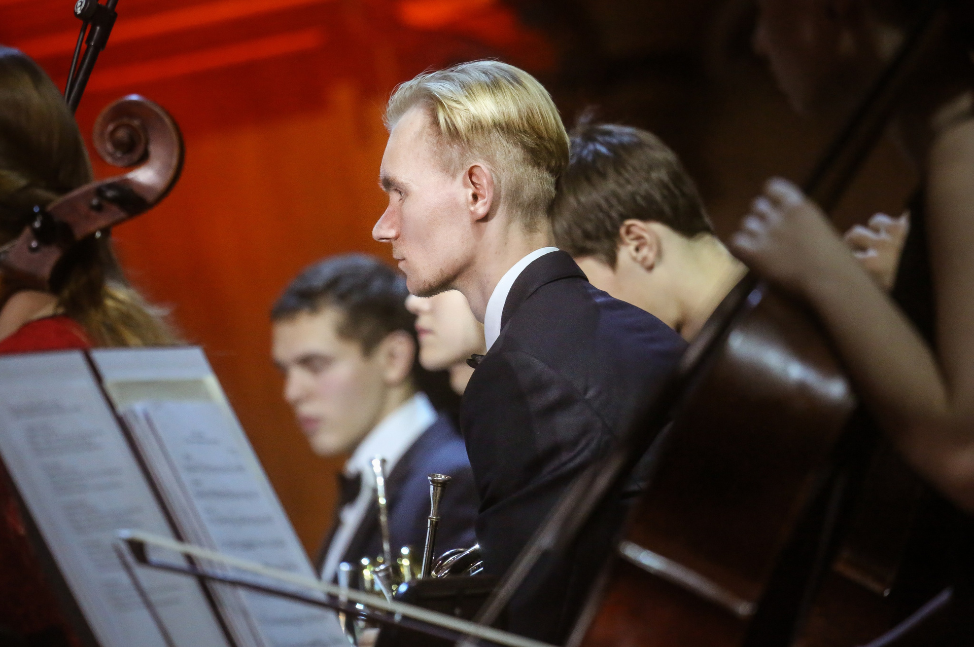 А четыре года назад их полку прибыло: в 2012-м Юрий Башмет устроил беспрецедентное и масштабное прослушивание среди учащихся музыкальных школ и вузов разных городов, по результатам которого был сформирован Всероссийский юношеский симфонический оркестр. С тех пор подобный конкурс у них случается каждый сезон — для пополнения и обновления состава, после чего коллектив отправляется в гастрольное турне по России или Европе. Нынешний год не стал исключением — с мая по октябрь прошел новый всероссийский отбор, затем ребята в течение недели интенсивных репетиций в пансионате на Николиной Горе готовили концертную программу, а с начала ноября стартовала череда выступлений: в телепроекте «Большая опера», на церемонии вручения грантов Мэра Москвы в театре «Геликон», в концертном зале Мариинского театра, и, наконец, 6 ноября на закрытии фестиваля «Ars Longa» в Большом зале Консерватории, который по этому случаю принарядился и предстал в необычном празднично-пестром освещении.
