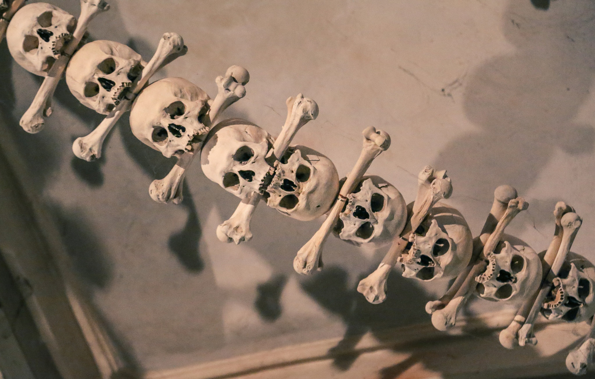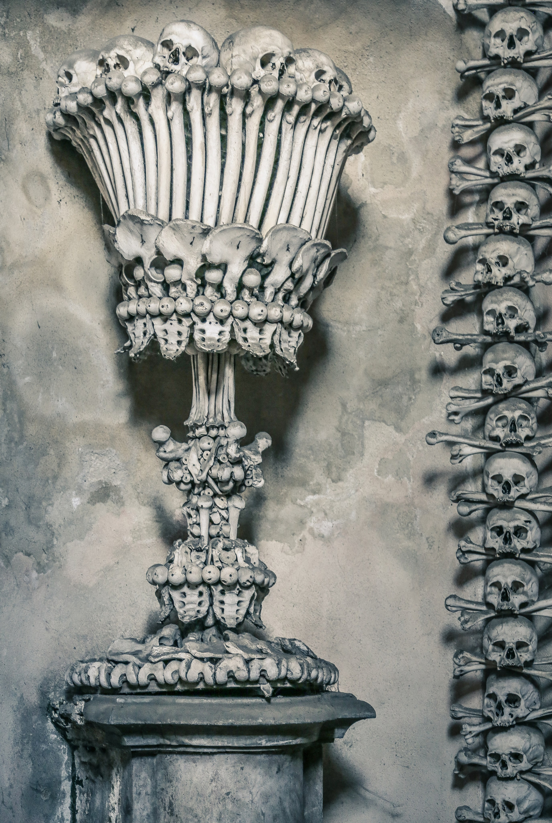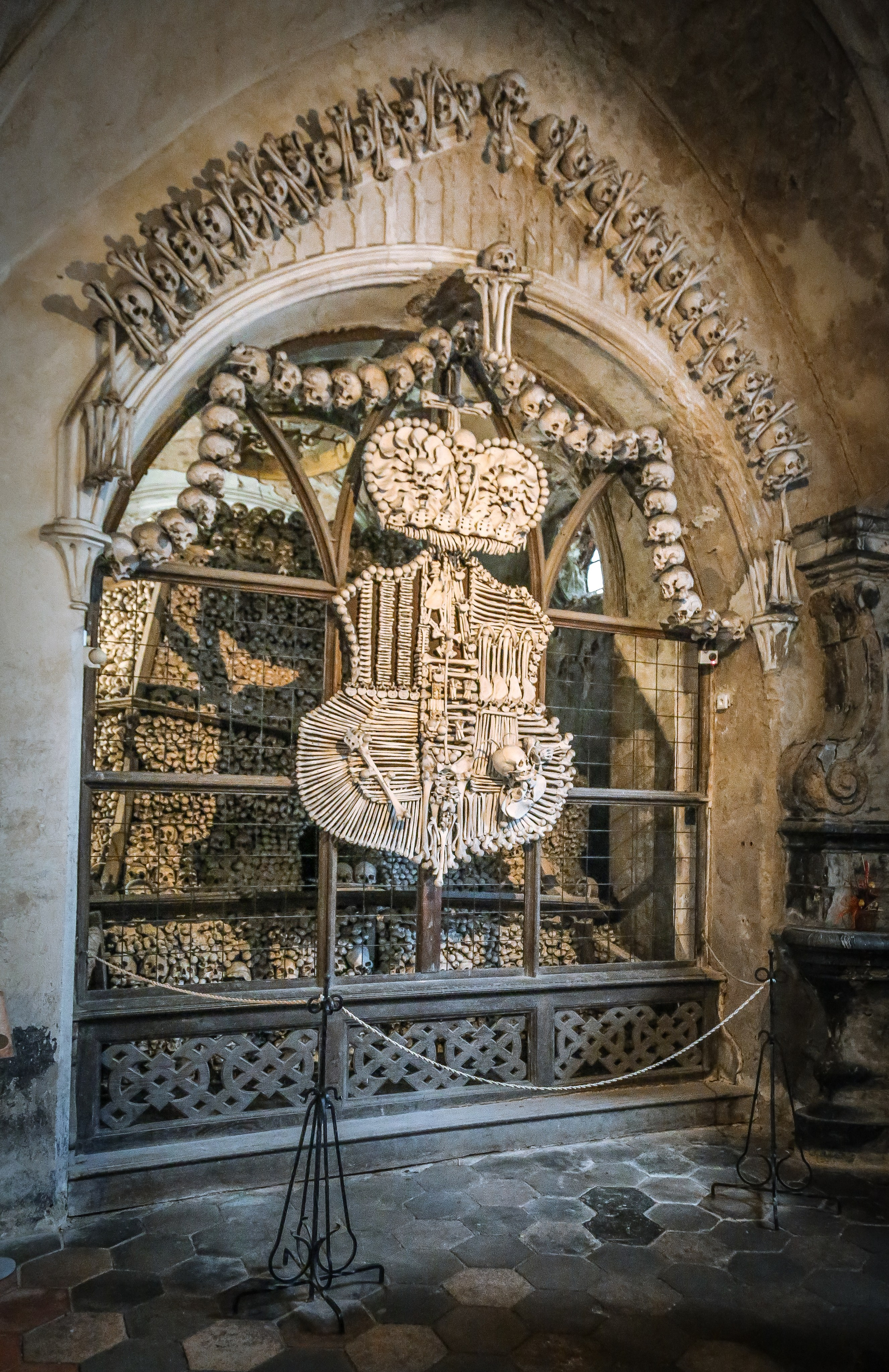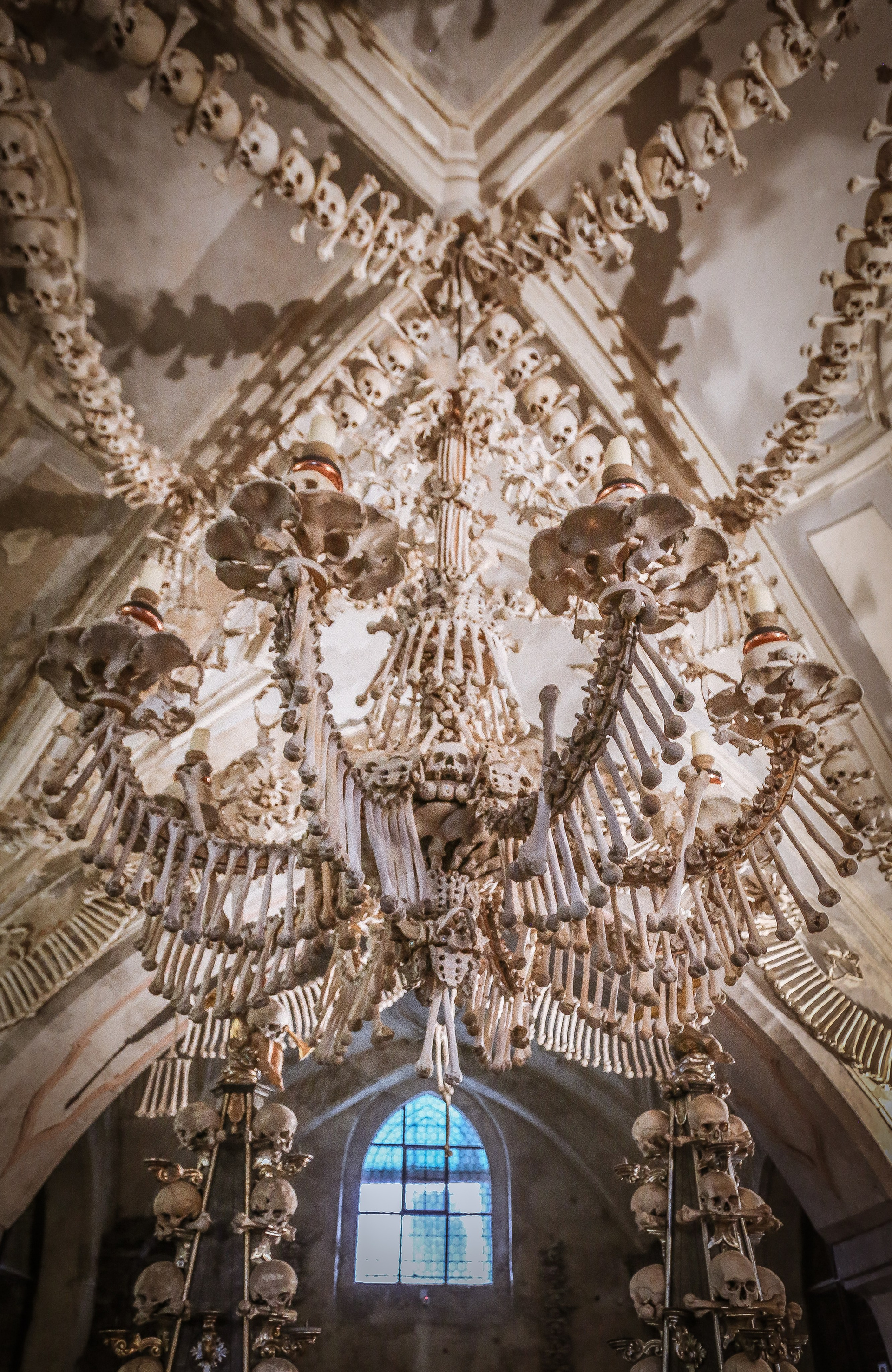 Подобная история произошла некогда и в Кутна-Горе. В конце 13-го века аббат Седлецкого монастыря Йиндржих привез с Голгофы немного святой земли и рассыпал по местному кладбищу. В те времена лучшей рекламы нельзя было и представить — тысячи людей желали быть там захороненными. Гуситские войны и эпидемии чумы также пополняли кладбище, так что с начала 15-го века пришлось выкапывать из могил старые скелеты, чтобы освободить место для новых захоронений. Извлеченные же кости складывали в усыпальнице готического собора, построенного посреди кладбища. Когда еще через триста лет монастырские земли и часовню купили князья Шварценберги, богатейший род Богемии, они наняли знаменитого резчика по дереву Франтишека Ринта, который и создал из «подручного материала» то, что мы видим сейчас: канделябры и дароносицы, люстру, составленную из всех костей человеческого скелета, и даже фамильный герб Шварценбергов с головой мертвого турка, которому ворон выклевывает глаза.