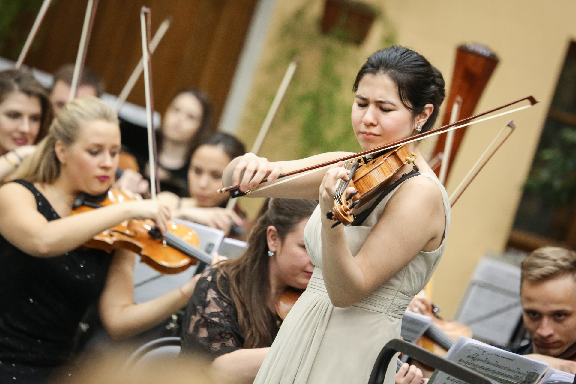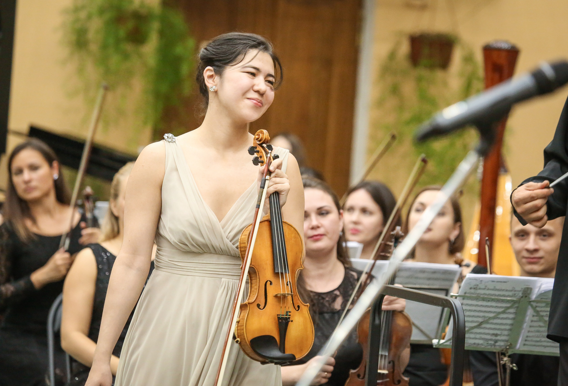 Оказалась в этой мужской компании и одна девушка-скрипачка — Галия Жарова. Или, может, правильнее сказать — кюйши, поскольку именно так в Казахстане именуют исполнителей традиционных инструментальных пьес под названием «кюй». Правда, обычно их играют на домбре или комузе, а у Галии инструмент более академический, и «Кюй» она исполняла симфонический, авторский, написанный композитором Мансуром Сагатовым, но сути дела это, по большому счету, не меняет.