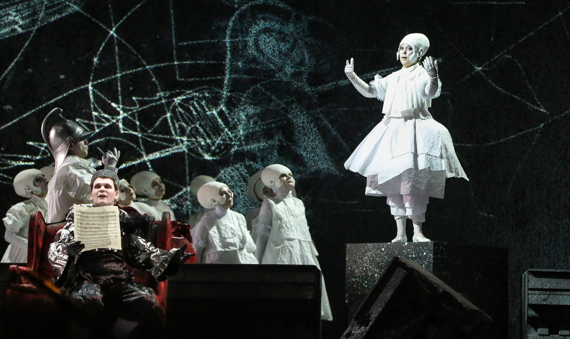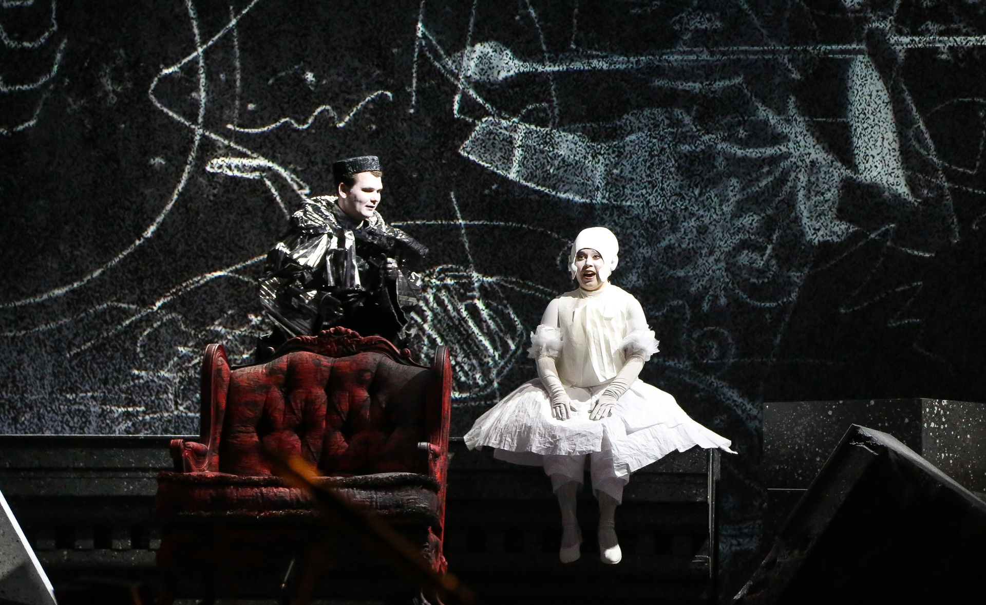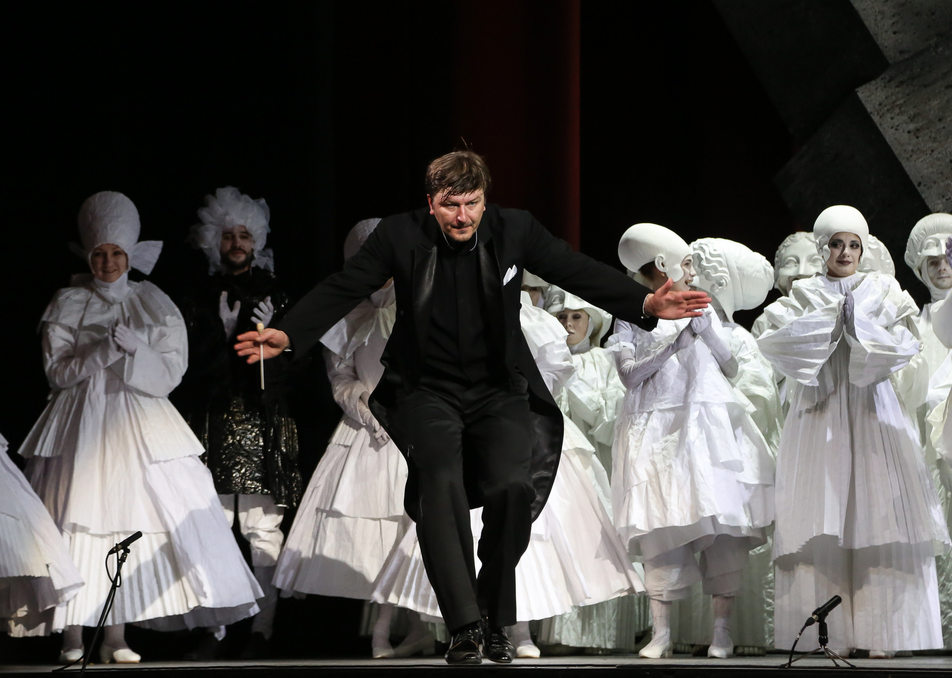Надо сказать, актерский состав этой постановки — настоящий дрим-тим. В первую очередь речь, конечно, о безусловной звезде — Виктории Яровой, обладательнице редкого колоратурного меццо, чей голос в первой части действия в соответствии с образом звучал очень прозрачно, а в партии же Дидоны преобразился в драматически насыщенный и глубокий. Ее кульминационный заключительный монолог и знаменитая ламентация «When I Am Laid in Earth», переходящая в прекрасный финальный хор, поражали своей выразительностью и силой скорби. Противоположен ей по характеру голос Ирины Костиной — очень светлый и легкий, в котором привлекает потрясающая подвижность и красивое вибрато. Достойнейше справился с партией Энея Илья Кузьмин! Безусловно, «Новая опера» богата хорошими баритонами, но даже на таком фоне Илья выделяется своим звучным и плотным тембром, который уже сам по себе является услаждением для слуха. Трио же Колдуньи и двух ведьм в исполнении Валерии Пфистер, Елены Митраковой и Ирины Ромишевской хоть и не казалось таким уж устрашающим, но выглядело и звучало очаровательно.