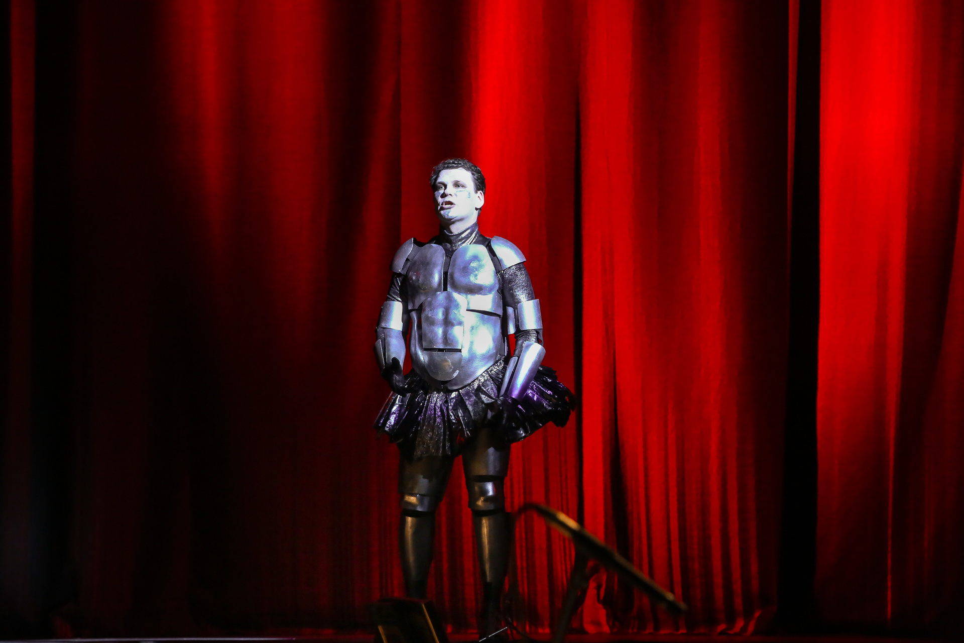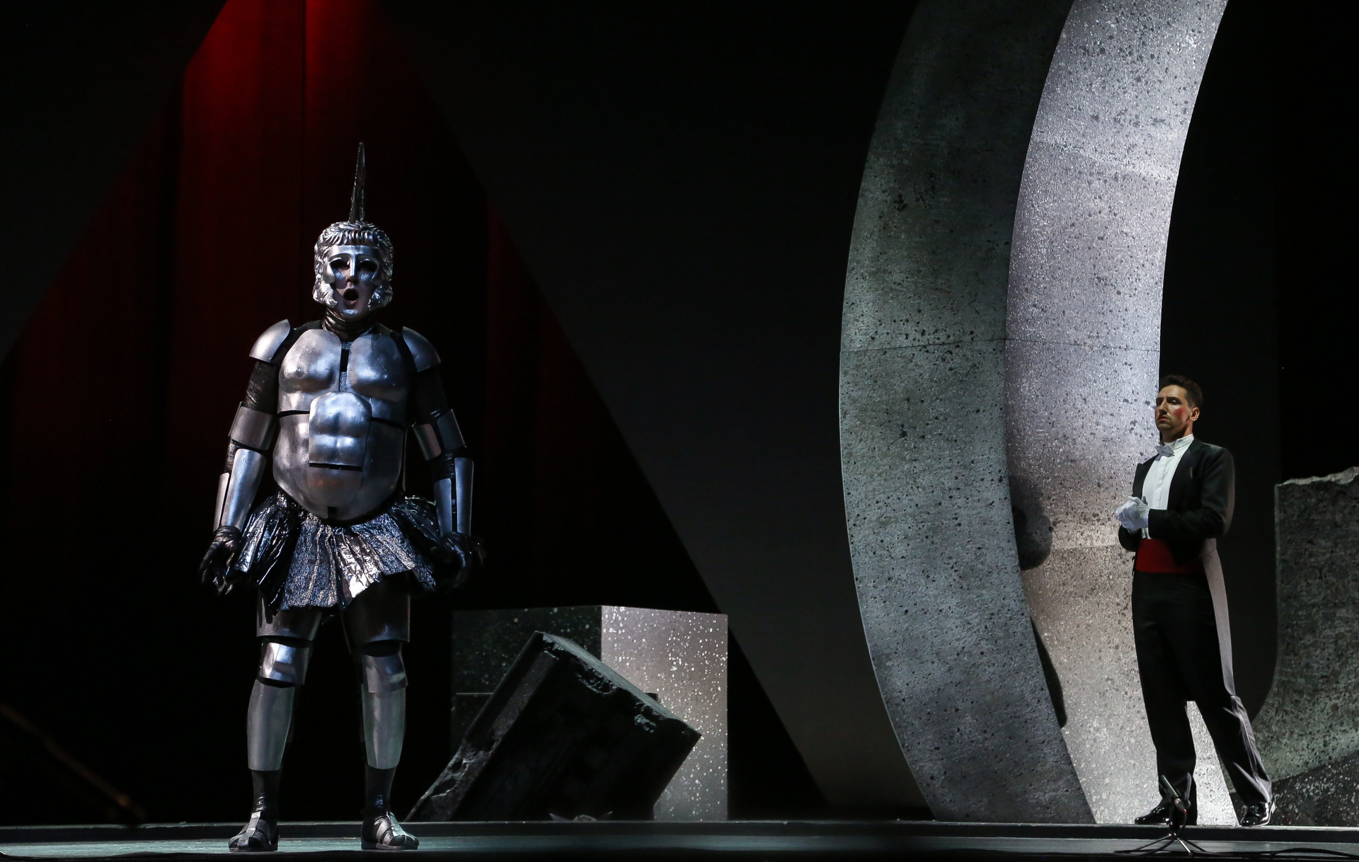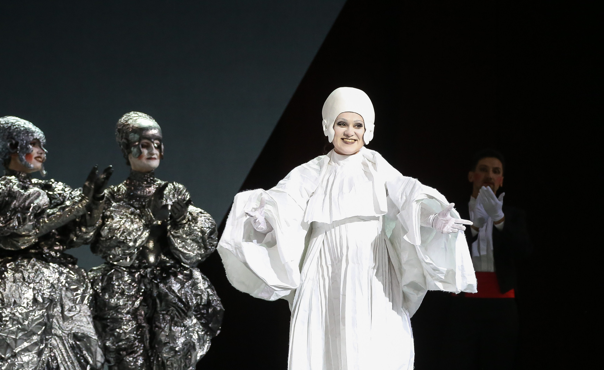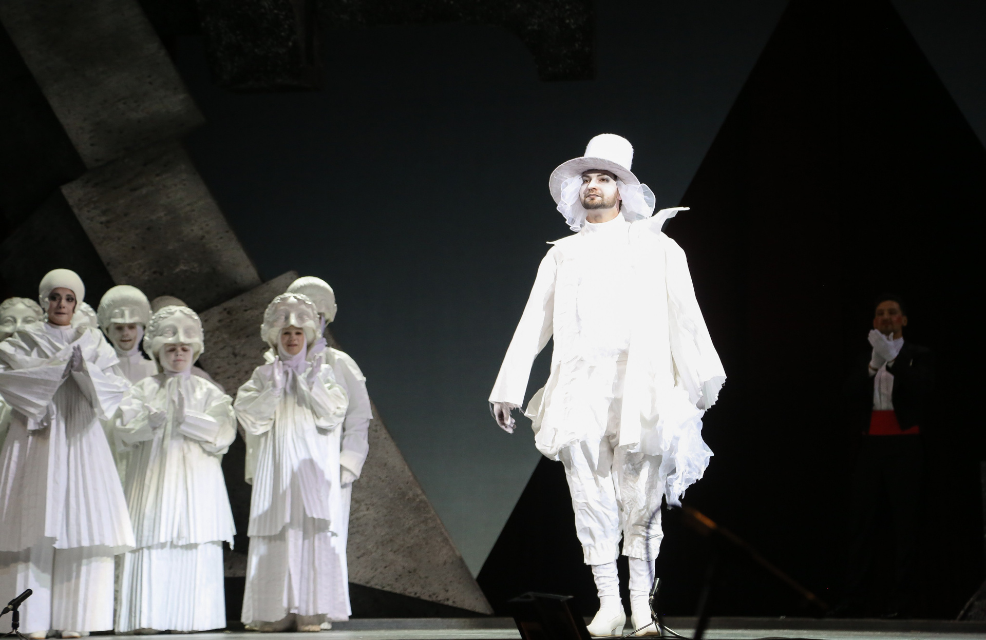 Отличная режиссерская находка — вставной номер в середине действия, ария Духа Холода (в оригинале — Гения Холода) из семи-оперы Пёрселла «Король Артур», которую активно включают в свой репертуар контратенора, хотя изначально она была написана для баса. Вот и в «DIDO», восстанавливая историческую справедливость, ее исключительно спел Евгений Ставинский — его стаккато в большой октаве звучало поистине леденяще!
