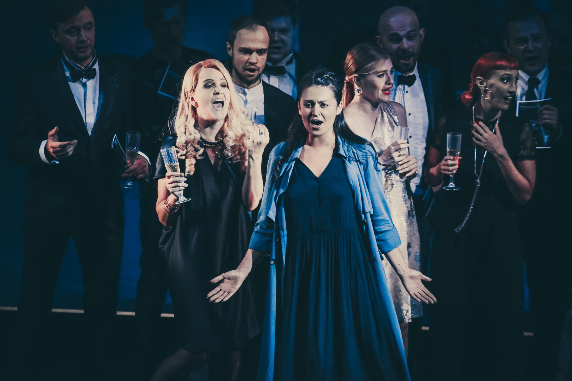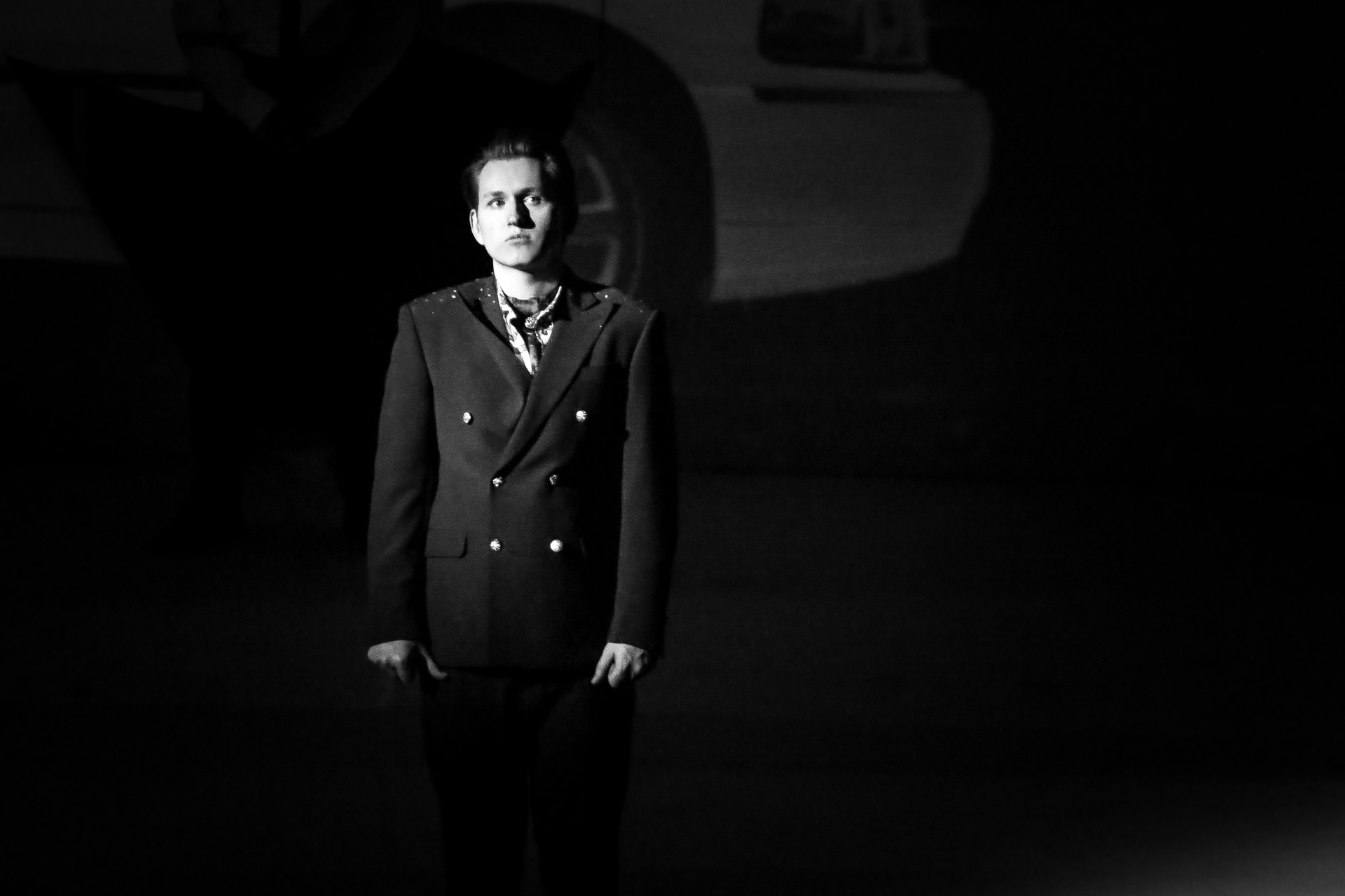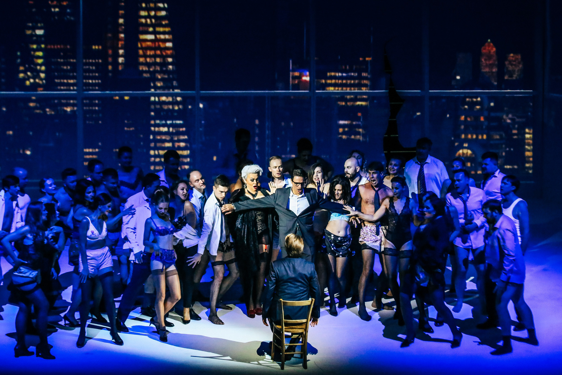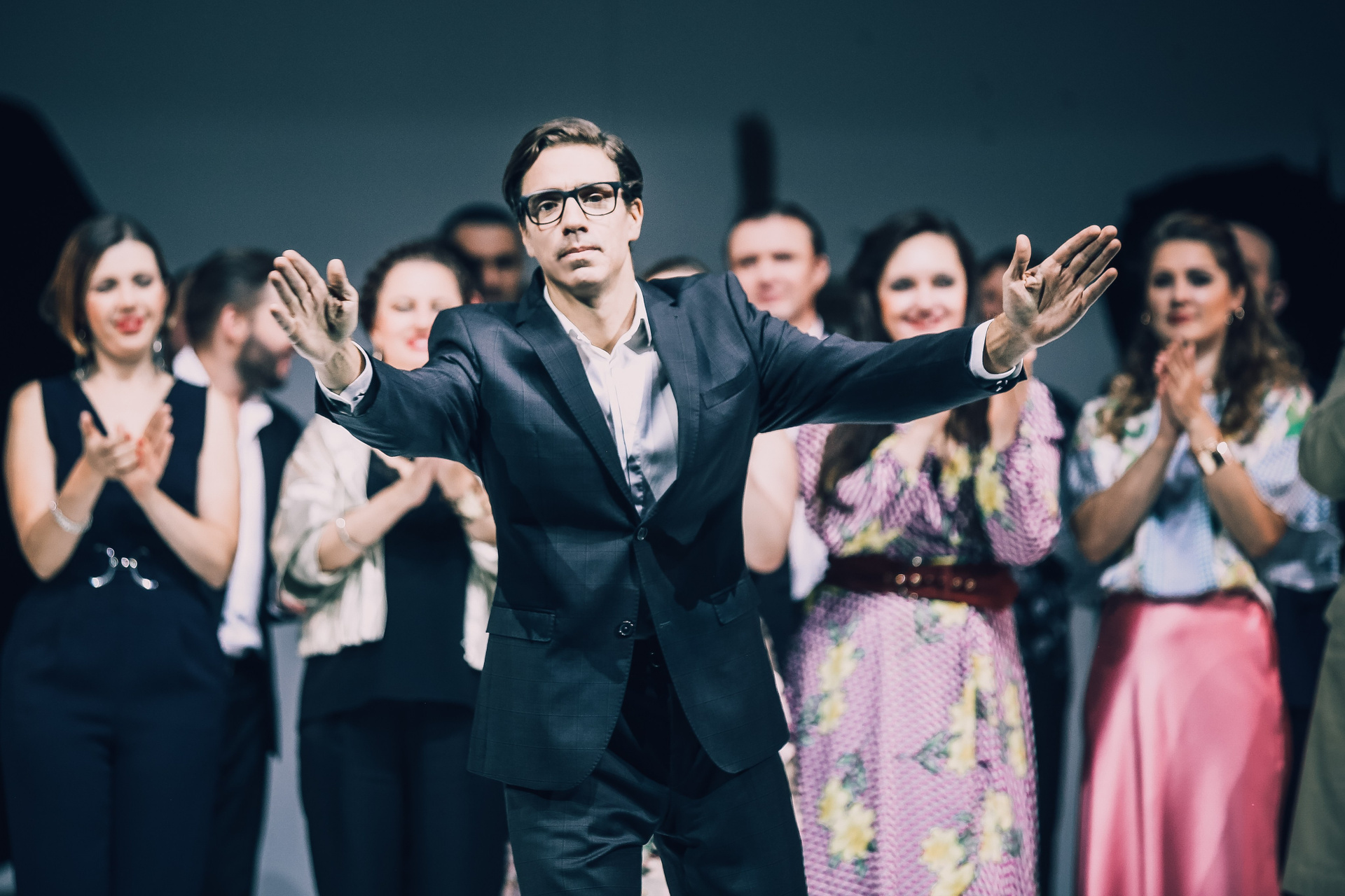 При всей изобретательности и виртуозности в использовании мультимедиа нет ощущения каких-то излишеств: сценографические приемы безусловно точны, и создатели дают музыке высказать всё, что нужно (особенно в последней душещипательной сцене), не вставая у нее на пути. А музыкальная сторона в МАМТе вышла впечатляющая. Молодой дирижер Тимур Зангиев с большим вкусом представлял эту многослойную партитуру — просто стилистический калейдоскоп, и вел оркестр очень ровно (порой даже слишком ровно, так что хотелось добавить пружинистости и куража), надежно поддерживал солистов, которые часто пели у него за спиной — на специально выстроенном помосте в зале, координировал работу хора — для коллектива, кстати, были придуманы динамичные мизансцены с индивидуальным рисунком роли каждого артиста (хореограф и режиссер возобновления — Леа Хаусман).