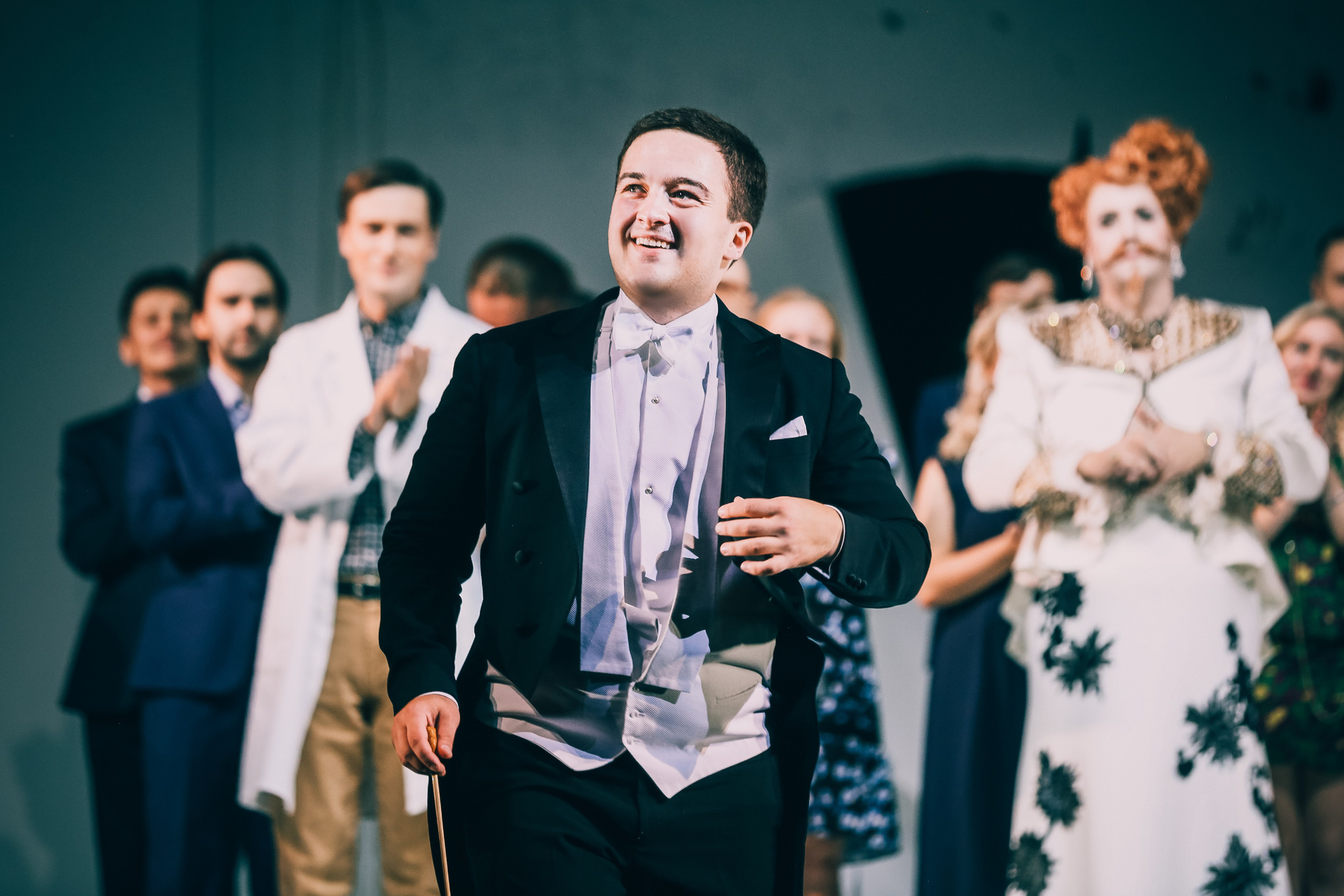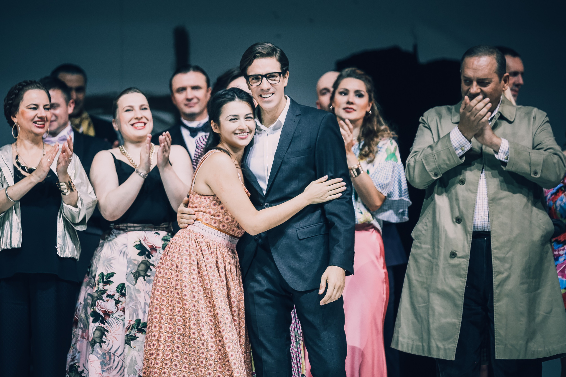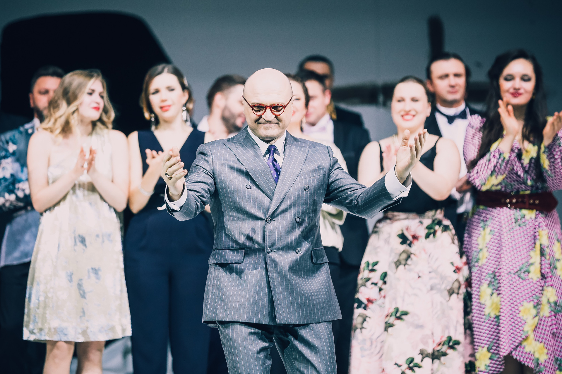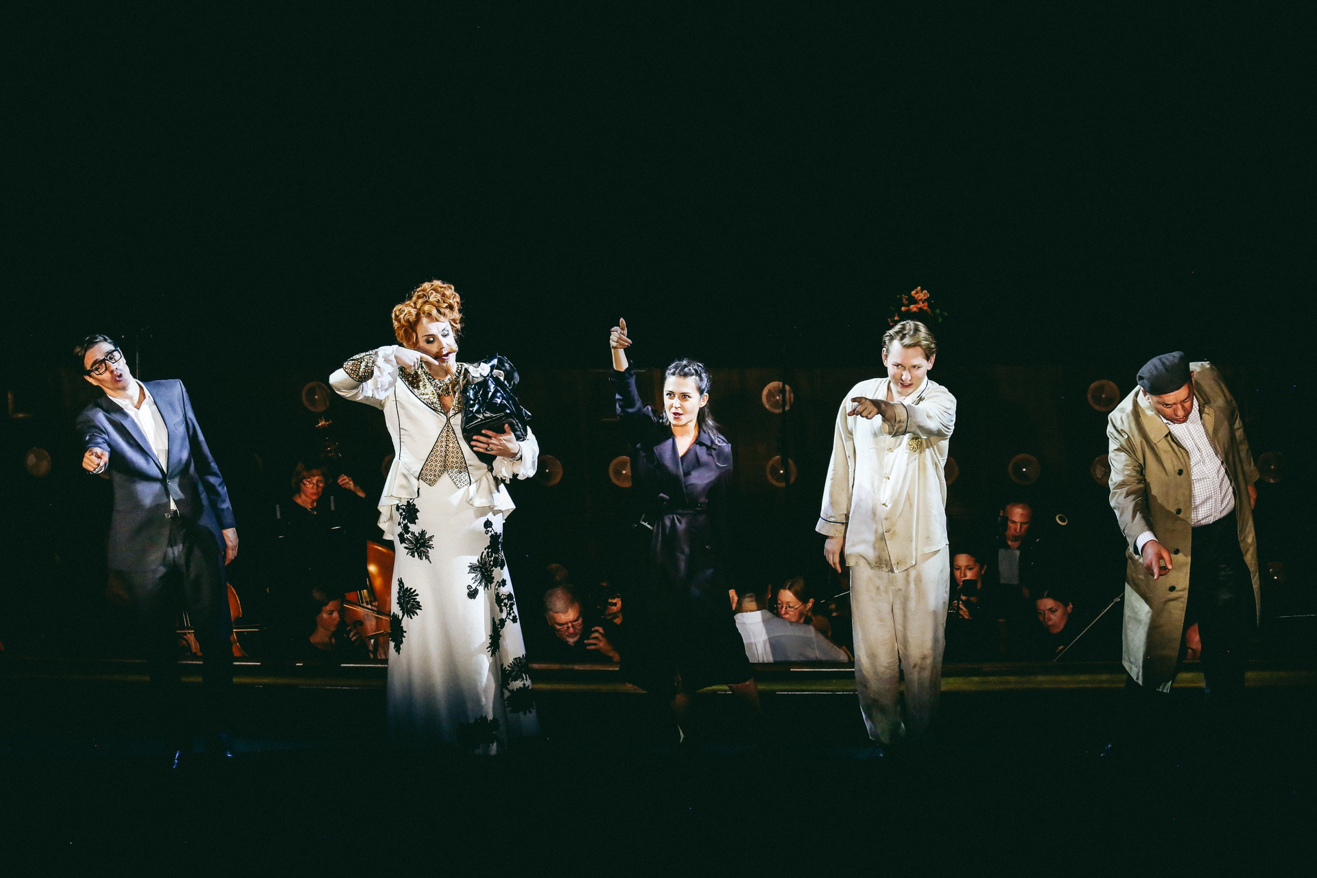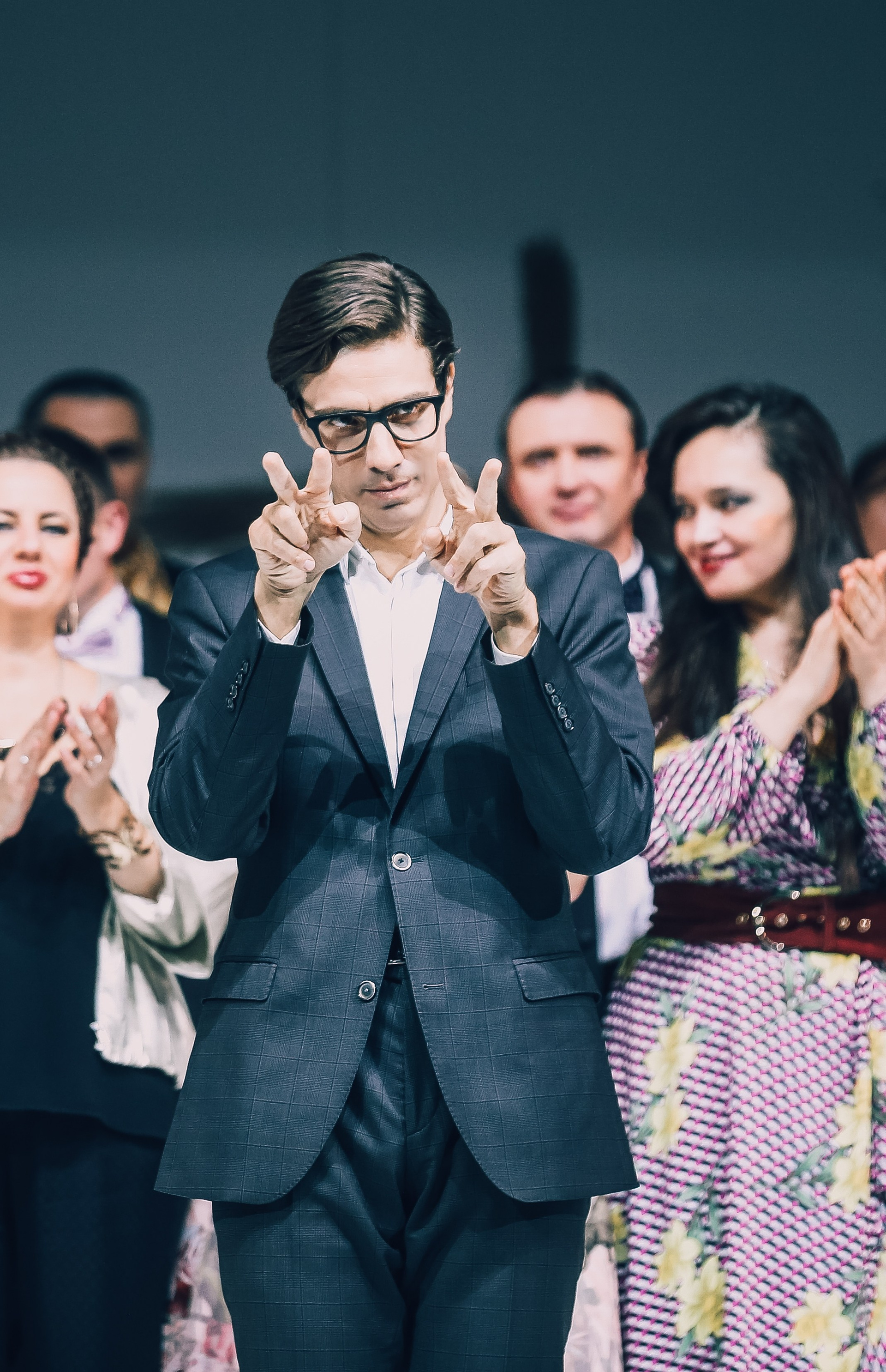 При всей изобретательности и виртуозности в использовании мультимедиа нет ощущения каких-то излишеств: сценографические приемы безусловно точны, и создатели дают музыке высказать всё, что нужно (особенно в последней душещипательной сцене), не вставая у нее на пути. А музыкальная сторона в МАМТе вышла впечатляющая. Молодой дирижер Тимур Зангиев с большим вкусом представлял эту многослойную партитуру — просто стилистический калейдоскоп, и вел оркестр очень ровно (порой даже слишком ровно, так что хотелось добавить пружинистости и куража), надежно поддерживал солистов, которые часто пели у него за спиной — на специально выстроенном помосте в зале, координировал работу хора — для коллектива, кстати, были придуманы динамичные мизансцены с индивидуальным рисунком роли каждого артиста (хореограф и режиссер возобновления — Леа Хаусман).