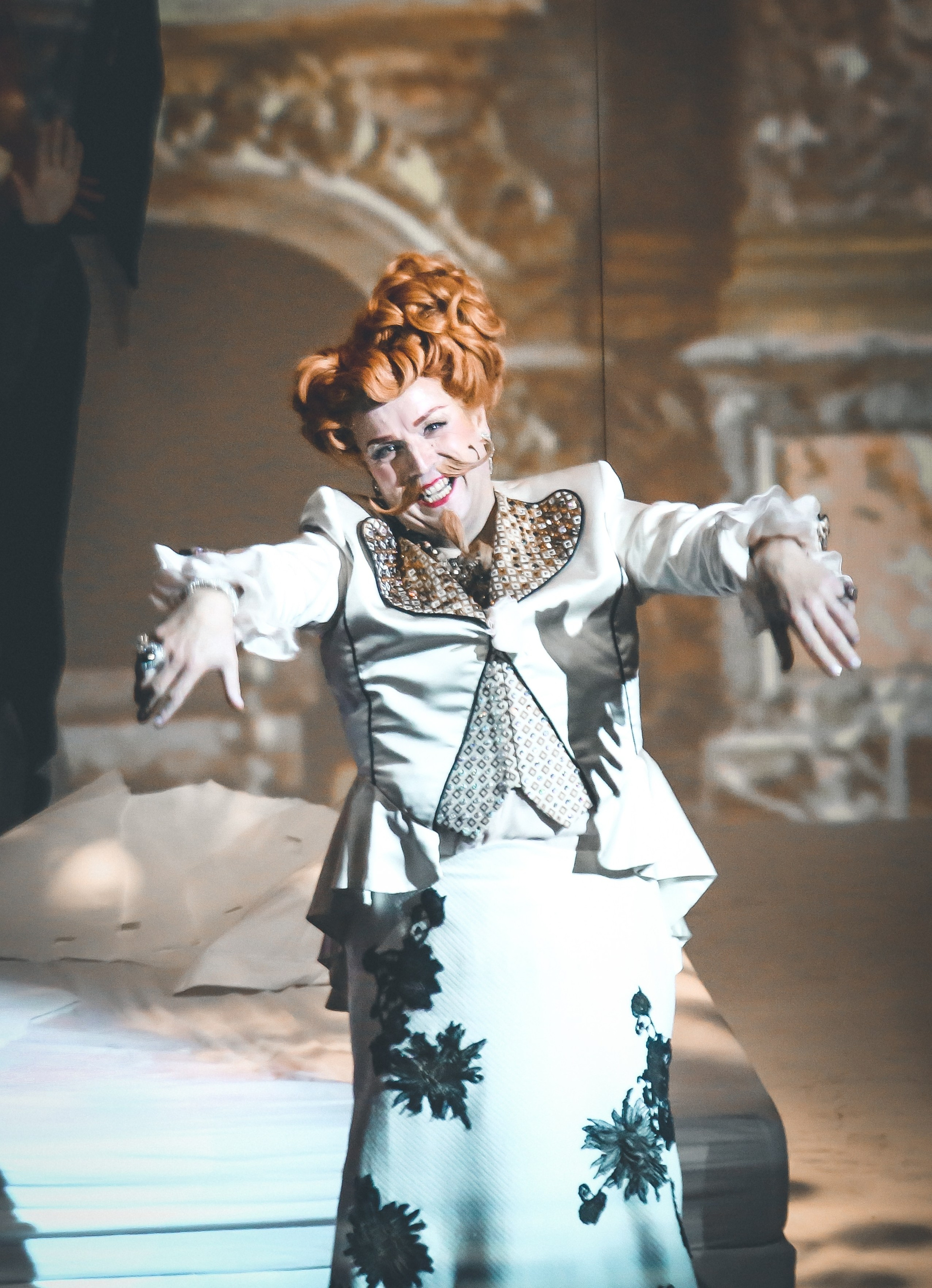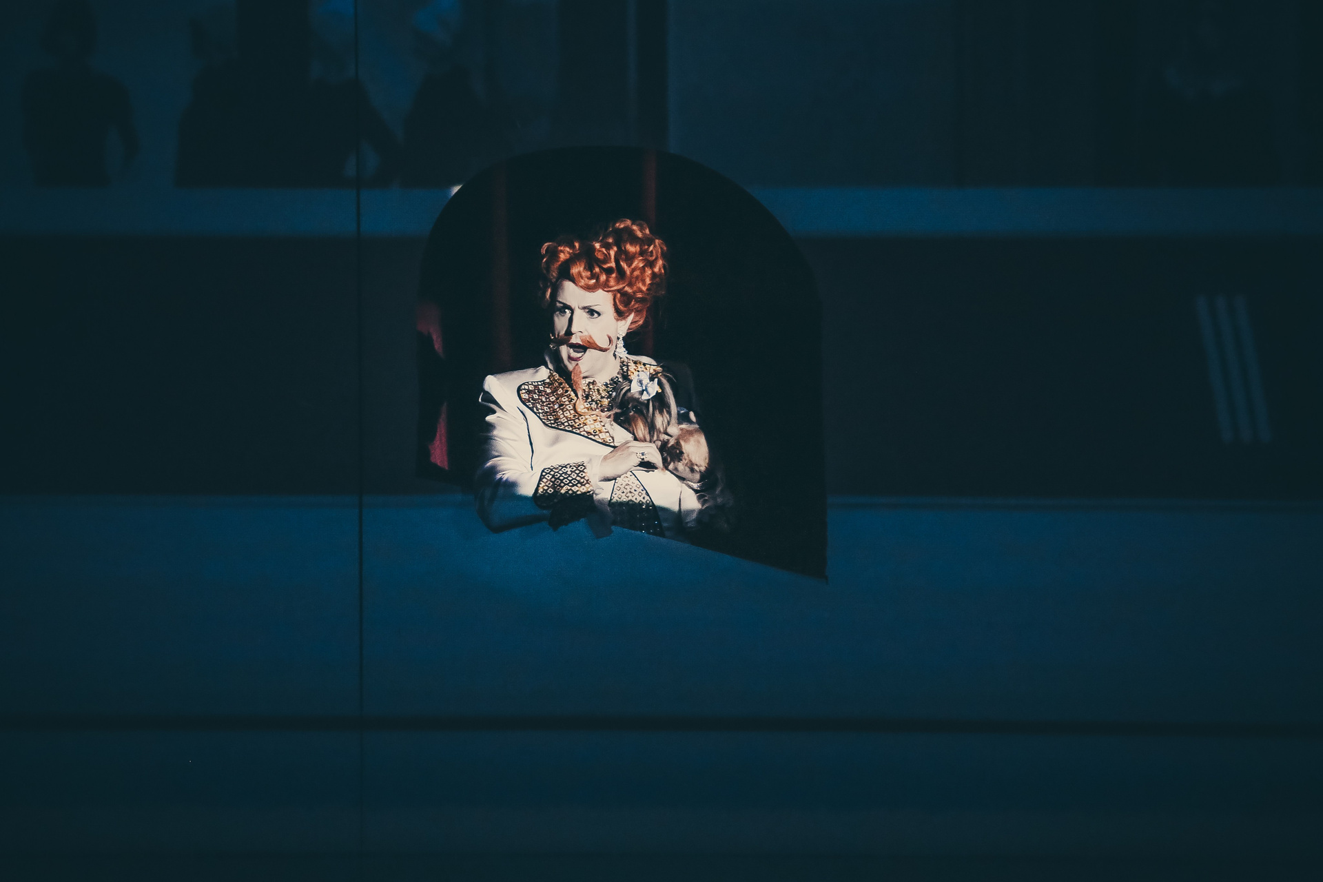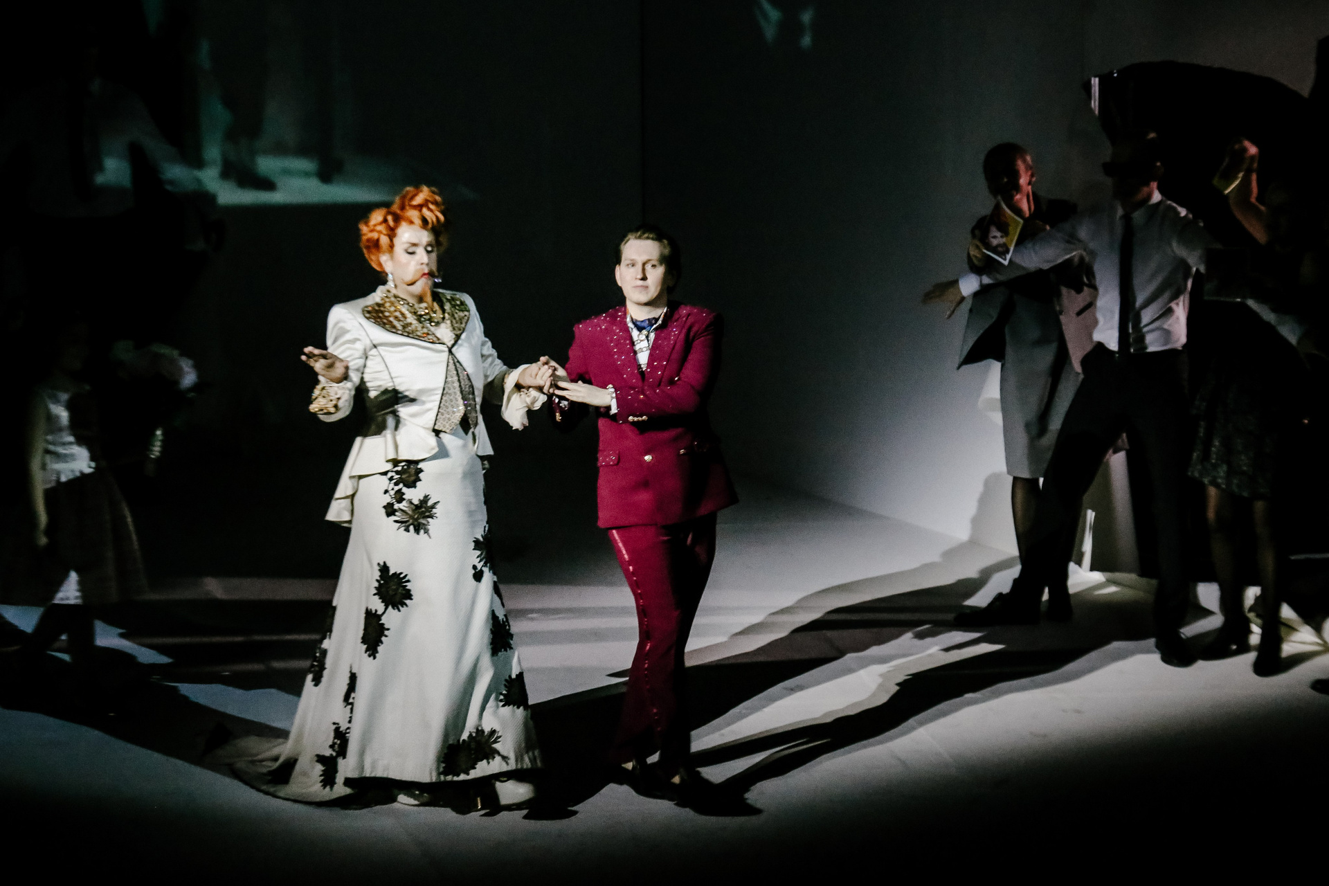 Ну и основная функция белого куба это экран для видеопроекций, которые тут не просто дань моде (редкая постановка сейчас без них обходится), а наиболее уместный и точный сценографический прием в условиях избранной эстетики. С его помощью режиссер провозглашает торжество тотально спекулированной картинки. Где пасторальный пейзаж, будто с полотен Гейнсборо, есть такая же хрупкая иллюзия (причем создаваемая проектором в руках дьявола-Шэдоу), как и небоскребы Сити, и виды лондонской подземки, и особняк Бабы-Турка в барочном стиле, и мрачное кладбище с вылезающими из могил зомби. Ничего настоящего — всё лишь фон для очередного постановочного кадра или селфи. Когда-то композитор Стравинский предложил обществу полюбоваться на себя в оперное зеркало, режиссер Макберни утверждает, что теперь это «черное зеркало» — экран смартфона. Хотя по большому счету история неизменна и вневременна, потому нет никакой разницы между 18-м веком, 50-ми годами прошлого столетия и сегодняшним днем — все темы и мемы как нельзя более актуальны: показной успех, оргии (причем на фоне светской хроники разврат в изображении Макберни кажется чуть ли не образцом умеренности), бородатая женщина, очередное фейковое чудо-устройство (машина, якобы превращающая камни в хлеб), скандальная свадьба (совпадение с информационным контекстом — нарочно не придумаешь!).