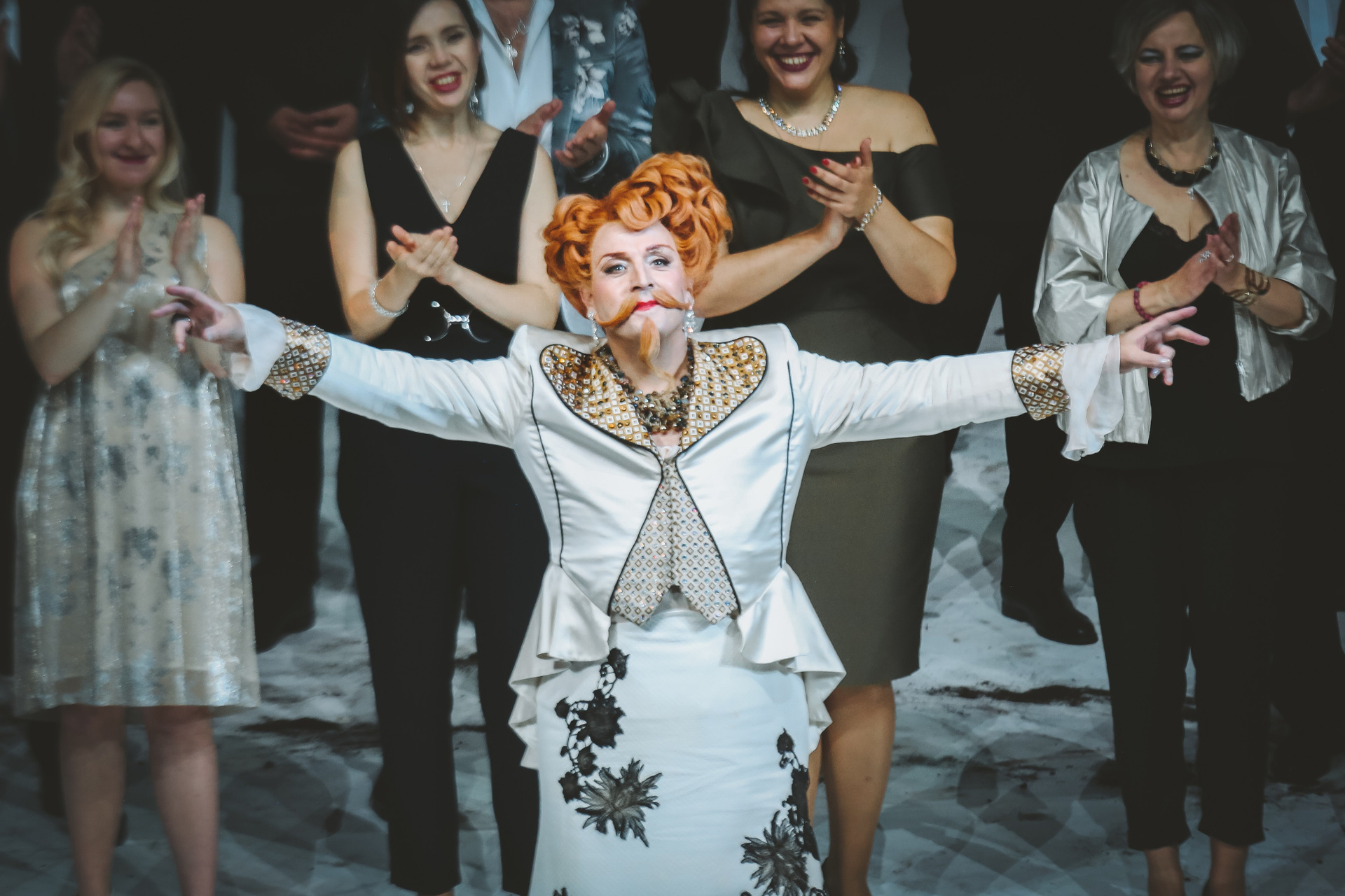 Вообще этот спектакль является ярким примером того, как формула «зарубежная постановка плюс собственная музыкальная команда» доказывает свою состоятельность. Состав получился беспроигрышный и радовал даже больше, чем первоначальный каст на записи из Экса. Из зарубежных вокалистов в Москву приехал только Эндрю Уоттс, исполнивший экстравагантную роль Бабы-Турка (двойственная природа персонажа подчеркивалась тем, что вопреки предписаниям Стравинского, отдавшего эту партию меццо, она была спета контратенором). Остальные артисты все наши, отечественные — органичное сообщество солистов, в котором каждый оказался на своем месте, а ведь петь эту музыку чрезвычайно непросто, даже несмотря на связь с классической традицией. Тем ценнее, что получился настолько крепкий ансамбль вплоть до маленьких ролей — основательно прозвучали и Михаил Головушкин (надзиратель в сумасшедшем доме, он же играл двойника Ника Шэдоу), и Валерий Микицкий (аукционщик Селлем), и Роман Улыбин (папаша Трулав), с озорством сыграла Матушку-Гусыню, хозяйку борделя, меццо Оксана Корниевская. Баритон Дмитрий Зуев в партии Шэдоу внушителен и вкрадчив — эдакий менеджер по ловле душ, «white collar devil».