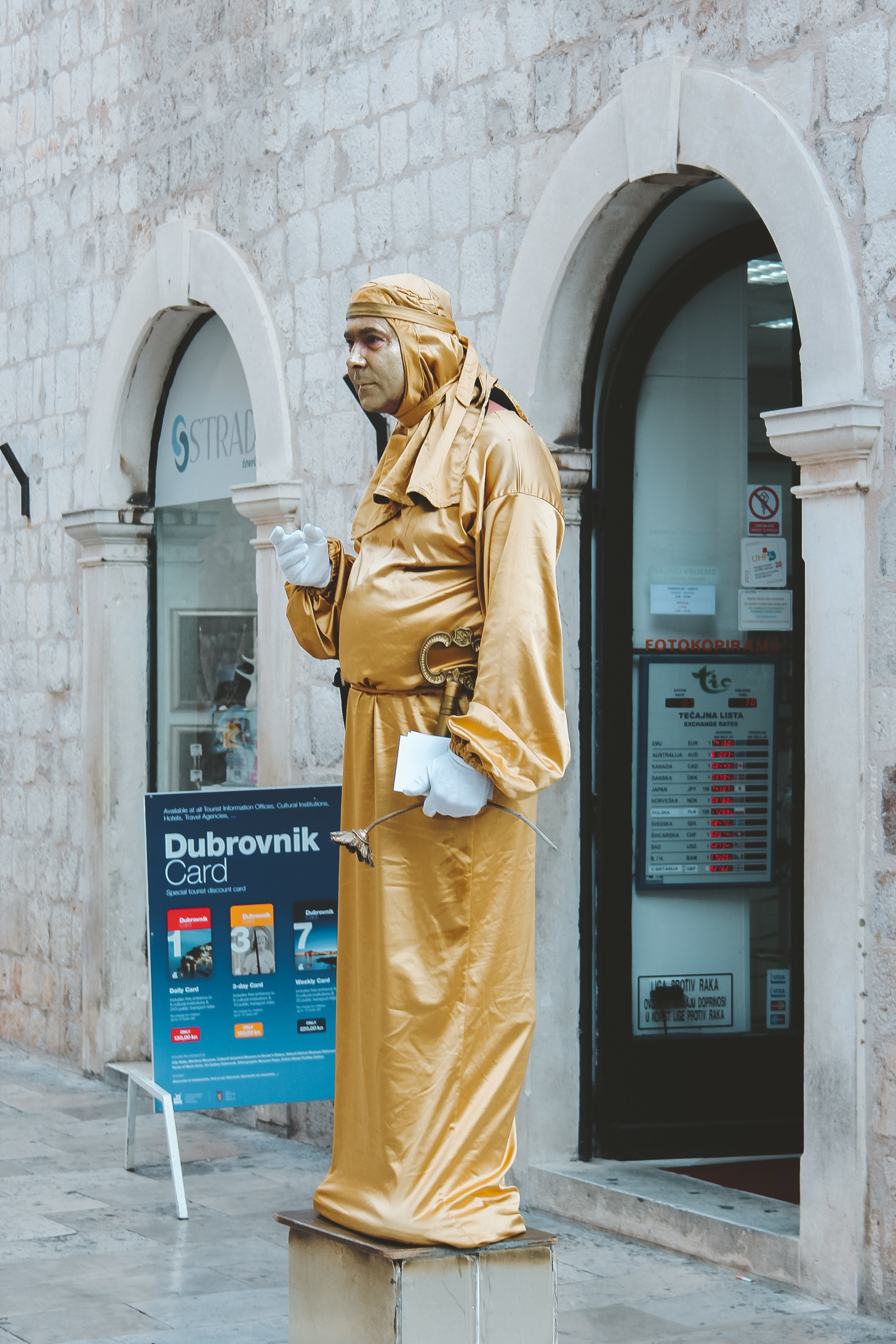 Но пока я любовалась внутренним убранством, снаружи явно что-то происходило: на выходе из дворца меня встретили… звуки «Маленькой ночной серенады» Моцарта. А все дело в том, что практически на пороге расположилось инструментальное трио, радовавшее горожан и туристов исполнением знаменитых произведений великого австрийца — ну прямо Зальцбург! Но долго наслаждаться музыкой не получилось, потому что действие развивалось стремительно: именно в этот момент началась смена городского караула — под барабанный бой по Страдуну прошли трое (опять трио!) молодцов в исторических костюмах. И пока я бегала с фотоаппаратом за городской стражей на другом конце улицы — у фонтана, где мы уже были, появился еще один интересный персонаж: я так и не выяснила, кто же он и что символизирует, просто товарищ был весь в желтом и сам при этом желтый, да еще и с золотым цветком в руках! От такой монохромности я впала в легкий ступор и решила, что лучше я уж пойду смотреть монументы каменные и бронзовые, чем передо мной тут живой человек будет изображать золотой памятник…