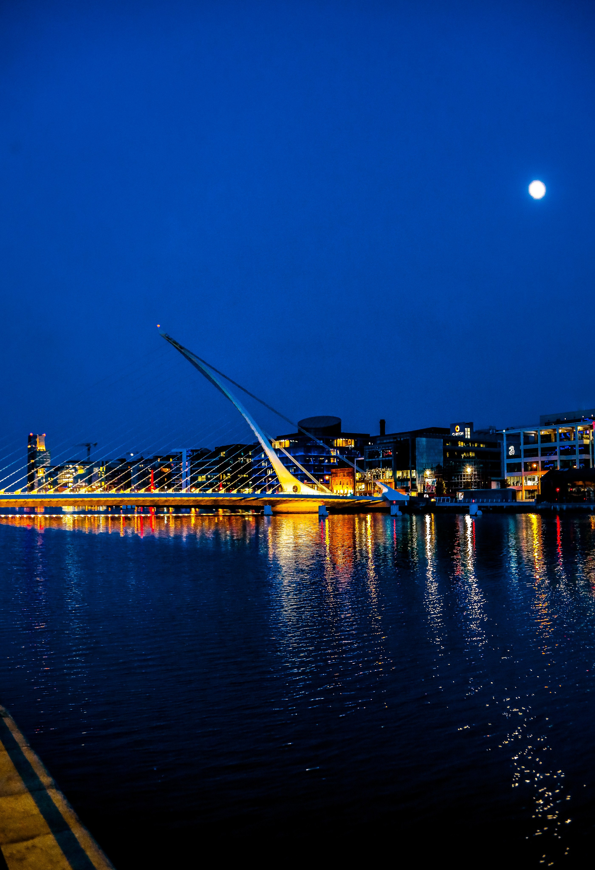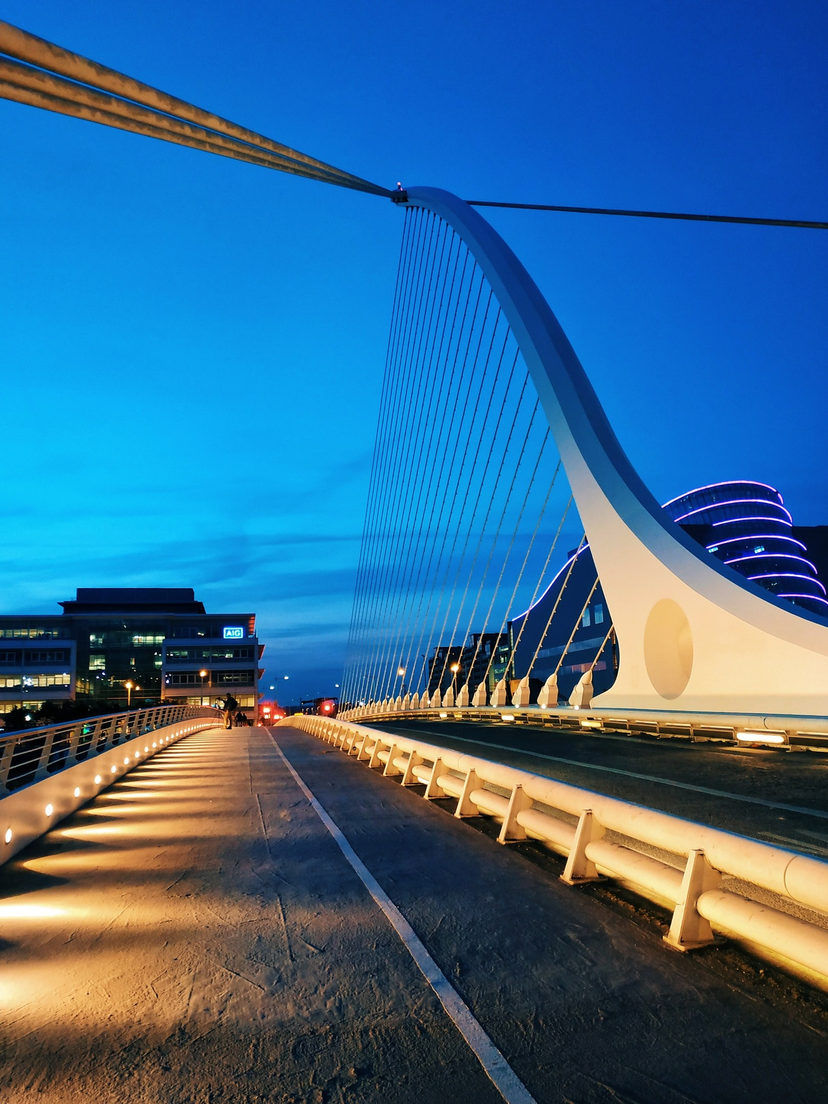 Испанский архитектор Сантьяго Калатрава спроектировал для Дублина два грациозных белоснежных моста имени великих писателей. Выше по течению лежит мост Джойса, а эта «кельтская арфа» посвящена Сэмюэлу Беккету, хоть и не совсем понятно, почему именно — он, конечно, великий писатель (правда, насколько ирландский, настолько же и французский), но все-таки какая связь?
