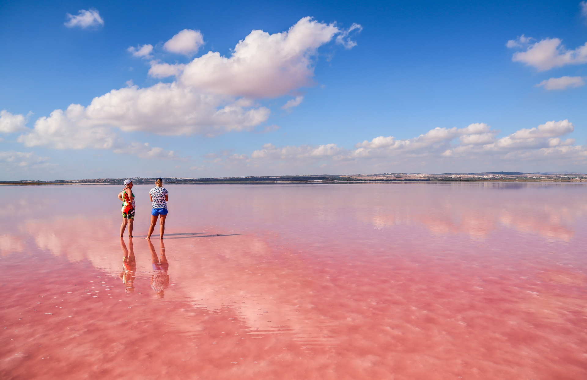 Прежде я думала, читая о красных озерах Канады и Австралии, что это как минимум художественное преувеличение, метафора такая. Оказывается — ничего подобного, всё правда, и более того — подобное чудо света существует также на европейском континенте. Возле валенсийского города Торревьеха аж два необычных соленых озера («салинас», как там говорят) — Изумрудное и Розовое. На Изумрудном, куда мы не доехали, живут розовые фламинго (однако, какие умники — выбрали то, что контрастнее), а на Розовом и без них живописно. Но обитают в нем лишь микроорганизмы-экстремалы — полезная водоросль с чудесным женским именем Дуналиелла, а также древнейшие на планете одноклеточные — археи, которые встречаются в суперсоленых озерах и горячих вулканических источниках, в общем, приспособлены к суровым условиям и глобальным катаклизмам. Все умрут, археи останутся. Именно они и окрашивают озеро в розовый цвет. Чем выше солнце, тем багровее вода. Она кусачая, неприятная — на коже остается плохо смываемая маслянистая пленка, застывший соляной налет, похожий на снег, впивается в ступни. Но находиться в воде полезно, дышать ионизированным озерным воздухом еще полезнее, да и глаз радуется открывающейся картине! За одно это великолепие можно, пожалуй, простить многие испанские нелепости и несуразности… Но о них позже, нынче время прекрасного.