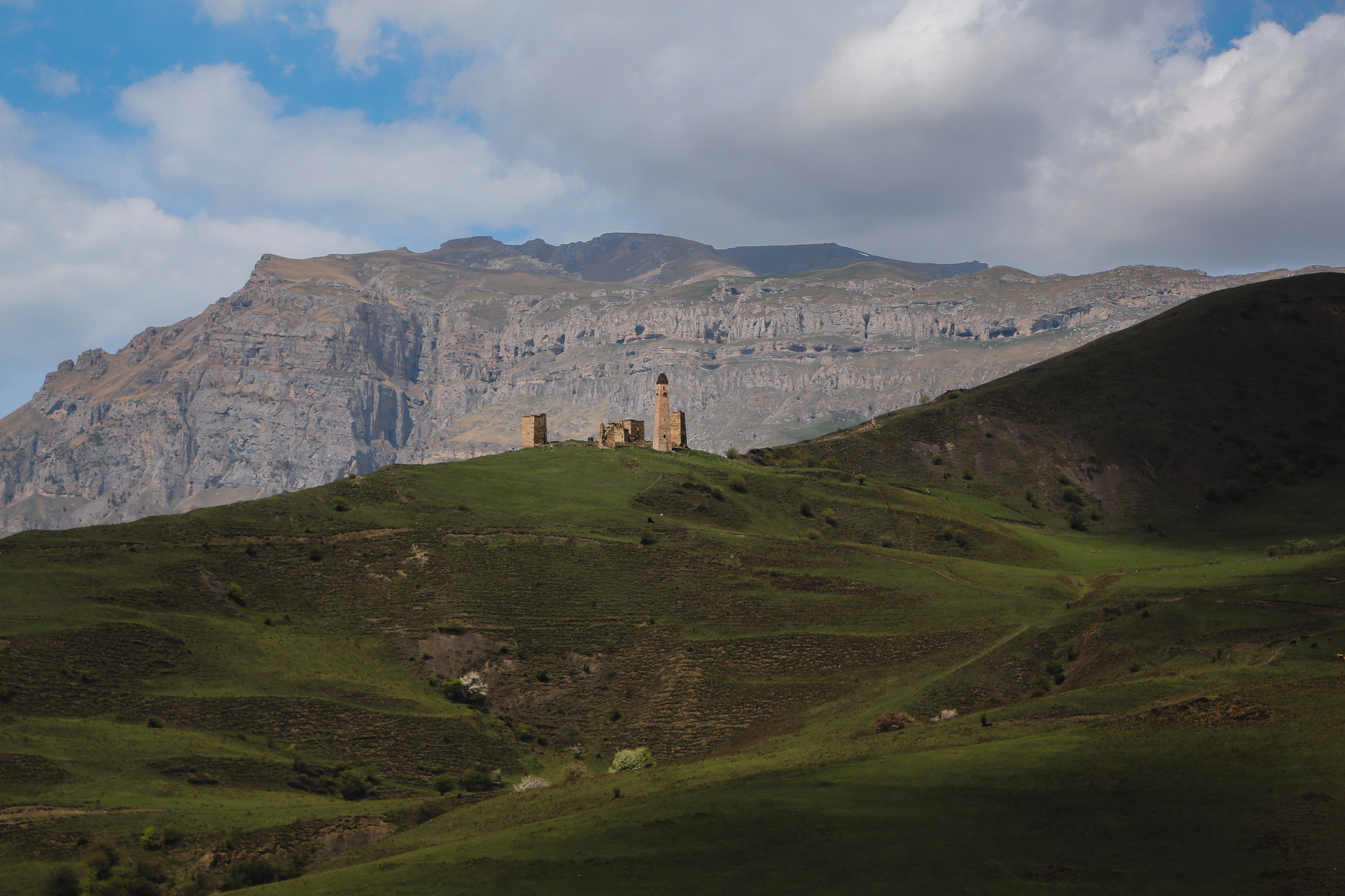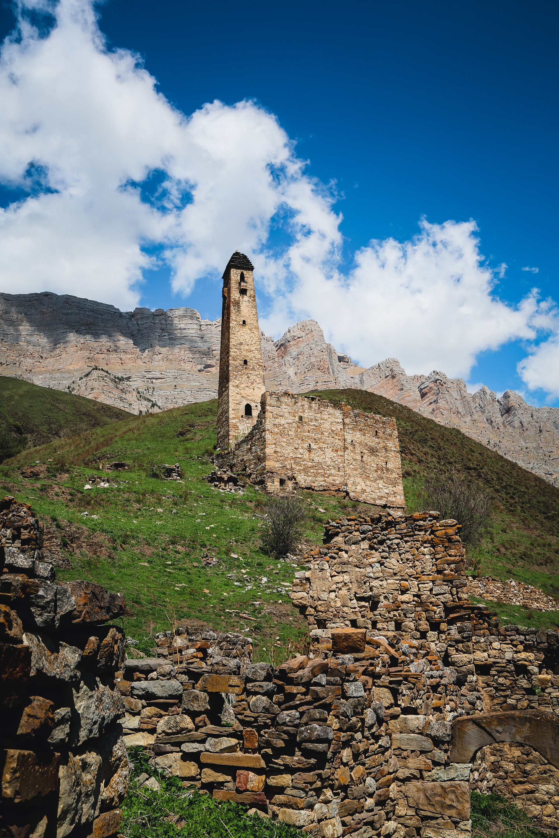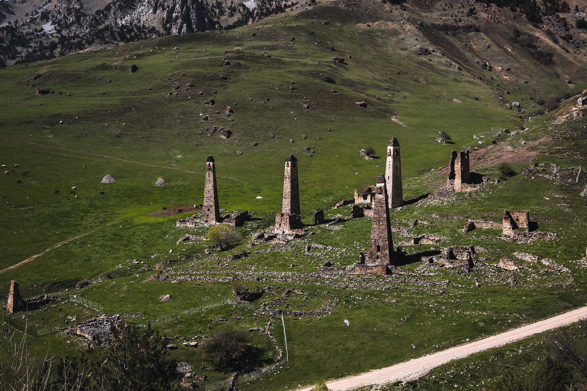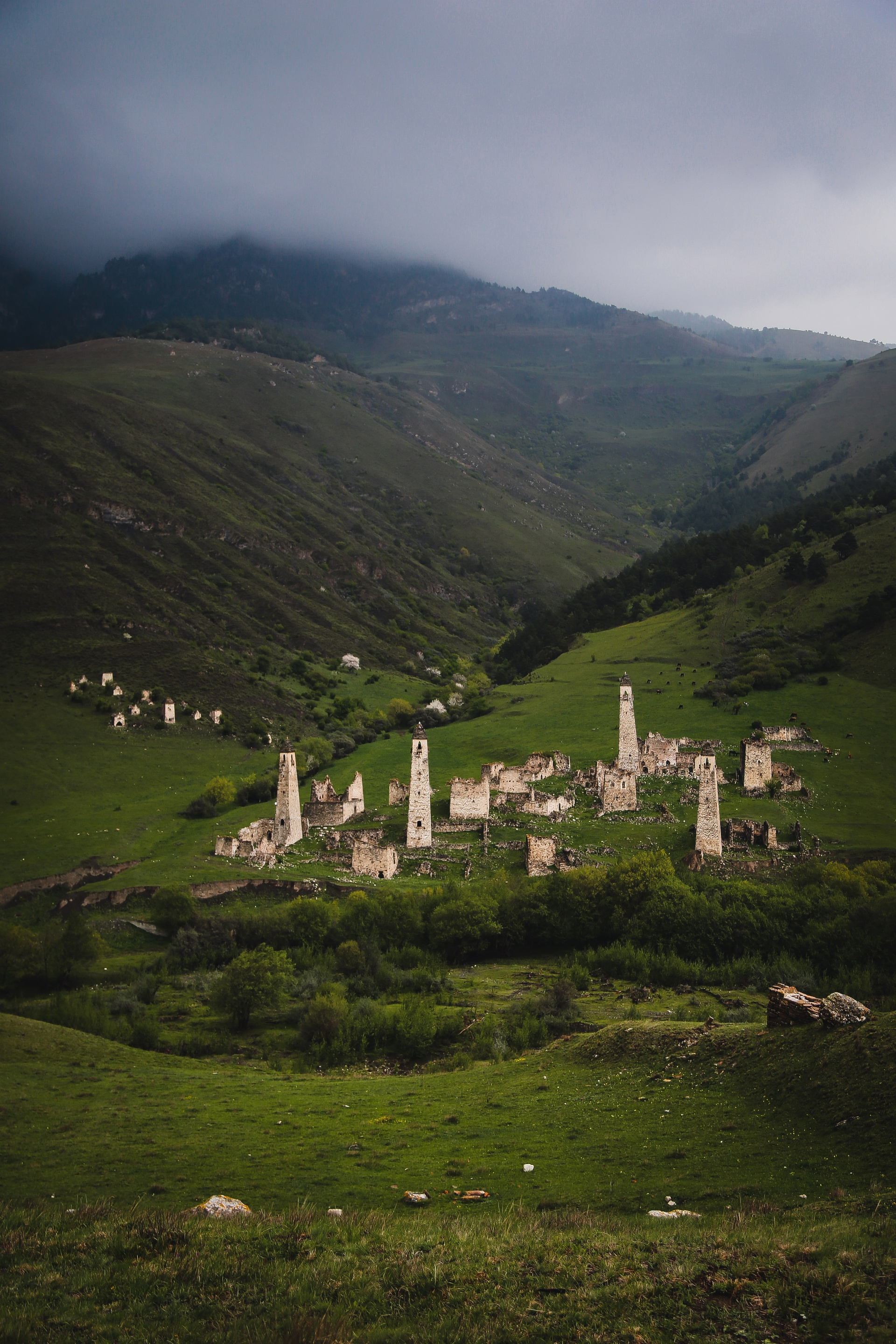 Вообще, территория заповедника огромна — 640 квадратных километров, на которых находится почти полтысячи башенных комплексов; объехать все, наверное, невозможно, однако самые знаменитые мы изучили достаточно подробно — Таргим, Хамхи, древний покинутый город Эгикхал, комплекс Эрзи, что значит «Орел», замковый комплекс Цори, боевые Вовнушки, без фундамента, будто вырастающие из скал.