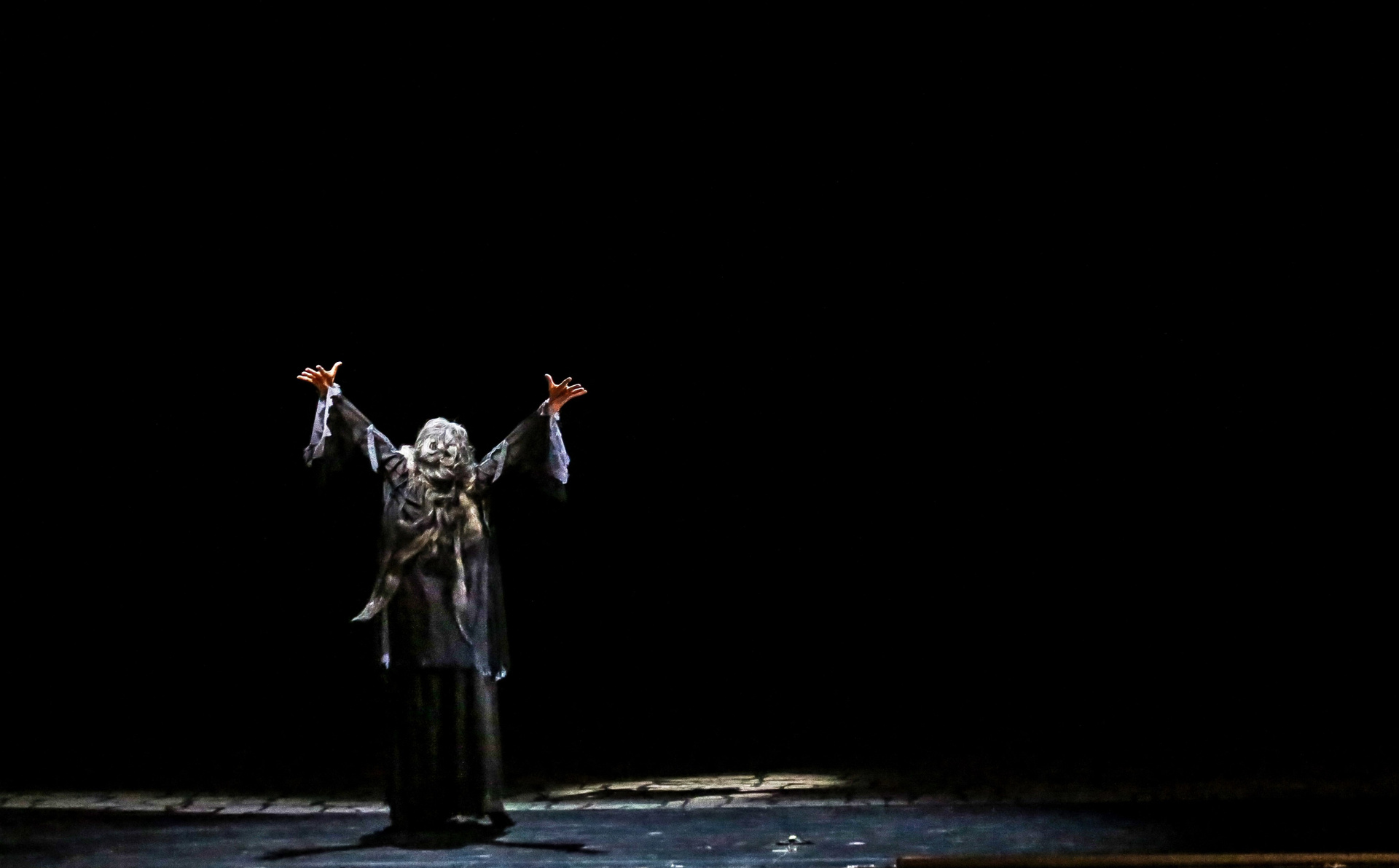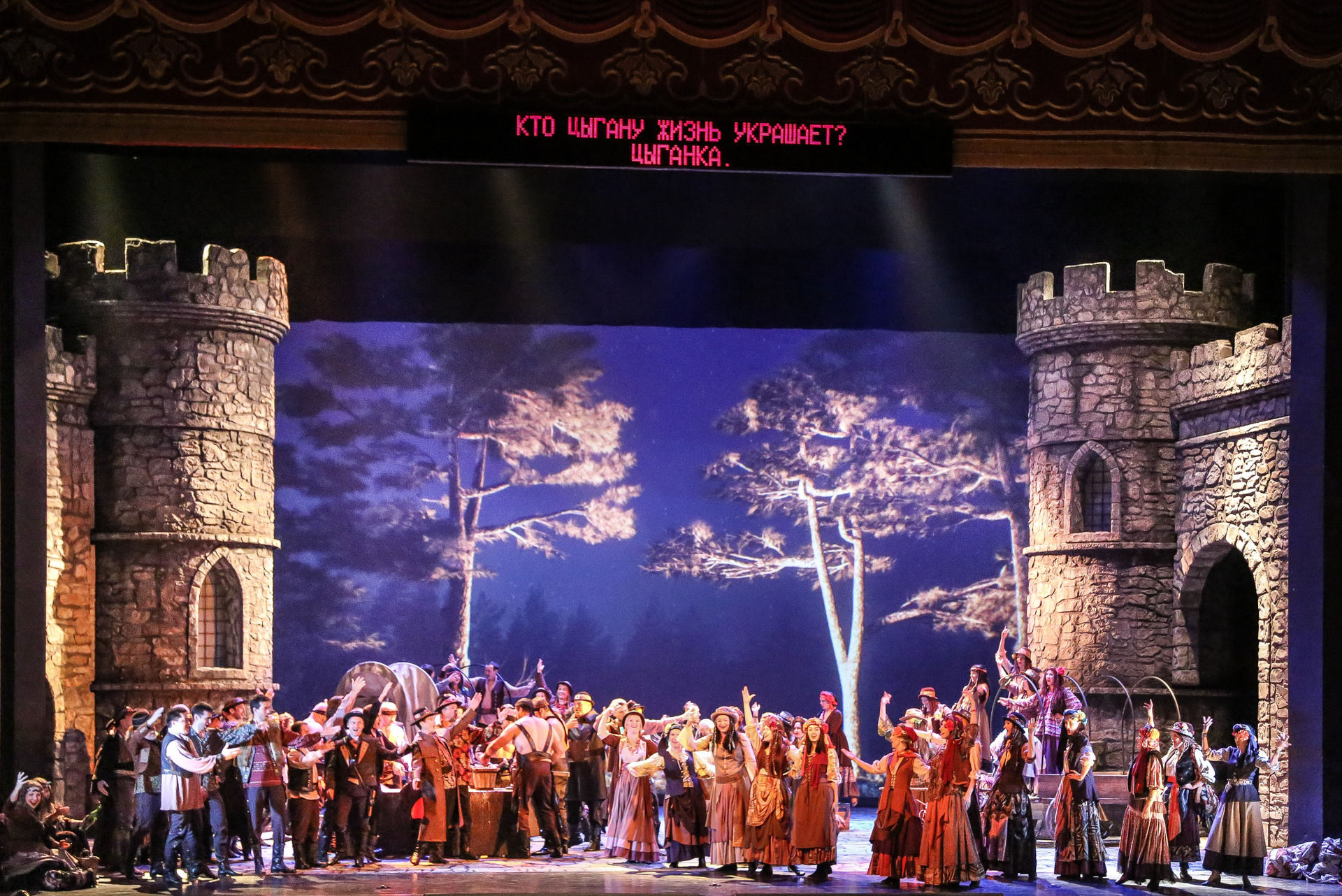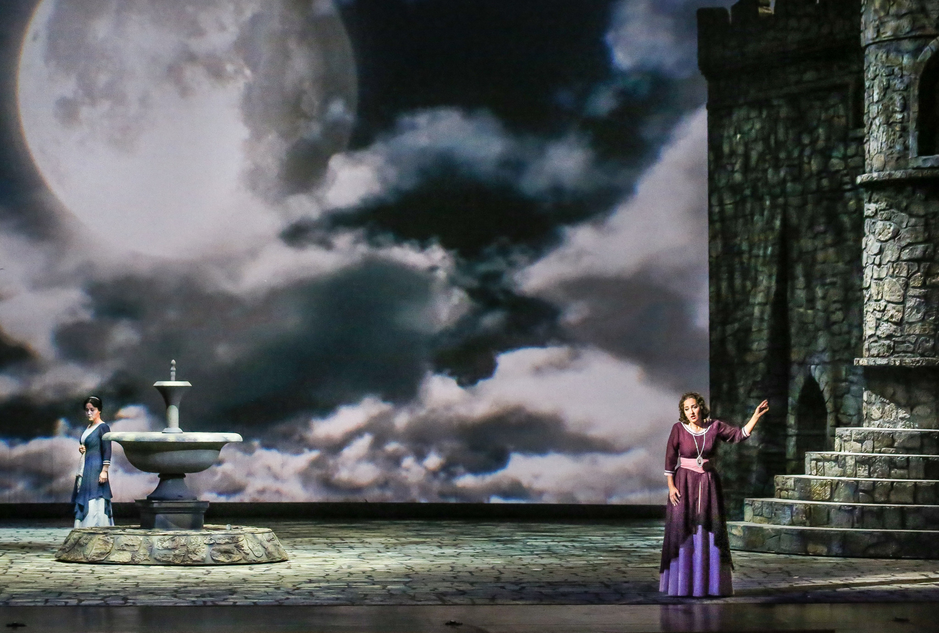 И хоть по задумке создателей спектакля действие переносится из Средневековья в период конца XIX — начала XX века (как более приближенный к слушателям), в сценографии и костюмах, разработанных художниками Виктором Герасименко и Викторией Хархалуп, фактически не содержалось никаких маркеров конкретной эпохи. Сценическое пространство было решено в виде двух башен (которые, по всей видимости, символизировали противоборство двух миров — насилия и свободы, аристократов и цыган), а действие происходило в замкнутом между ними зеркале сцены, трансформировавшемся то в сад Леоноры, то в цыганский табор, монастырь и замок Кастеллор. Правда, оформление получилось достаточно лаконичным, так что оживлять атмосферу, создавать ощущение объема и воздуха был призван экран-задник с компьютерными видеопроекциями, созданными Даниилом Герасименко, — сосновыми рощами, лунными пейзажами и кроваво-мрачными небесами. И дополнительно он использовался для флешбэков — как, например, во время арии Азучены «Stride la vampa», когда она рассказывает о казни своей матери, и ее история одновременно визуализируется на экране. В целом, заявленный «перенос действия» вышел достаточно условным (правда, и сама драма Гутьерреса не слишком правдоподобно изображает действительную историческую эпоху), но это вряд ли можно причислить к недостаткам постановки, поскольку подобная условность лишь подчеркивает генеральную идею — о том, что жестокость в мире вневременна и неисходна, костры инквизиции просто сменяются печами лагерей смерти, и так ad infinitum.