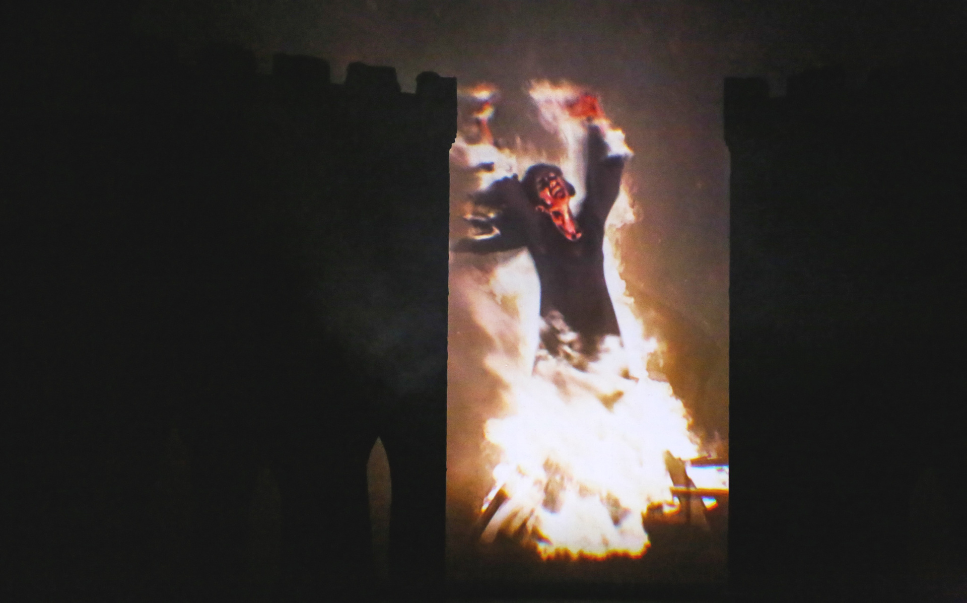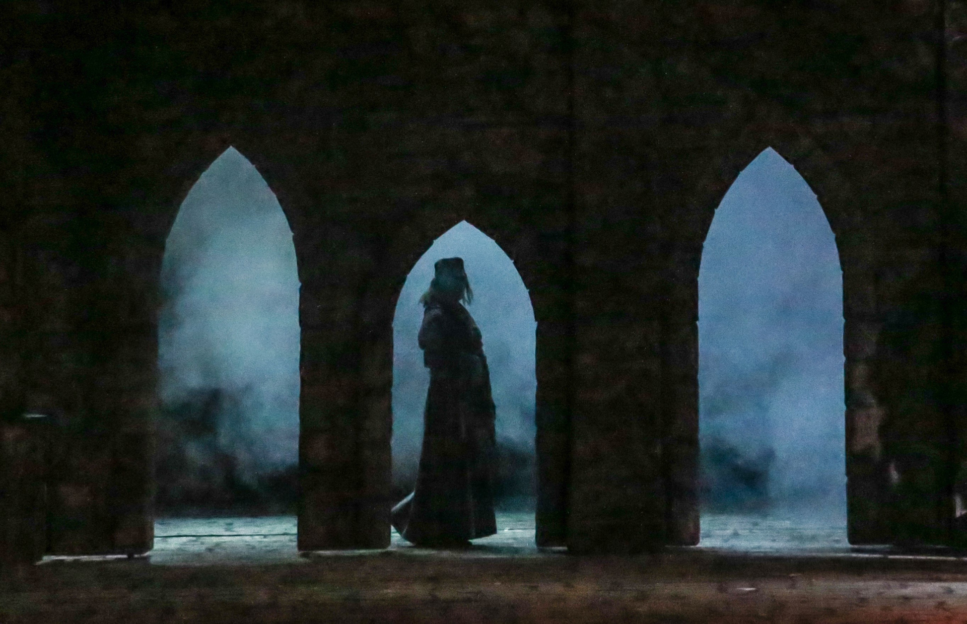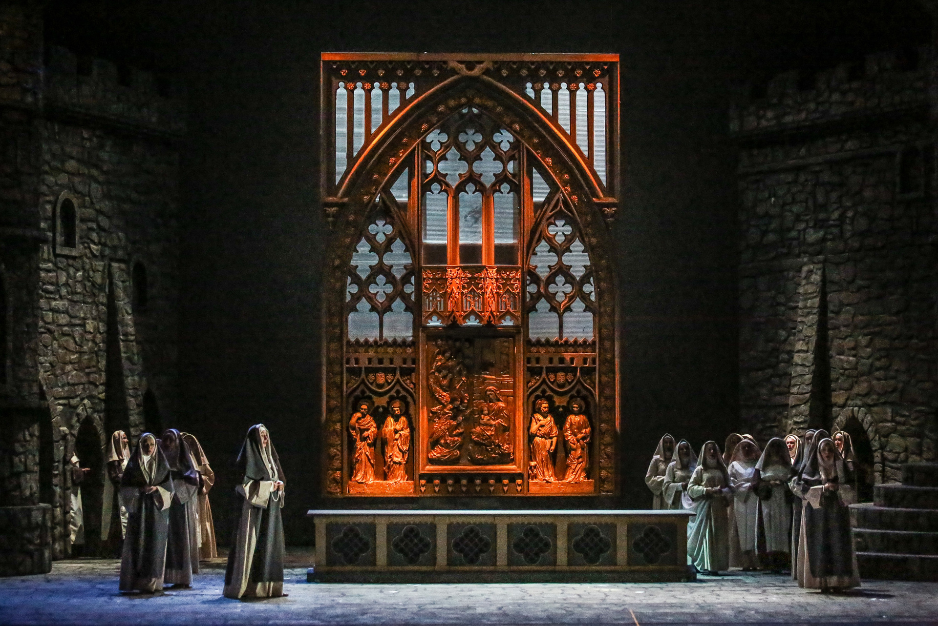 И хоть по задумке создателей спектакля действие переносится из Средневековья в период конца XIX — начала XX века (как более приближенный к слушателям), в сценографии и костюмах, разработанных художниками Виктором Герасименко и Викторией Хархалуп, фактически не содержалось никаких маркеров конкретной эпохи. Сценическое пространство было решено в виде двух башен (которые, по всей видимости, символизировали противоборство двух миров — насилия и свободы, аристократов и цыган), а действие происходило в замкнутом между ними зеркале сцены, трансформировавшемся то в сад Леоноры, то в цыганский табор, монастырь и замок Кастеллор. Правда, оформление получилось достаточно лаконичным, так что оживлять атмосферу, создавать ощущение объема и воздуха был призван экран-задник с компьютерными видеопроекциями, созданными Даниилом Герасименко, — сосновыми рощами, лунными пейзажами и кроваво-мрачными небесами. И дополнительно он использовался для флешбэков — как, например, во время арии Азучены «Stride la vampa», когда она рассказывает о казни своей матери, и ее история одновременно визуализируется на экране. В целом, заявленный «перенос действия» вышел достаточно условным (правда, и сама драма Гутьерреса не слишком правдоподобно изображает действительную историческую эпоху), но это вряд ли можно причислить к недостаткам постановки, поскольку подобная условность лишь подчеркивает генеральную идею — о том, что жестокость в мире вневременна и неисходна, костры инквизиции просто сменяются печами лагерей смерти, и так ad infinitum.