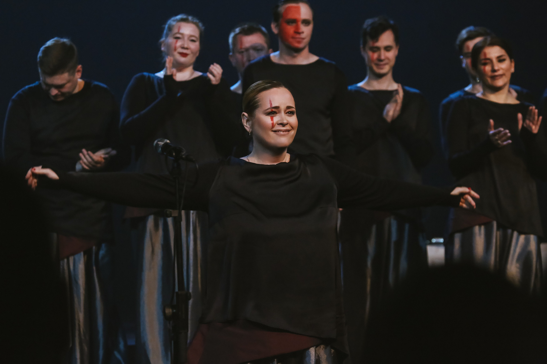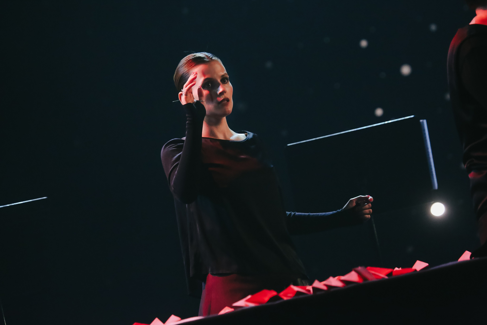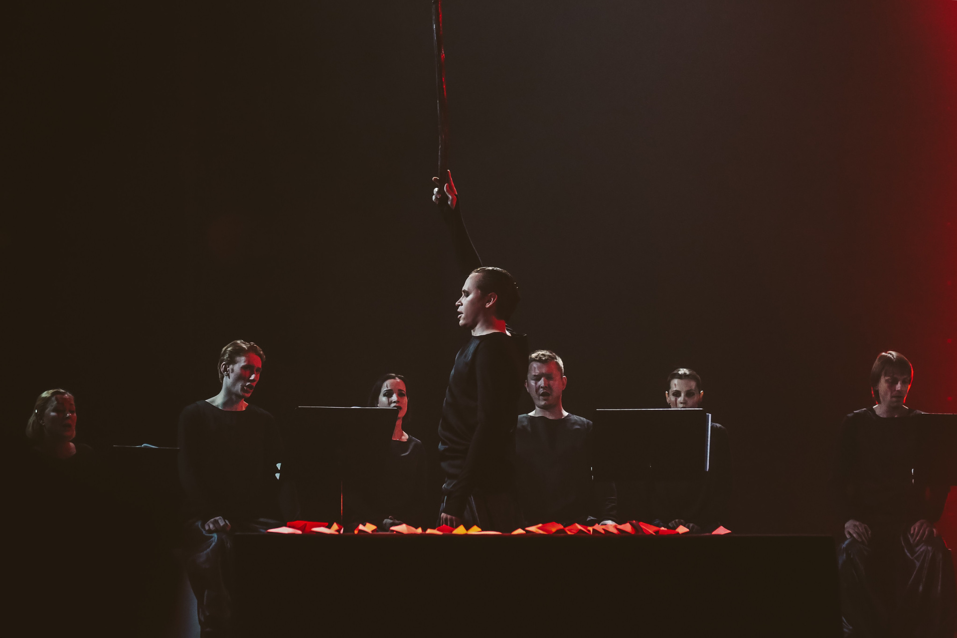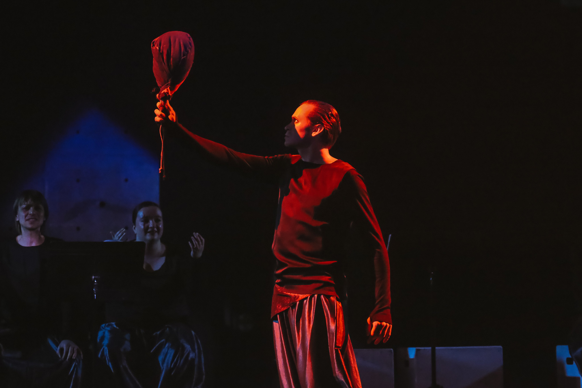 Премьера произведения в концертном исполнении Камерного хора «Новой оперы» прошла летом 2017-го, а через год осуществилось уже полноценное сценическое воплощение в волшебном пространстве Зеркального фойе театра, которое потрясло меня до глубины души. Неделю назад «Красное» вернулось в афишу и было представлено уже на сцене, причем с обновленной сценографией и потрясающей световой партитурой (отдельная радость фотографа). Сценический язык и символы остались прежними, но, безусловно, визуально и по смыслу это, фактически, совсем другой спектакль — еще более значительный по накалу, трагизму и масштабу, камерный только по форме, но не по сути.
