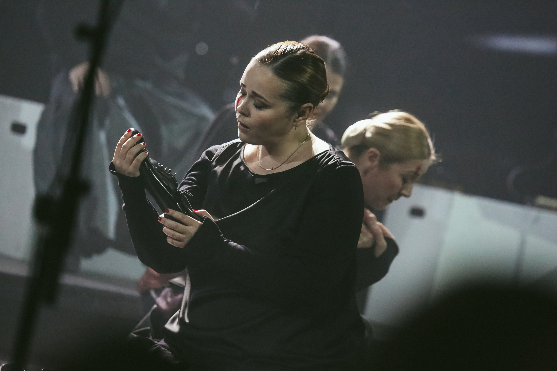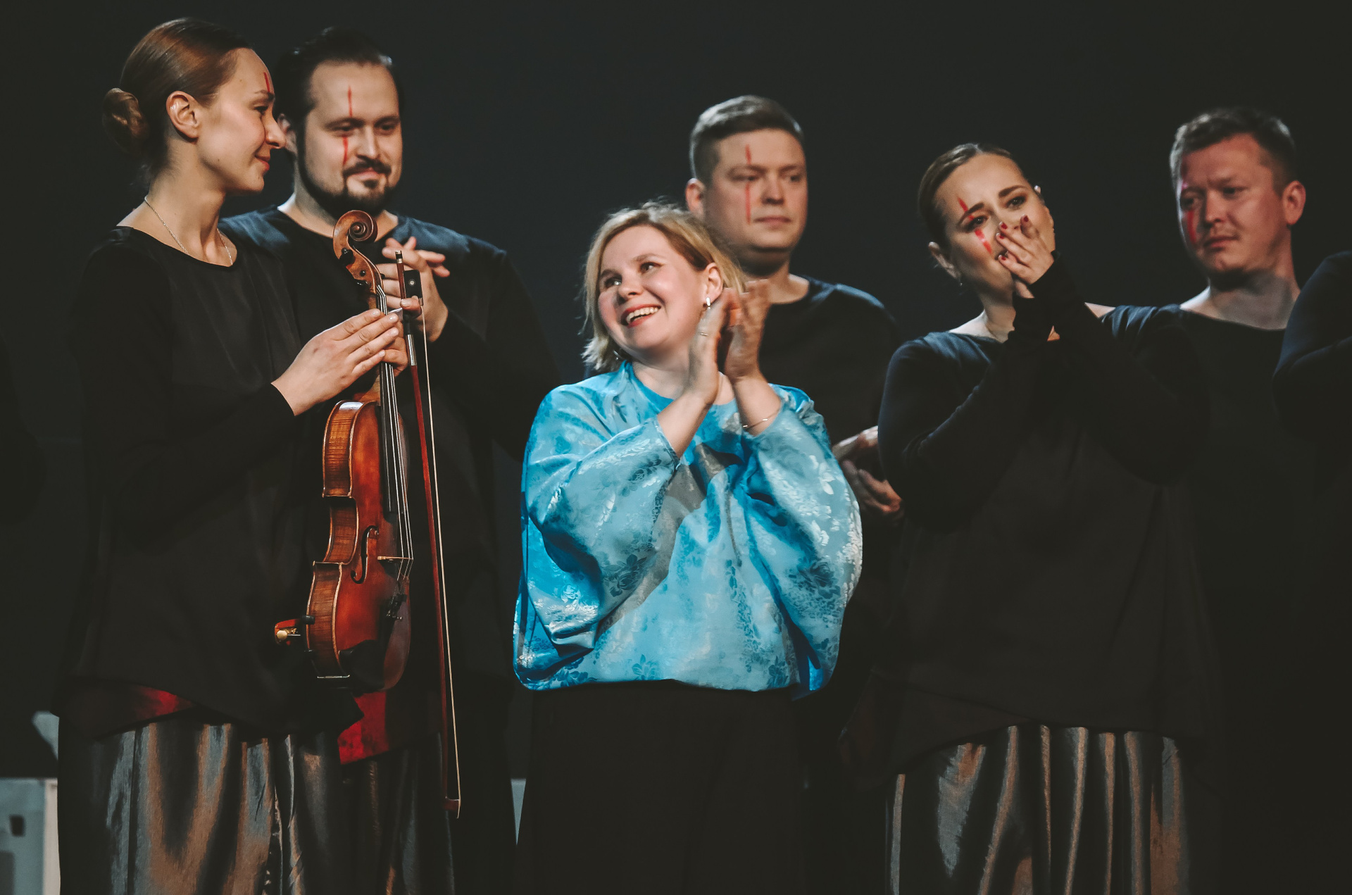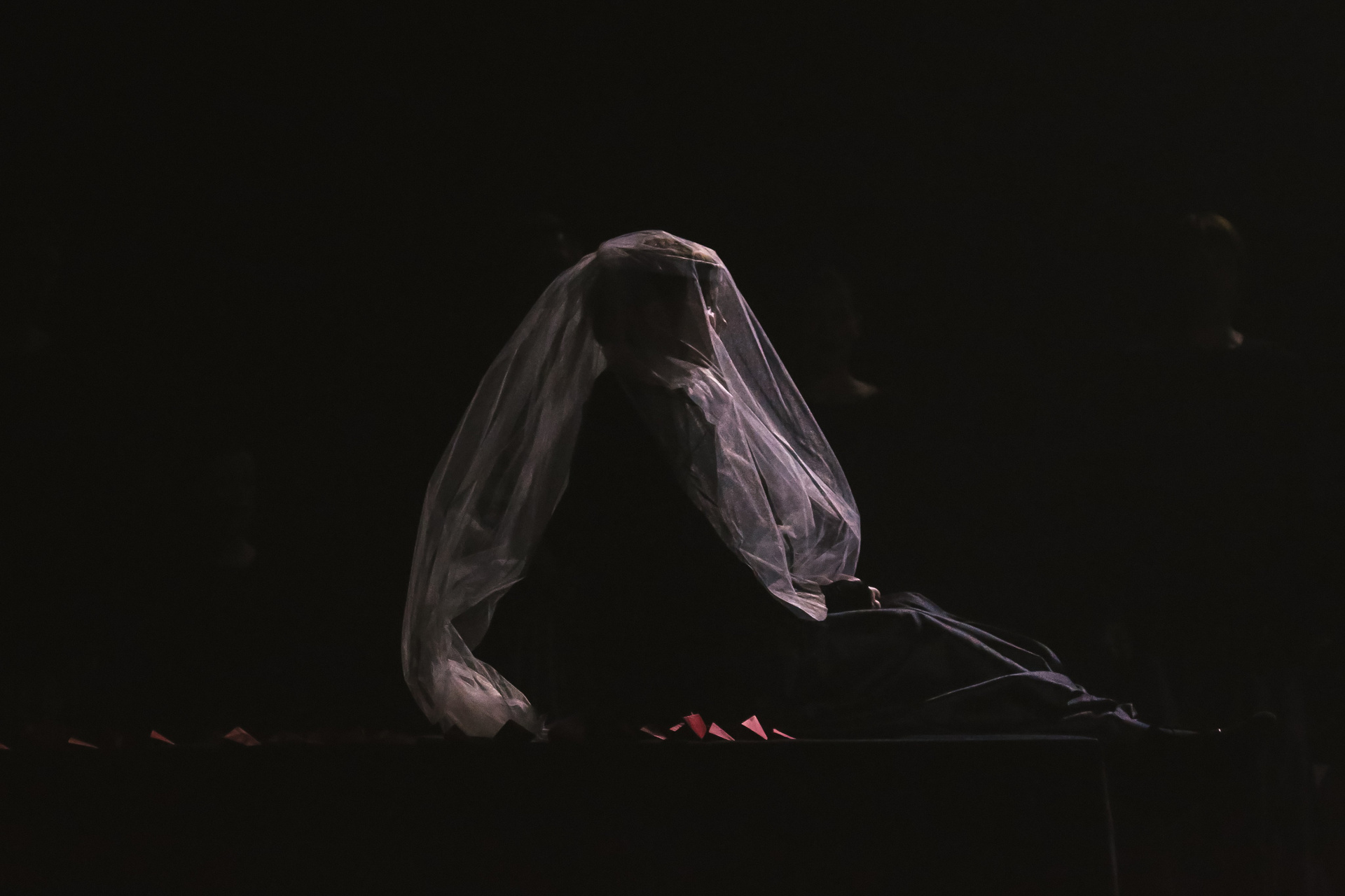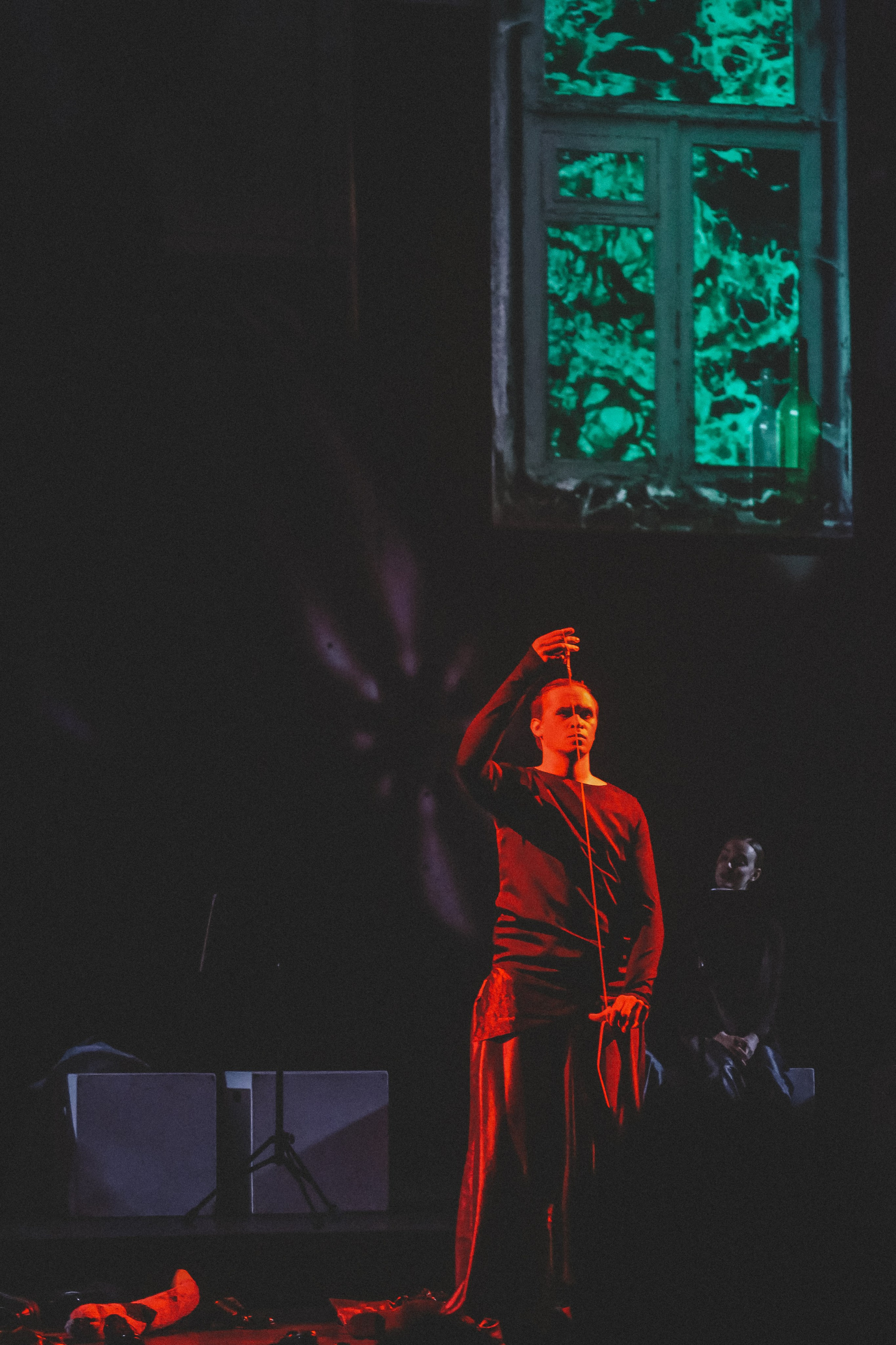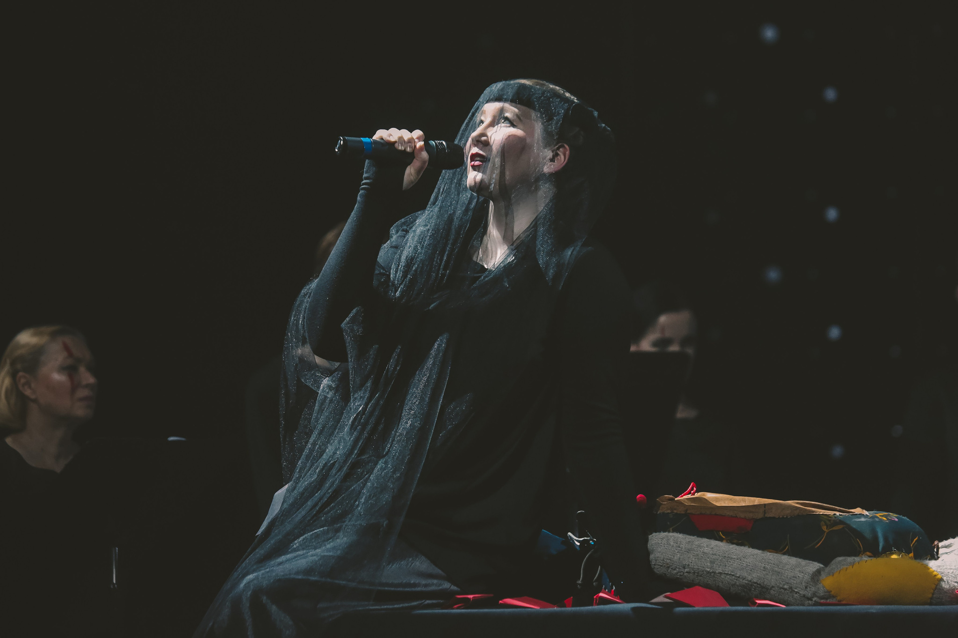 Премьера произведения в концертном исполнении Камерного хора «Новой оперы» прошла летом 2017-го, а через год осуществилось уже полноценное сценическое воплощение в волшебном пространстве Зеркального фойе театра, которое потрясло меня до глубины души. Неделю назад «Красное» вернулось в афишу и было представлено уже на сцене, причем с обновленной сценографией и потрясающей световой партитурой (отдельная радость фотографа). Сценический язык и символы остались прежними, но, безусловно, визуально и по смыслу это, фактически, совсем другой спектакль — еще более значительный по накалу, трагизму и масштабу, камерный только по форме, но не по сути.