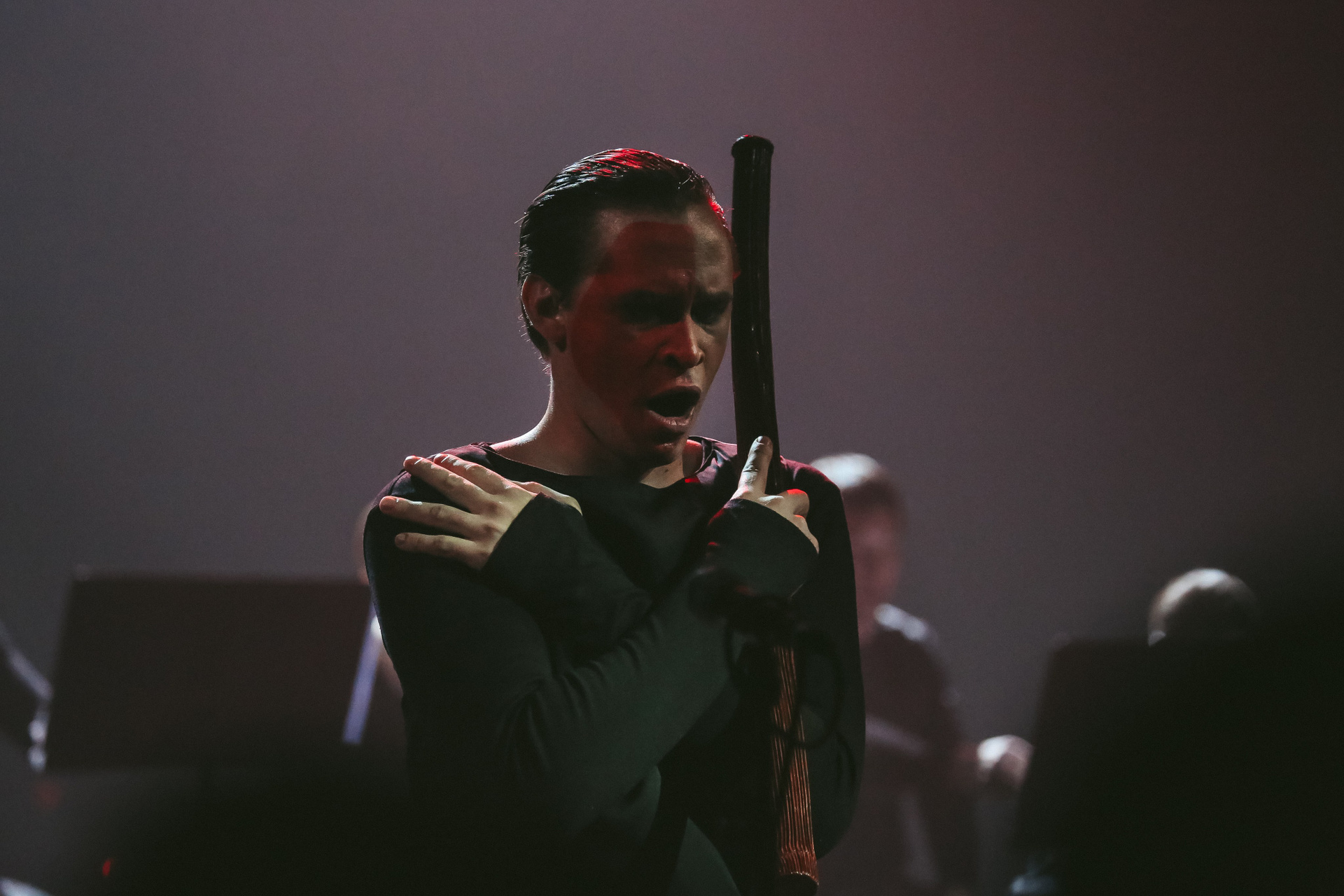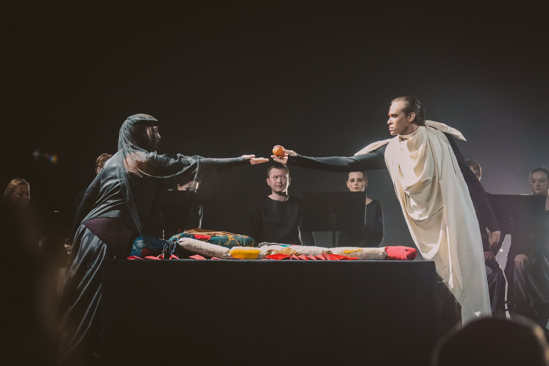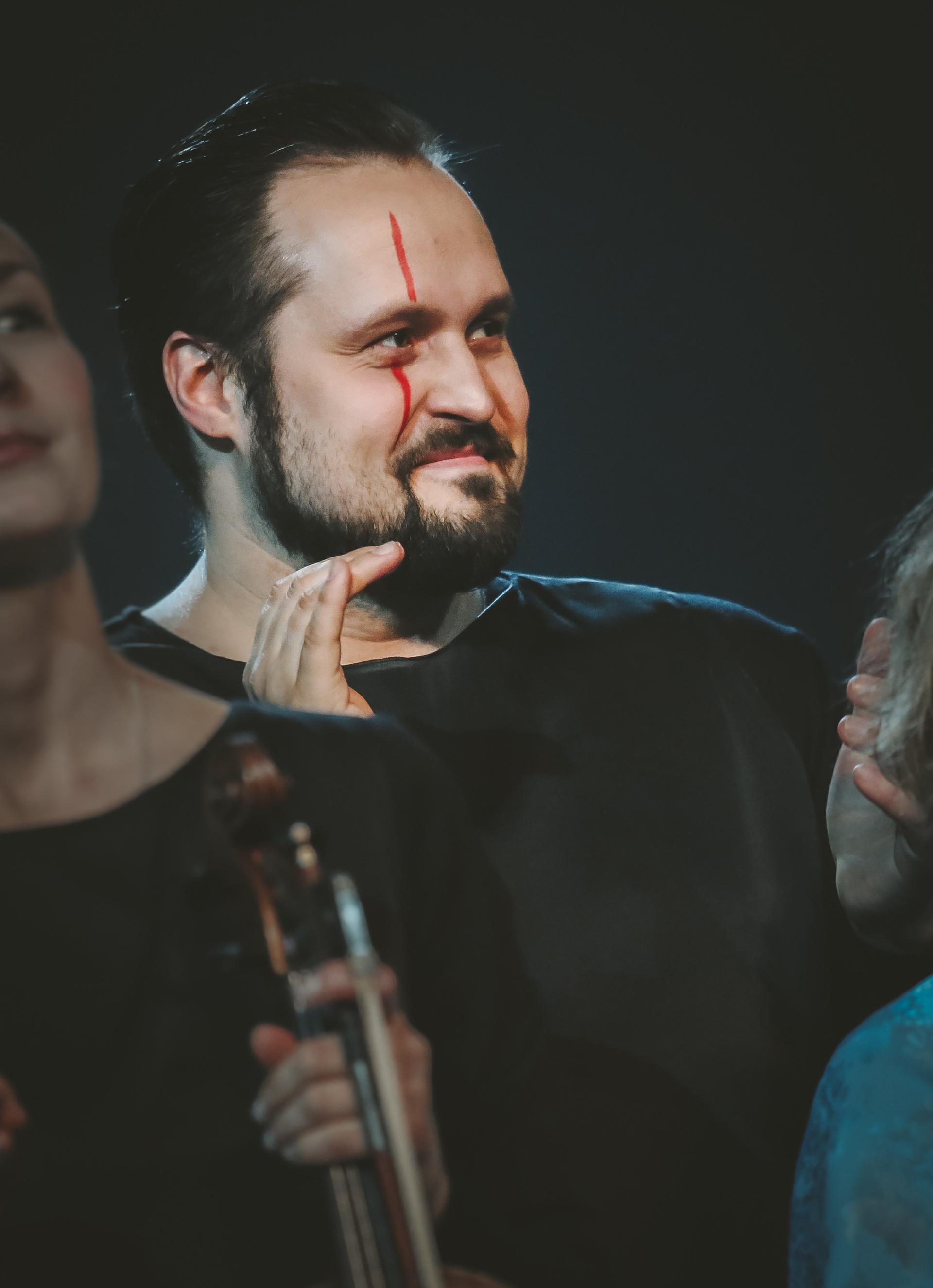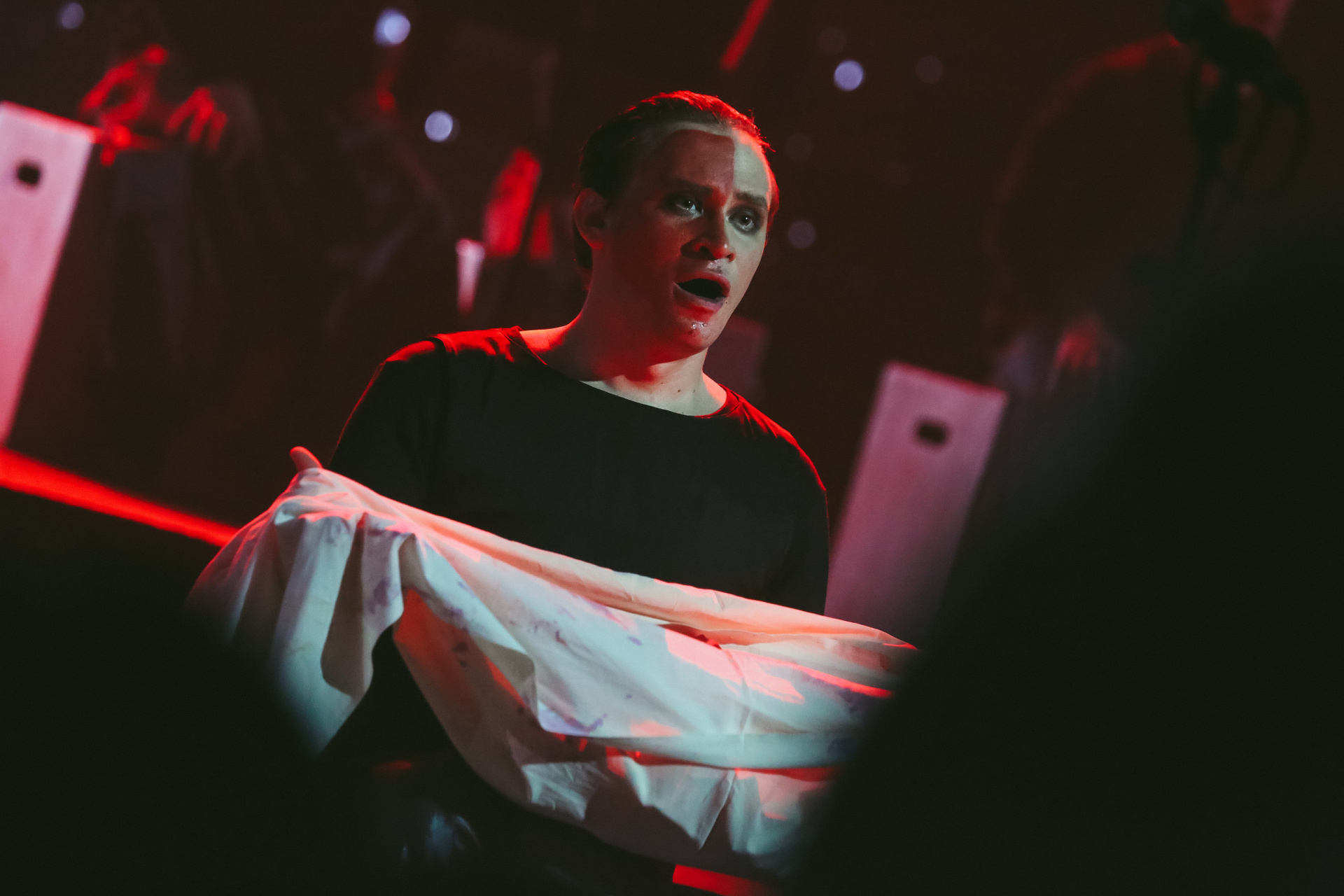 Премьера произведения в концертном исполнении Камерного хора «Новой оперы» прошла летом 2017-го, а через год осуществилось уже полноценное сценическое воплощение в волшебном пространстве Зеркального фойе театра, которое потрясло меня до глубины души. Неделю назад «Красное» вернулось в афишу и было представлено уже на сцене, причем с обновленной сценографией и потрясающей световой партитурой (отдельная радость фотографа). Сценический язык и символы остались прежними, но, безусловно, визуально и по смыслу это, фактически, совсем другой спектакль — еще более значительный по накалу, трагизму и масштабу, камерный только по форме, но не по сути.