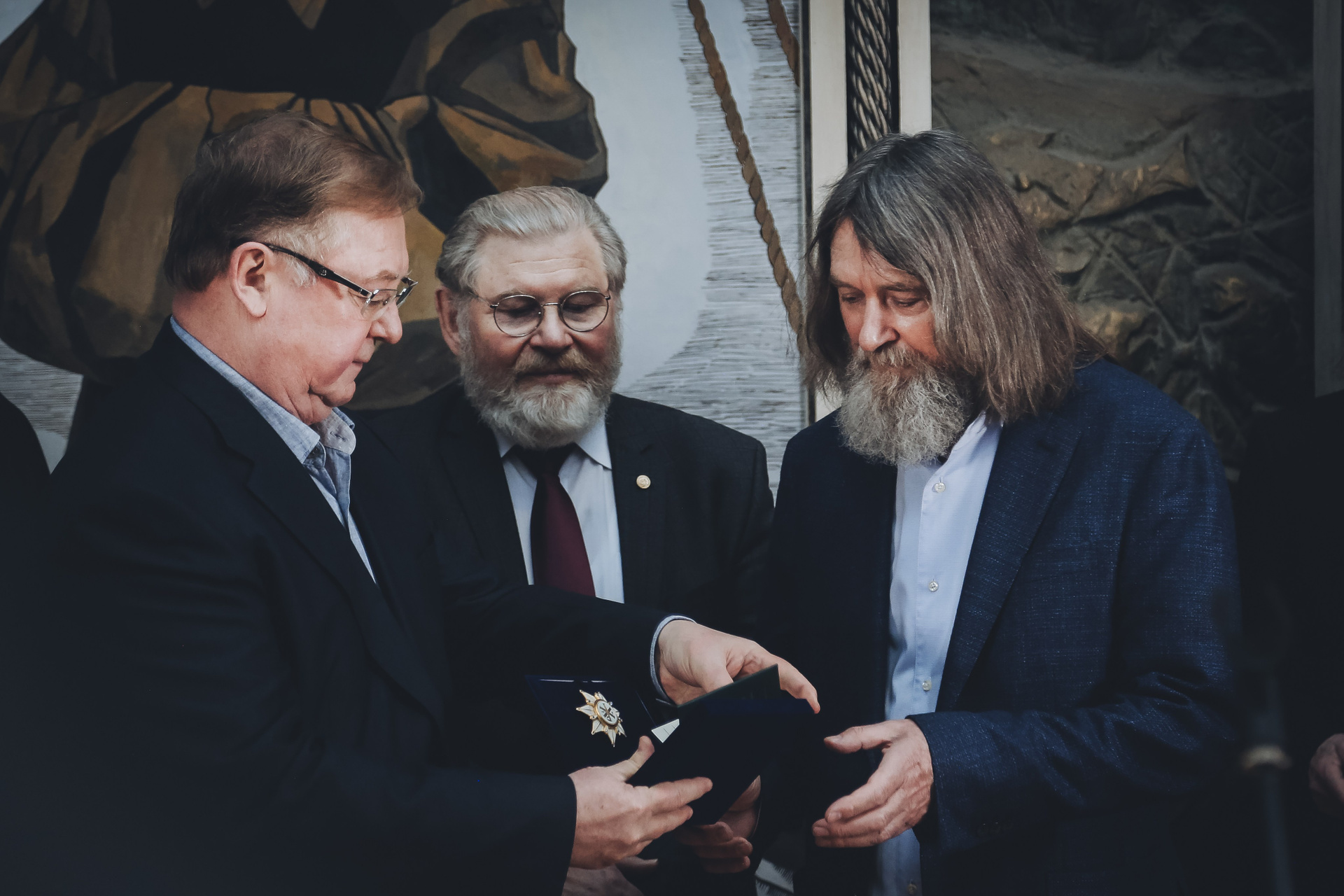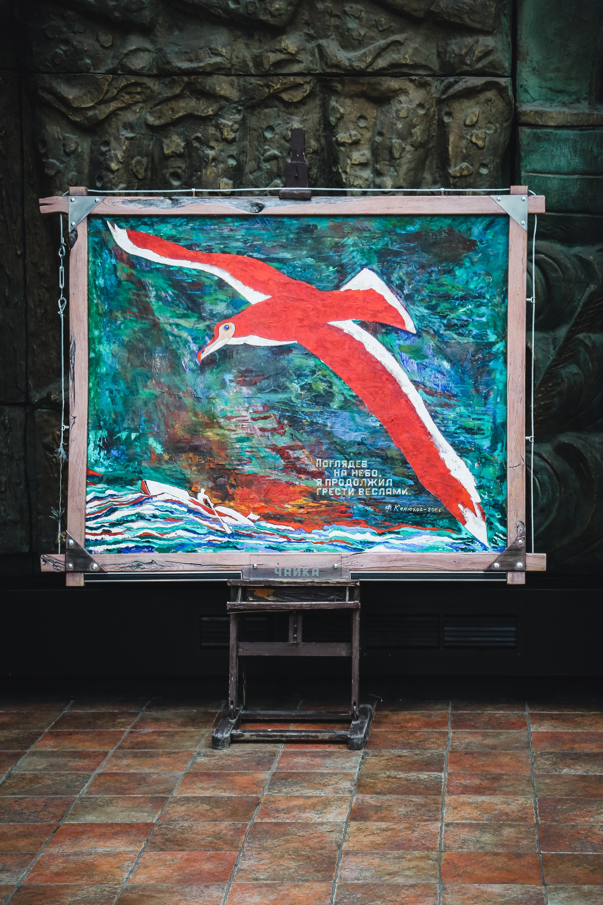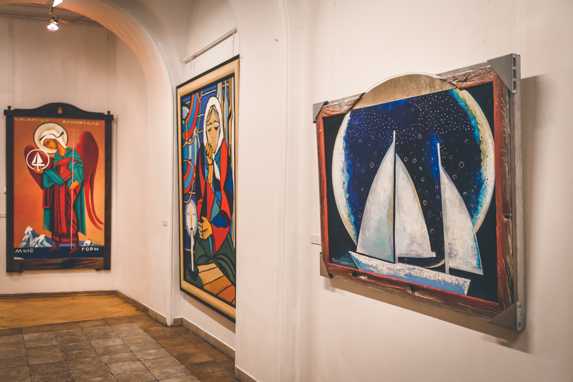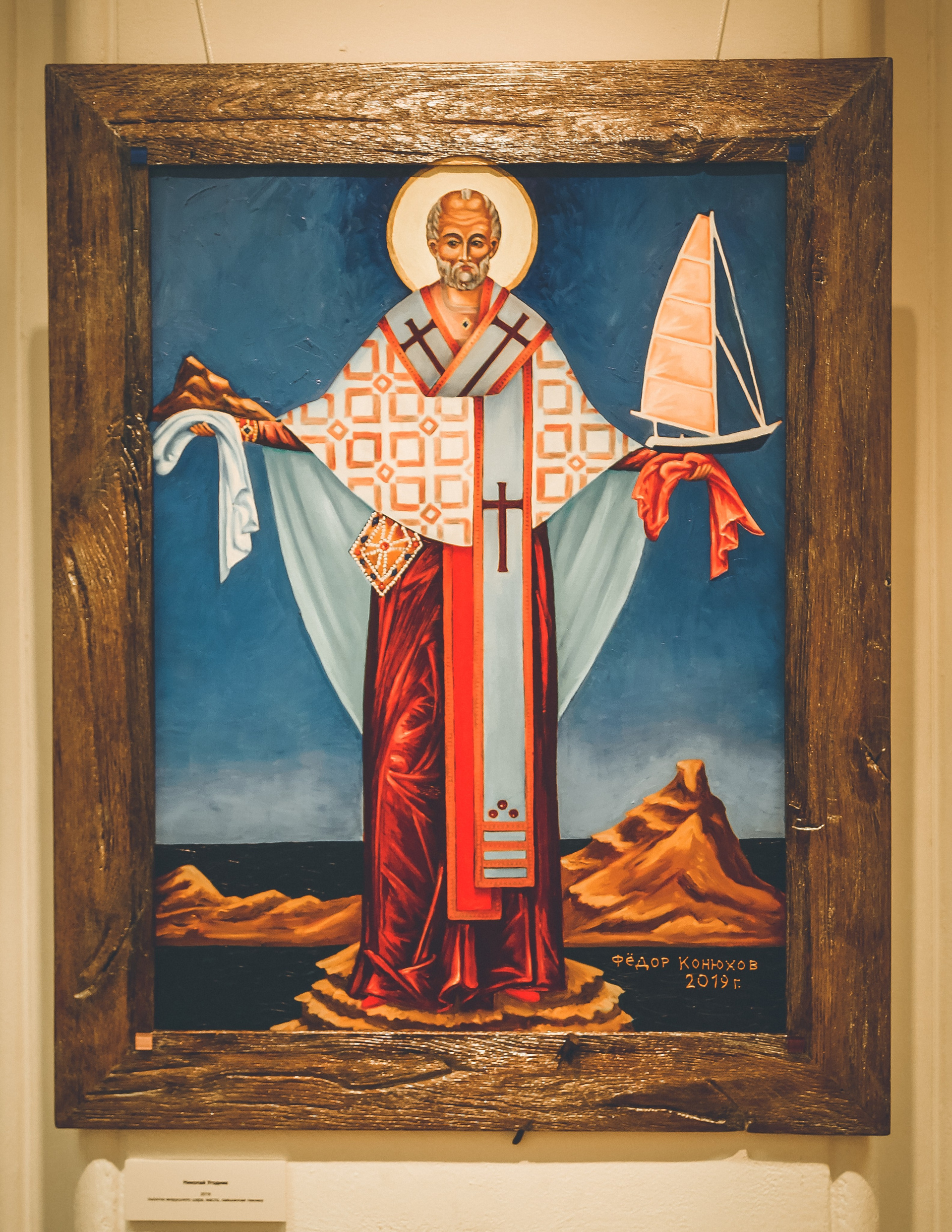 Если есть сейчас великие герои, то такие, как он. Если возможна в наше научное время истинная вера, то такая, как у него. И мир его картин не похож ни на какой иной, самобытен и уникален, будь то литографии и офорты еще 70-х годов, сделанные по итогам экспедиции на Чукотку, или поражающие буйством красок пейзажи, или иконы в технике ассамбляжа — написанные на полотнище воздушного шара, на котором он совершил кругосветное путешествие.