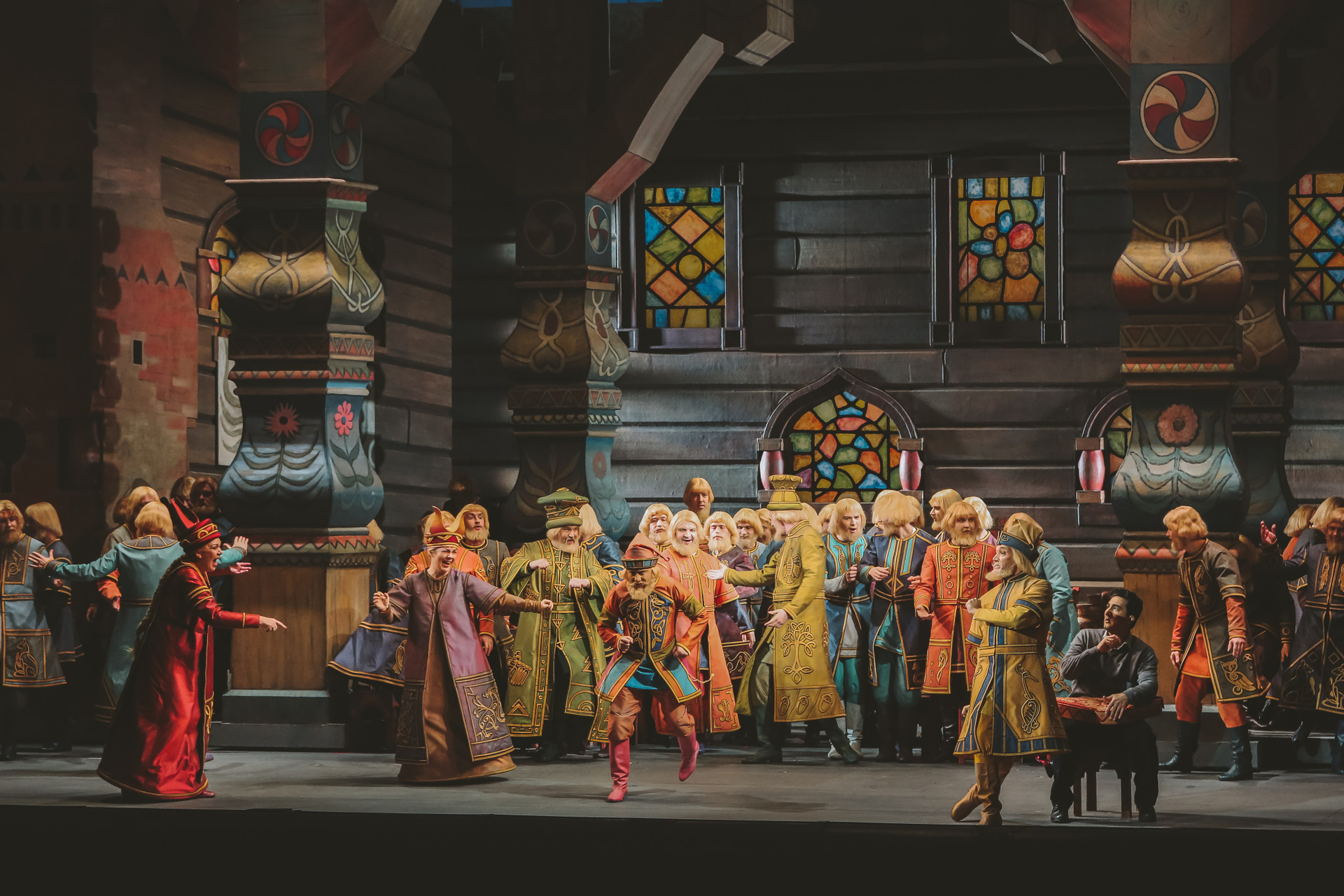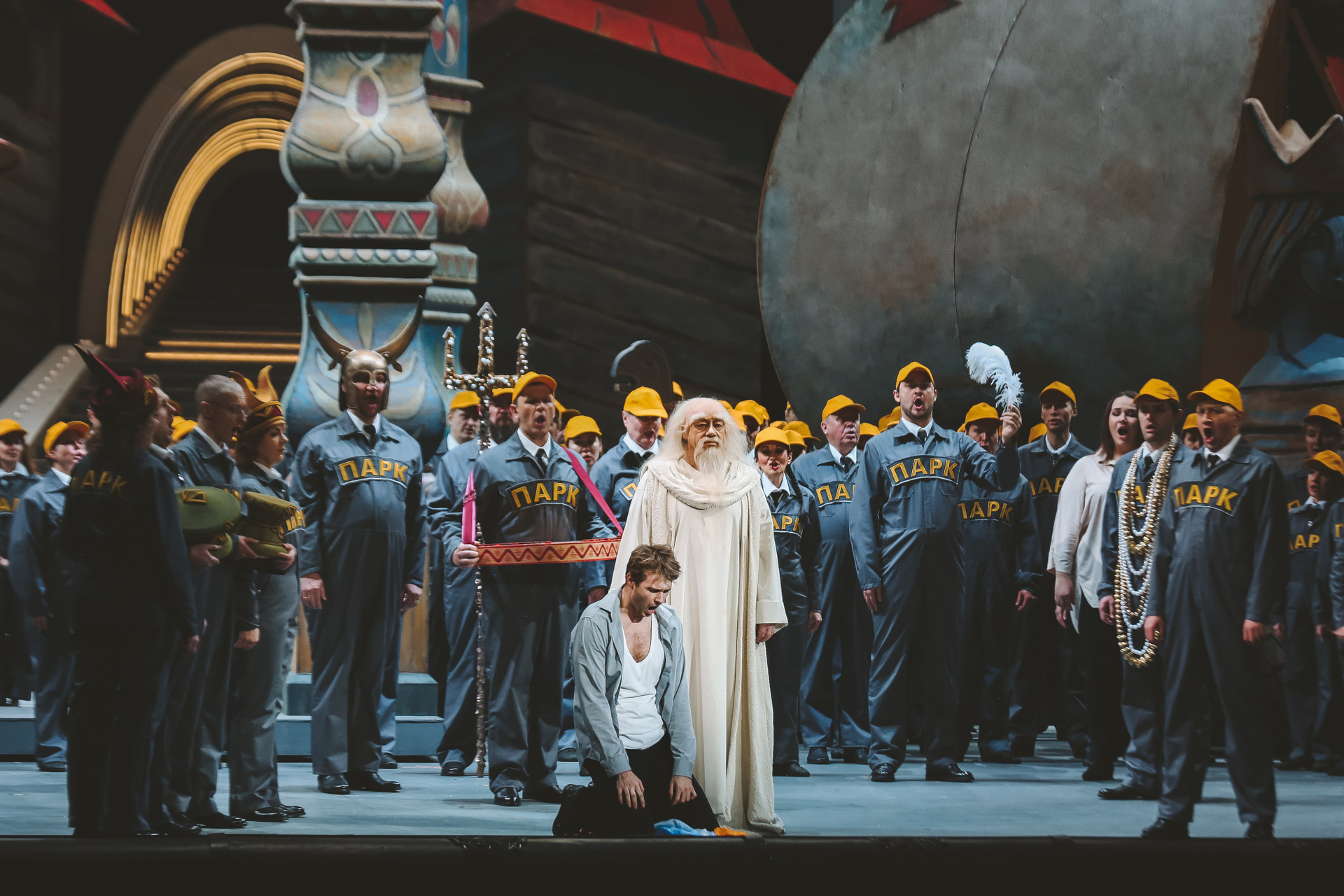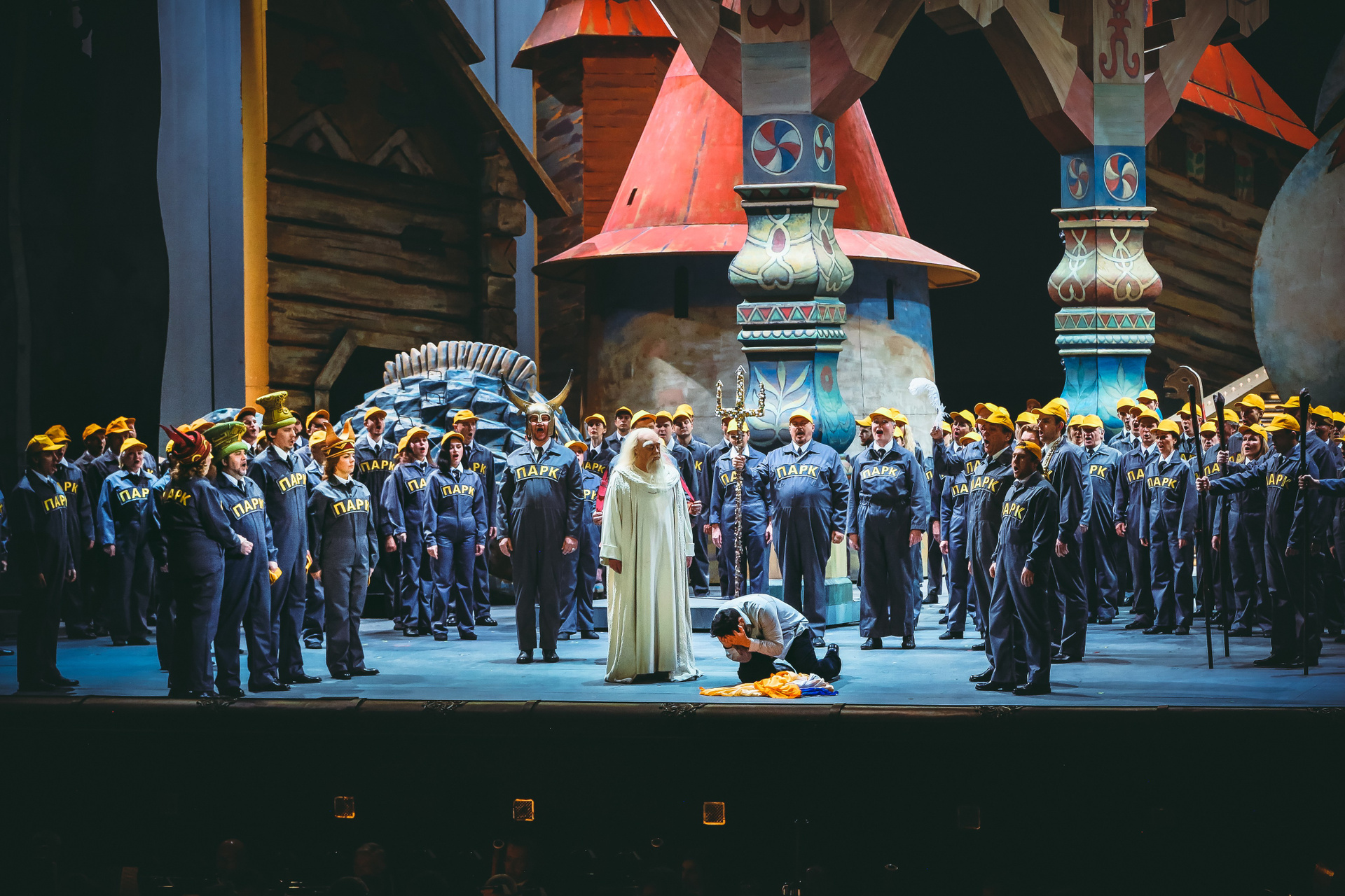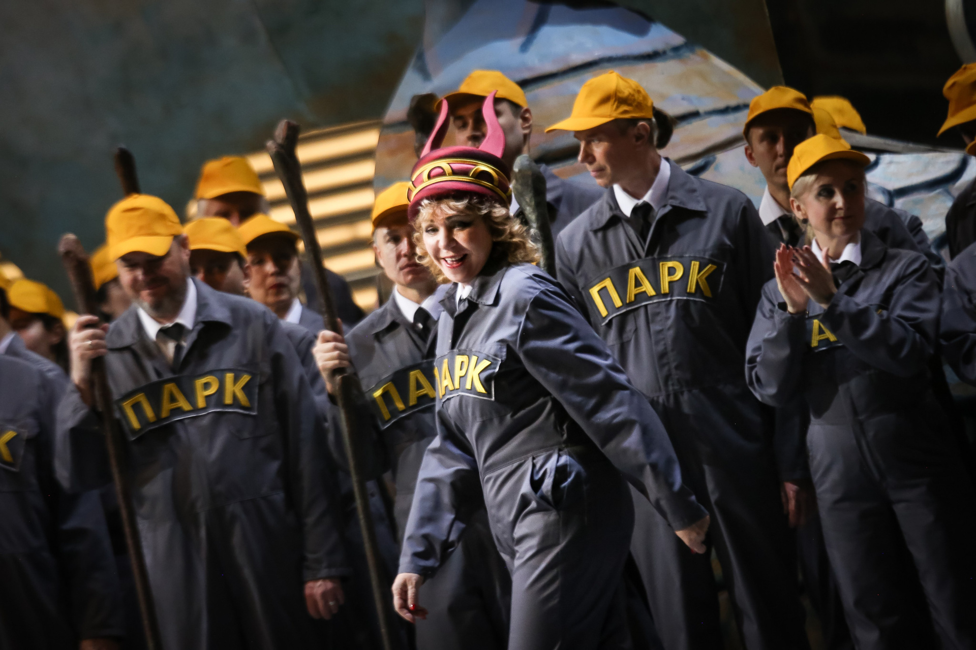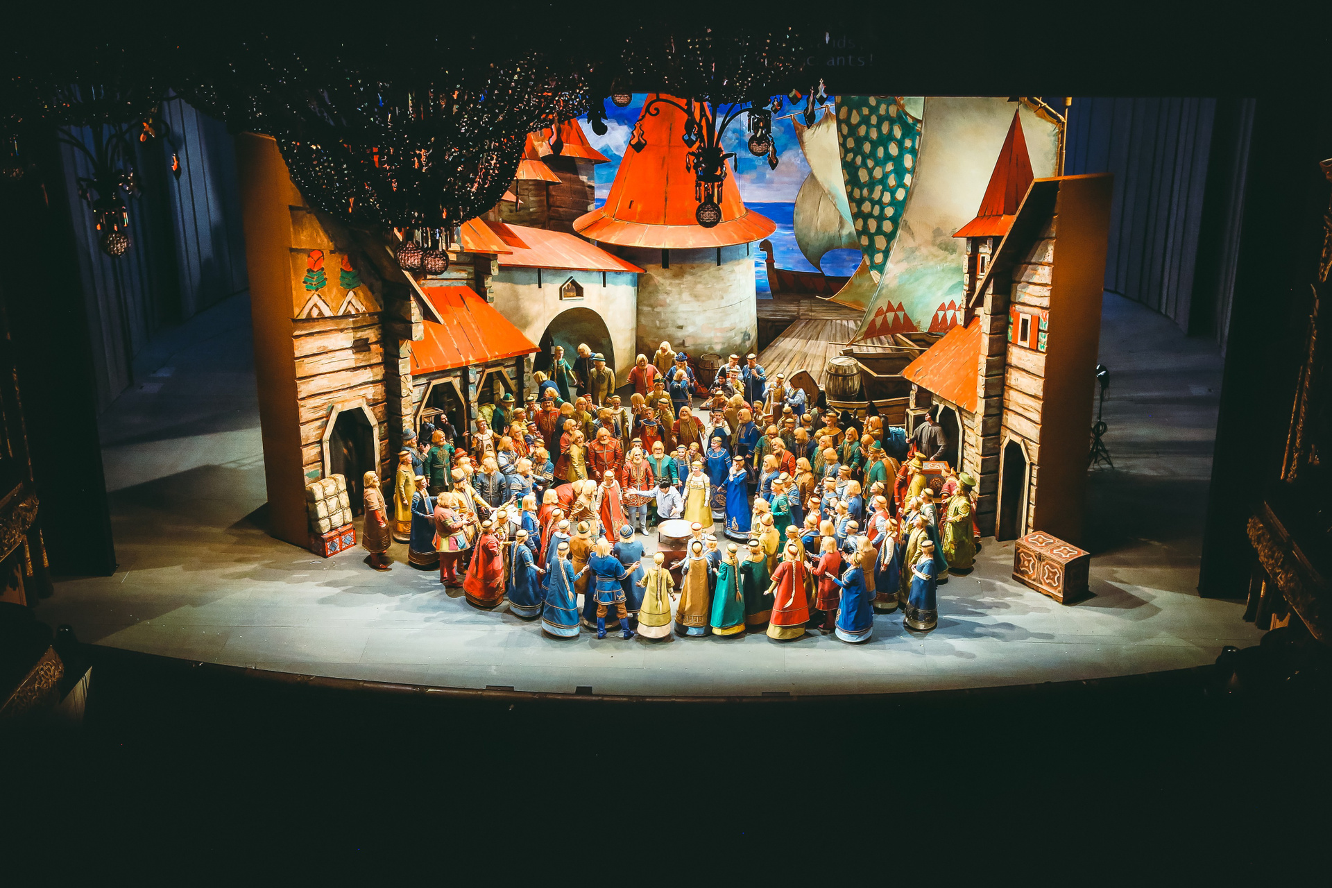 Если Институт Хржановского в утрированной форме воспроизводил стиль архитектуры советского конструктивизма, то Дмитрий Черняков для своего древнерусского луна-парка изобретательно использует эскизы пяти художников — Коровина, Рериха, Билибина, Егорова и Федоровского — которые в разное время делали декорации к «Садко». Причем то, что существовало преимущественно в виде картонных задников, в новом спектакле БТ воссоздается в трехмерном объеме — сотрудники Парка эффектно монтируют декорации в считанные секунды прямо на глазах публики, словно напоминая: всё происходящее лишь аттракцион. Собственно, что есть эта постмодернистская визуальная игра, если не высказывание о сути эпической русской оперы как аттракциона, в котором зритель жаждет развлечения (попутно забывая, что даже сказочные оперы все-таки создавались взрослыми людьми для взрослых людей, а не чтобы «ребенка можно было привести»).