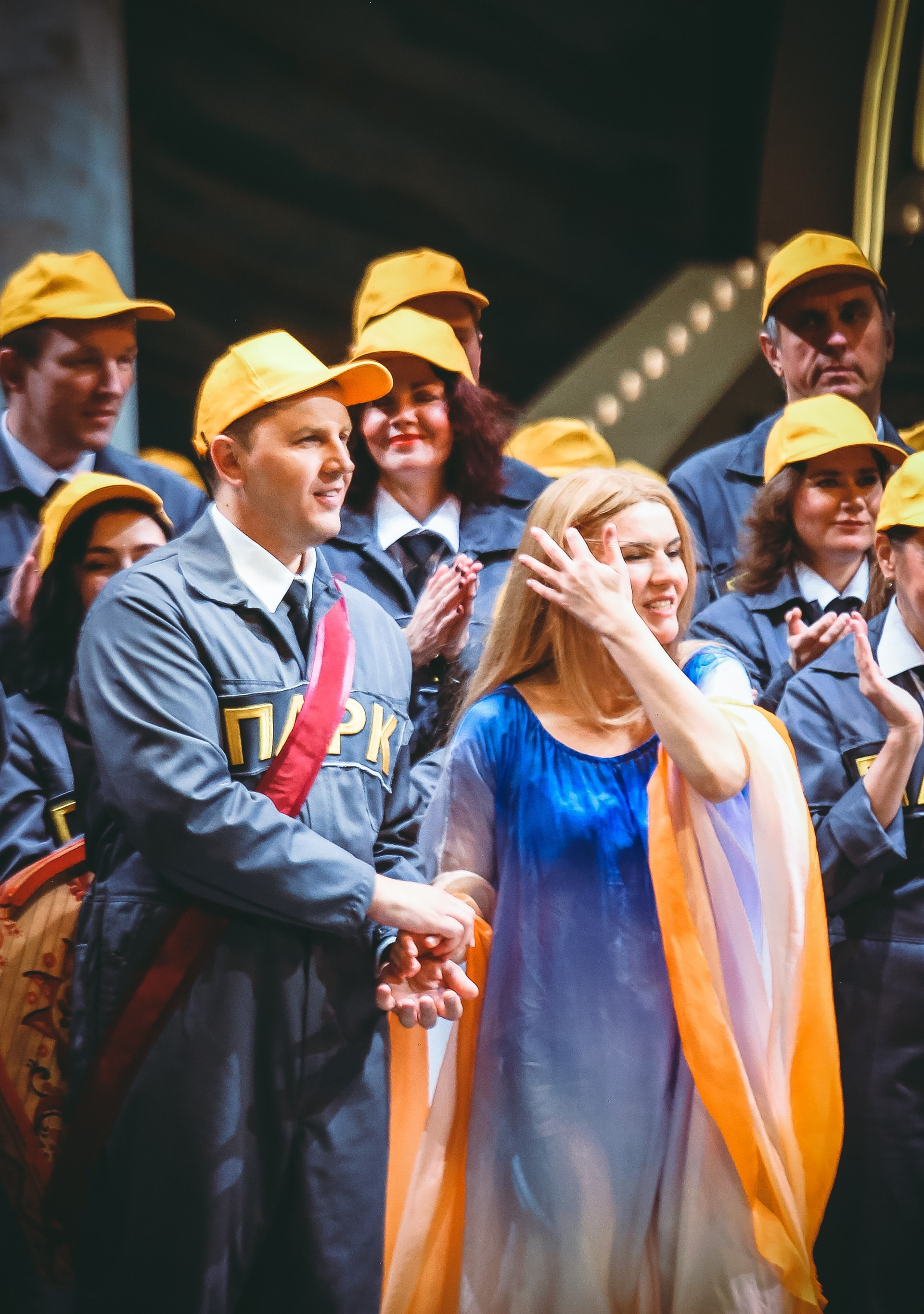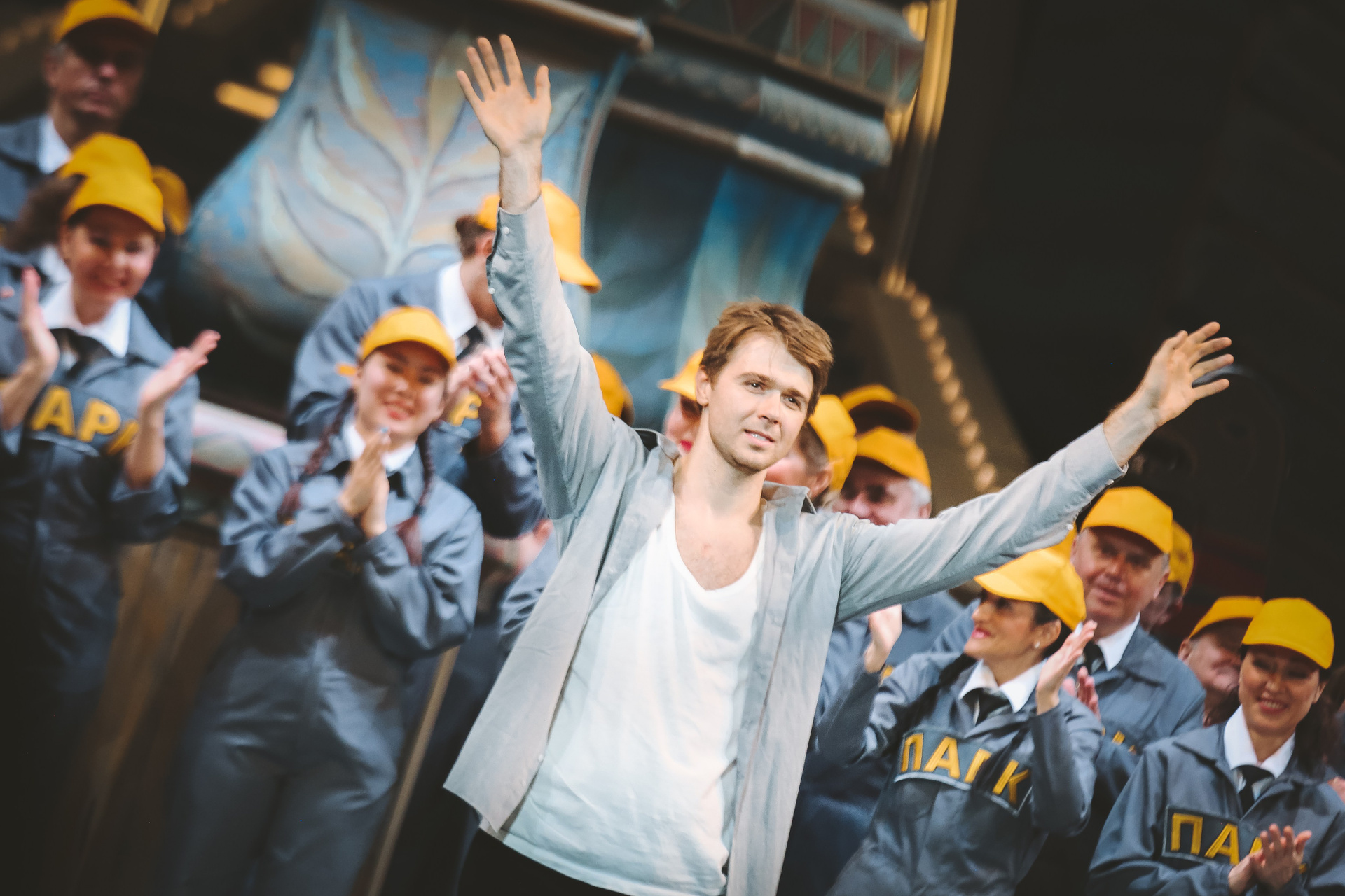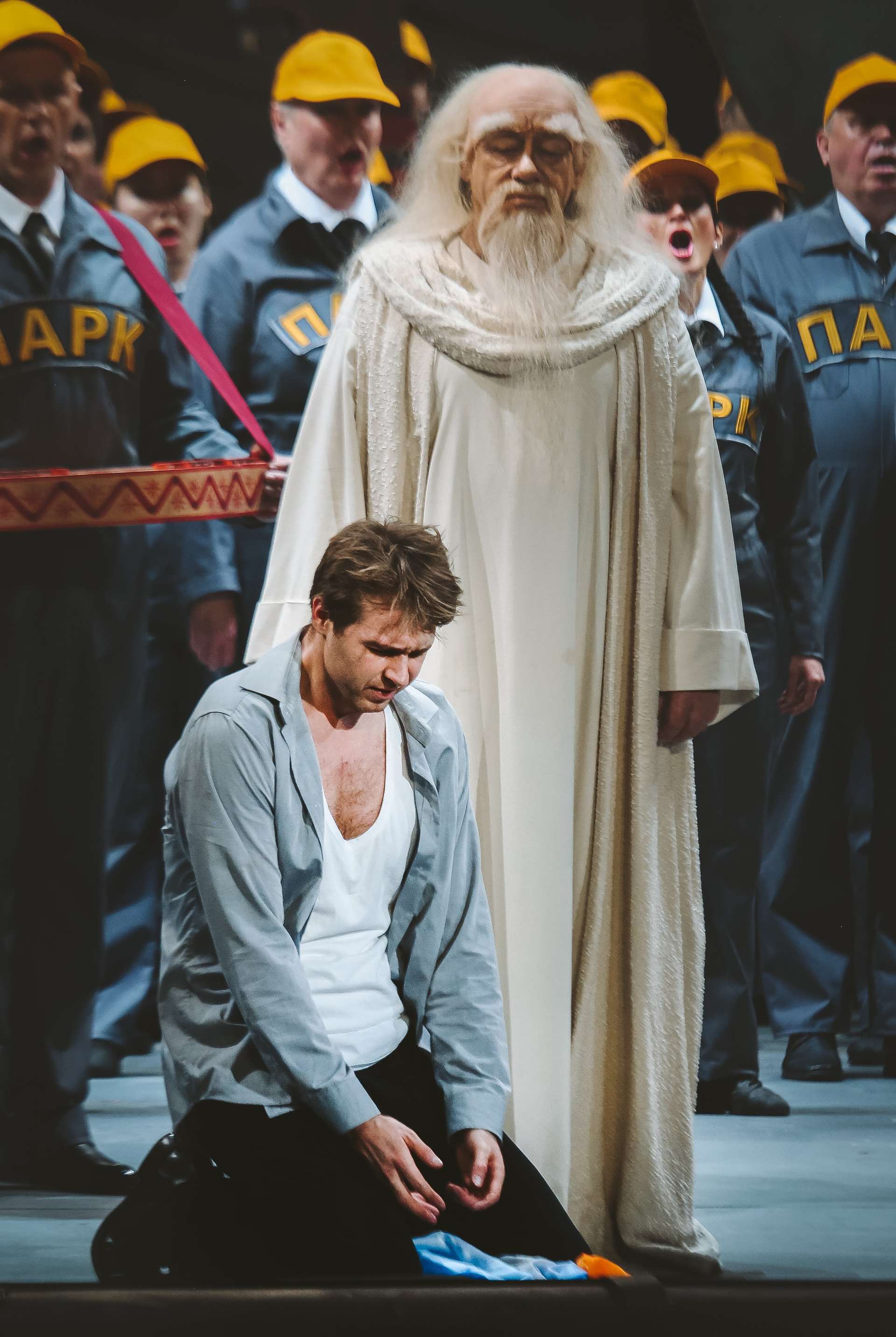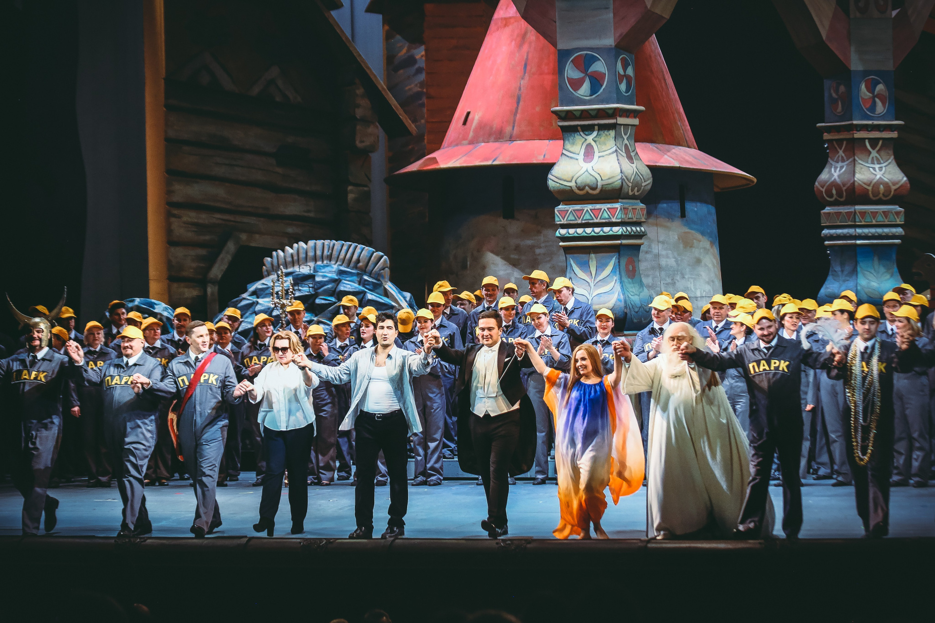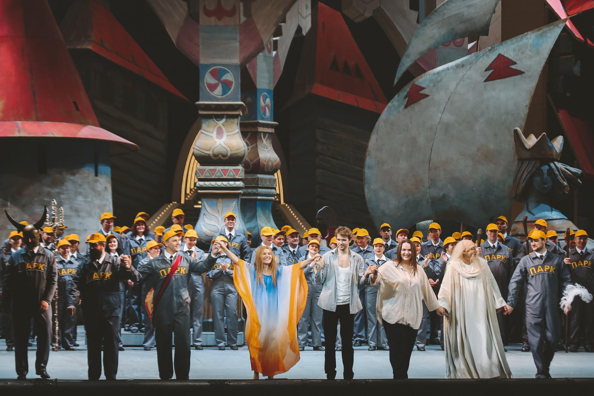 Зато главных героев набралось два состава. Если Екатерина Семенчук и Ксения Дудникова в вокальном и актерском плане выступили одинаково убедительно в роли Любавы, то из двух Волхов ближе мне оказалась Надежда Павлова — более изысканная, эмоциональная (и точно интонирующая), хотя стоит признать, что Аида Гарифуллина очень точно соответствовала необходимому образу гламурной дивы — ей тут даже играть особо не нужно, просто быть собой. Настоящих драматических теноров же, способных осилить требовательную партию Садко, сейчас днем с огнем не сыщешь, но тут, надо сказать, нам повезло: у Нажмиддина Мавлянова из первого состава, незаурядный талант и уникальный голос, будто созданный для данной партии, а Иван Гынгазов взял органичностью и драматическим дарованием, тем более задача была поставлена незаурядная — сыграть человека, который лишь изображает былинного Садко. Так что чутье не подвело Чернякова и позволило ему блестяще использовать типажи всех солистов.