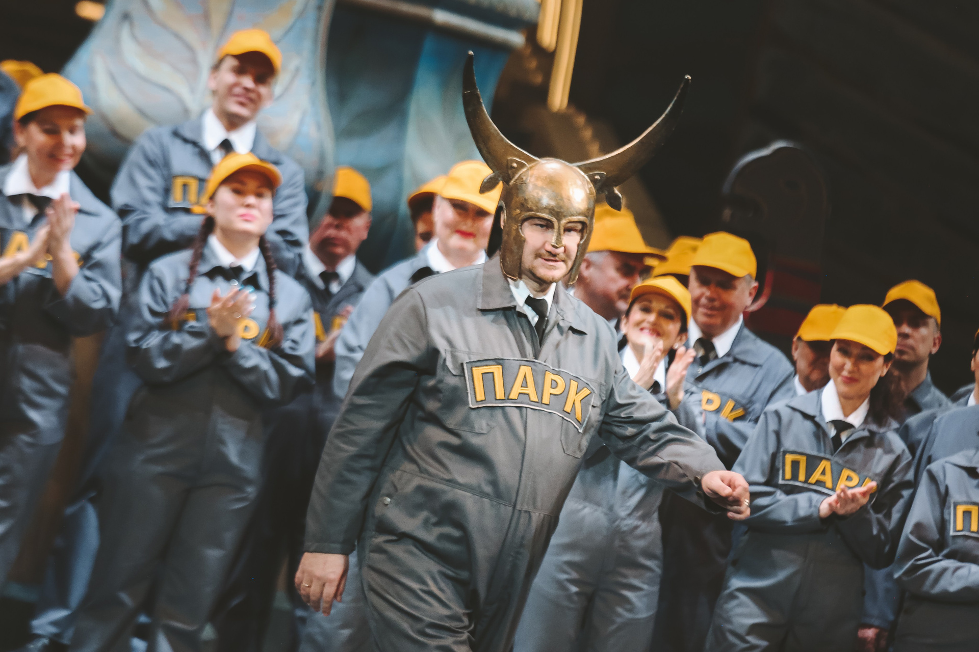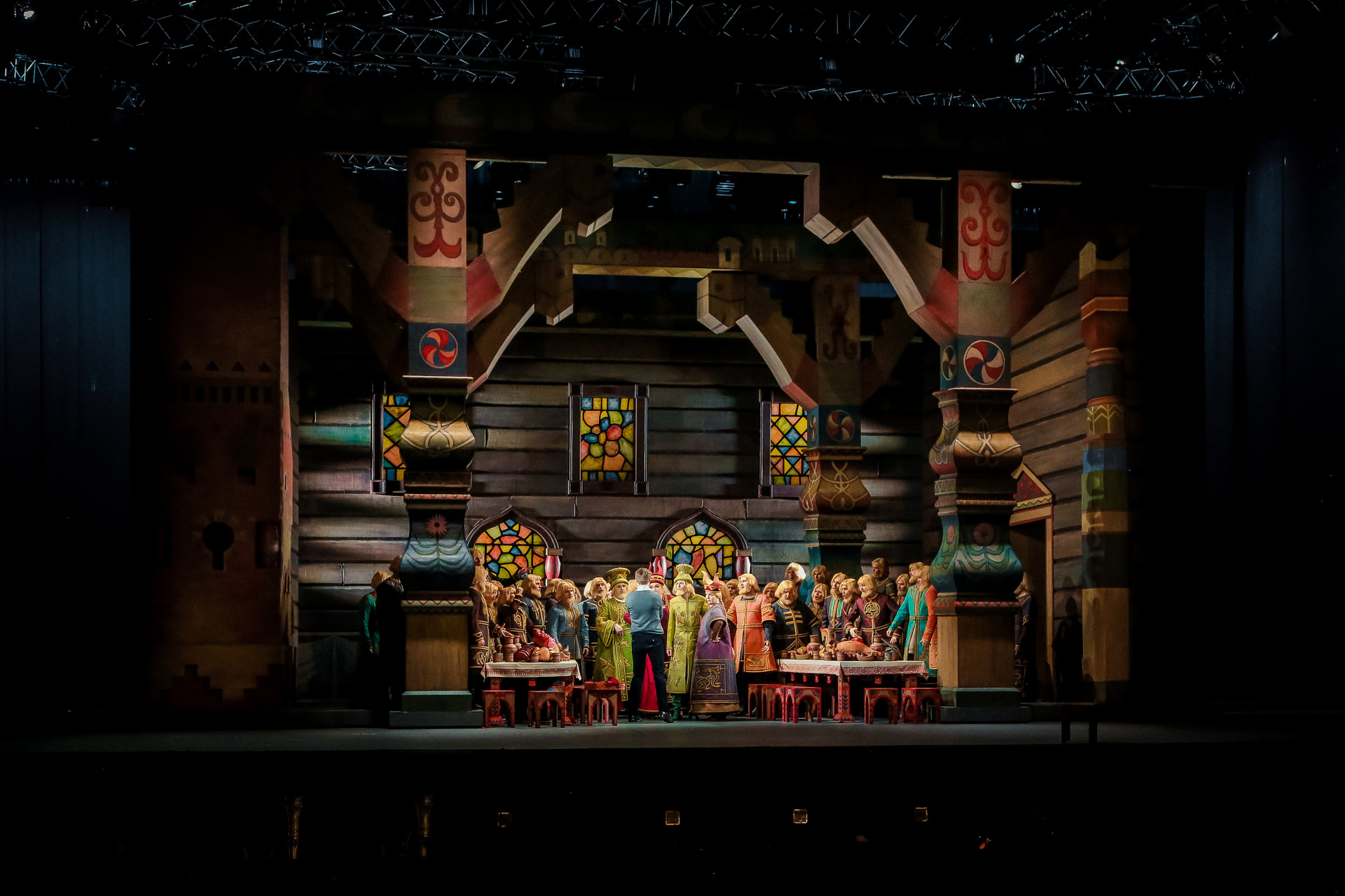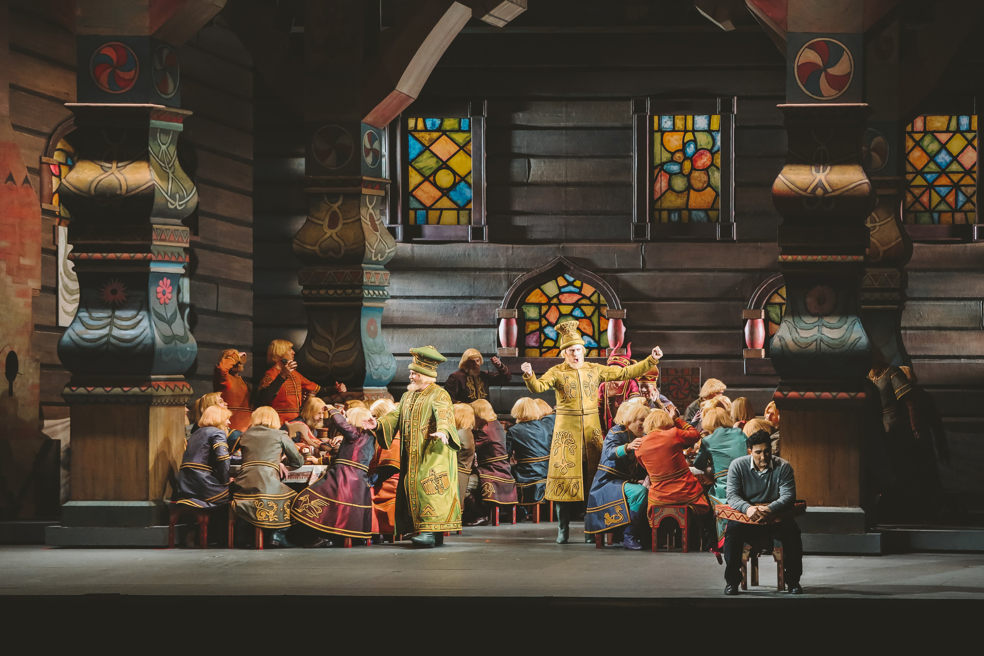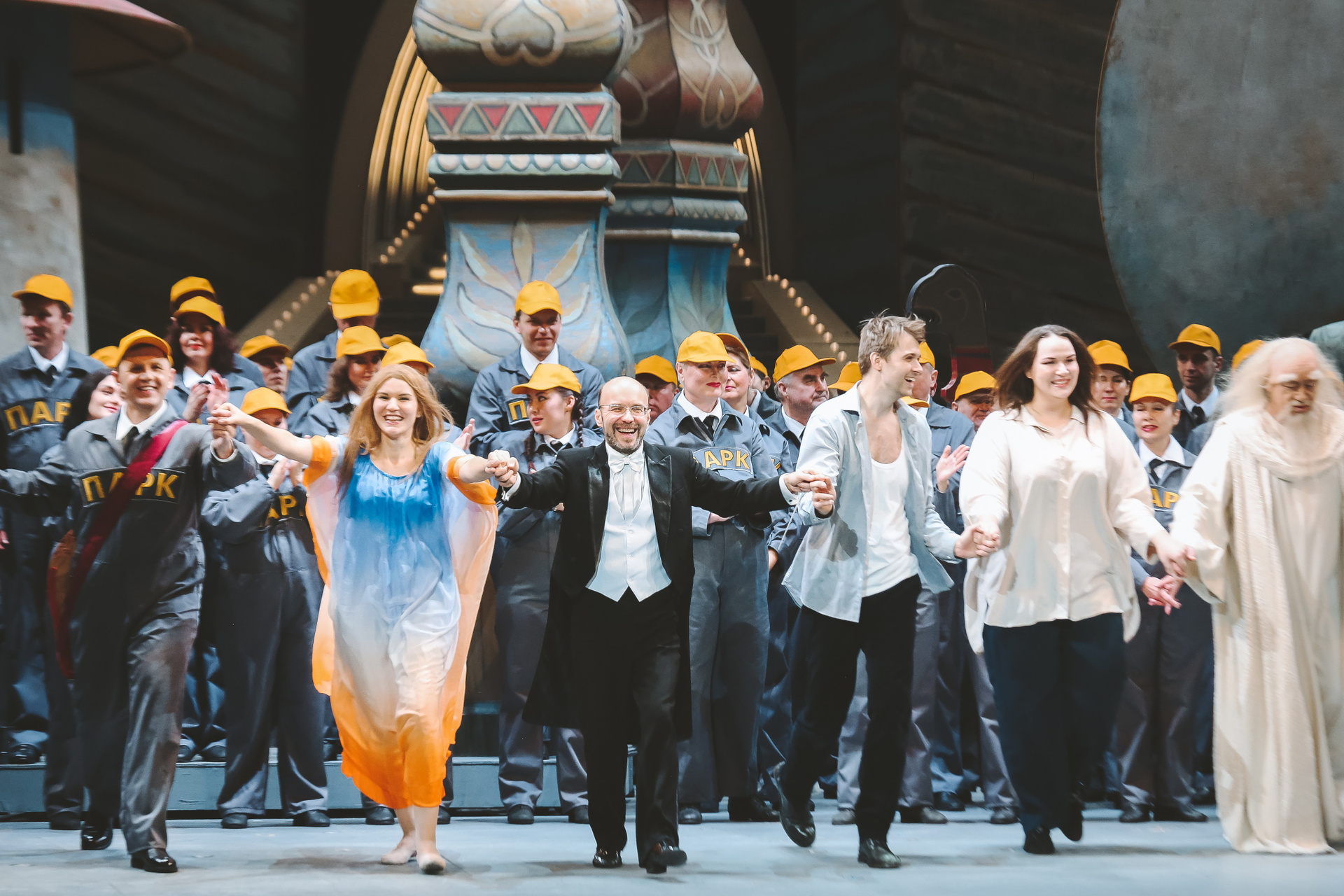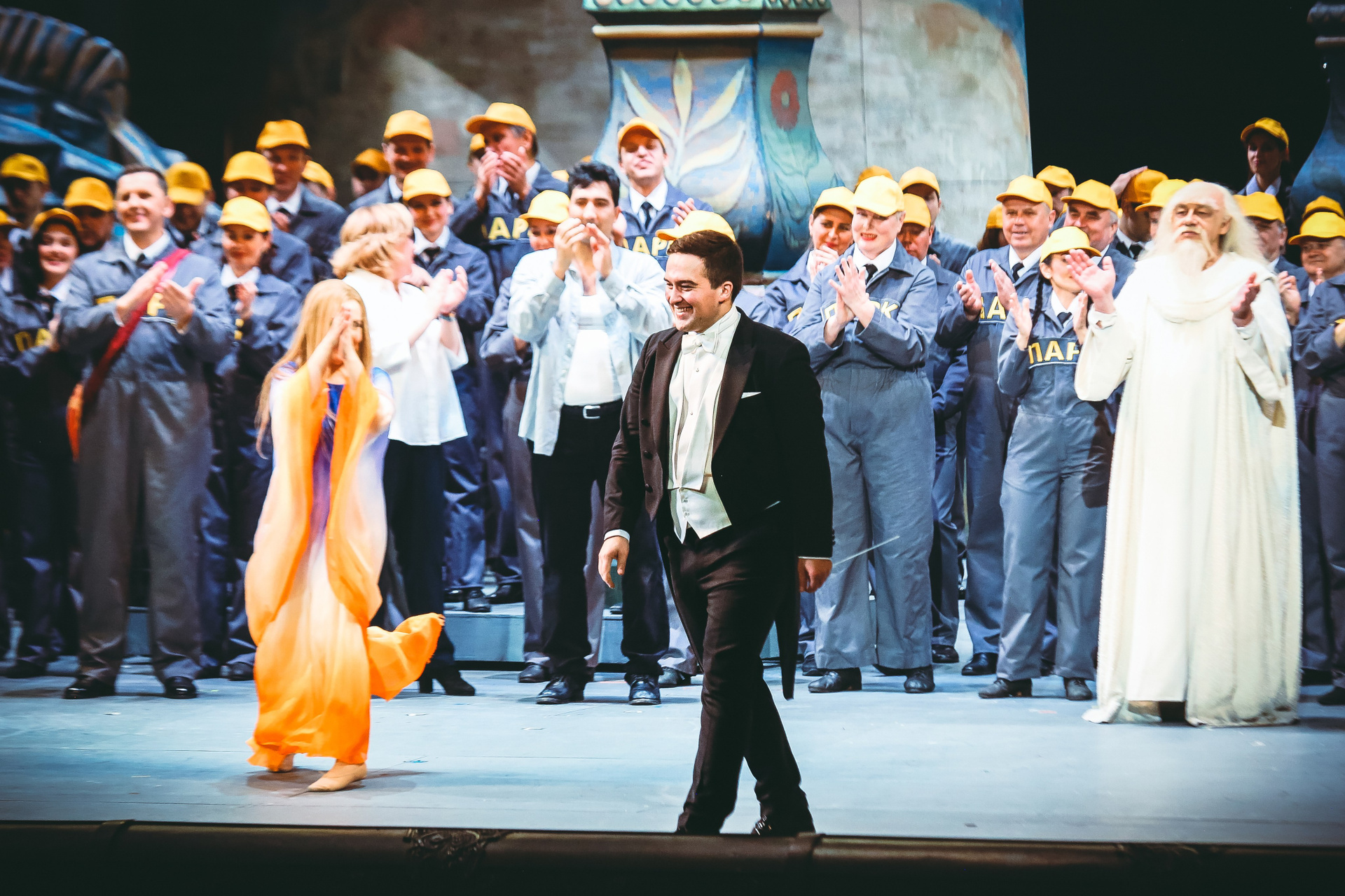 Зато главных героев набралось два состава. Если Екатерина Семенчук и Ксения Дудникова в вокальном и актерском плане выступили одинаково убедительно в роли Любавы, то из двух Волхов ближе мне оказалась Надежда Павлова — более изысканная, эмоциональная (и точно интонирующая), хотя стоит признать, что Аида Гарифуллина очень точно соответствовала необходимому образу гламурной дивы — ей тут даже играть особо не нужно, просто быть собой. Настоящих драматических теноров же, способных осилить требовательную партию Садко, сейчас днем с огнем не сыщешь, но тут, надо сказать, нам повезло: у Нажмиддина Мавлянова из первого состава, незаурядный талант и уникальный голос, будто созданный для данной партии, а Иван Гынгазов взял органичностью и драматическим дарованием, тем более задача была поставлена незаурядная — сыграть человека, который лишь изображает былинного Садко. Так что чутье не подвело Чернякова и позволило ему блестяще использовать типажи всех солистов.