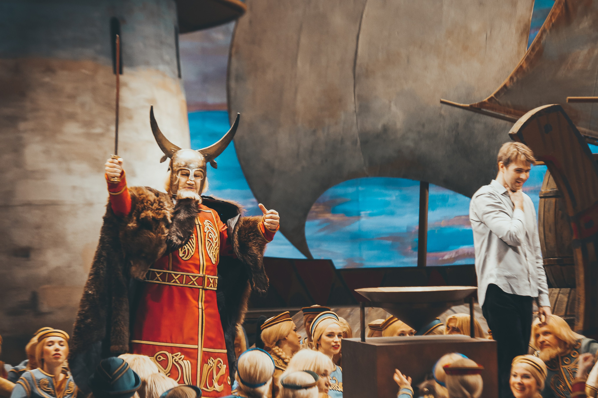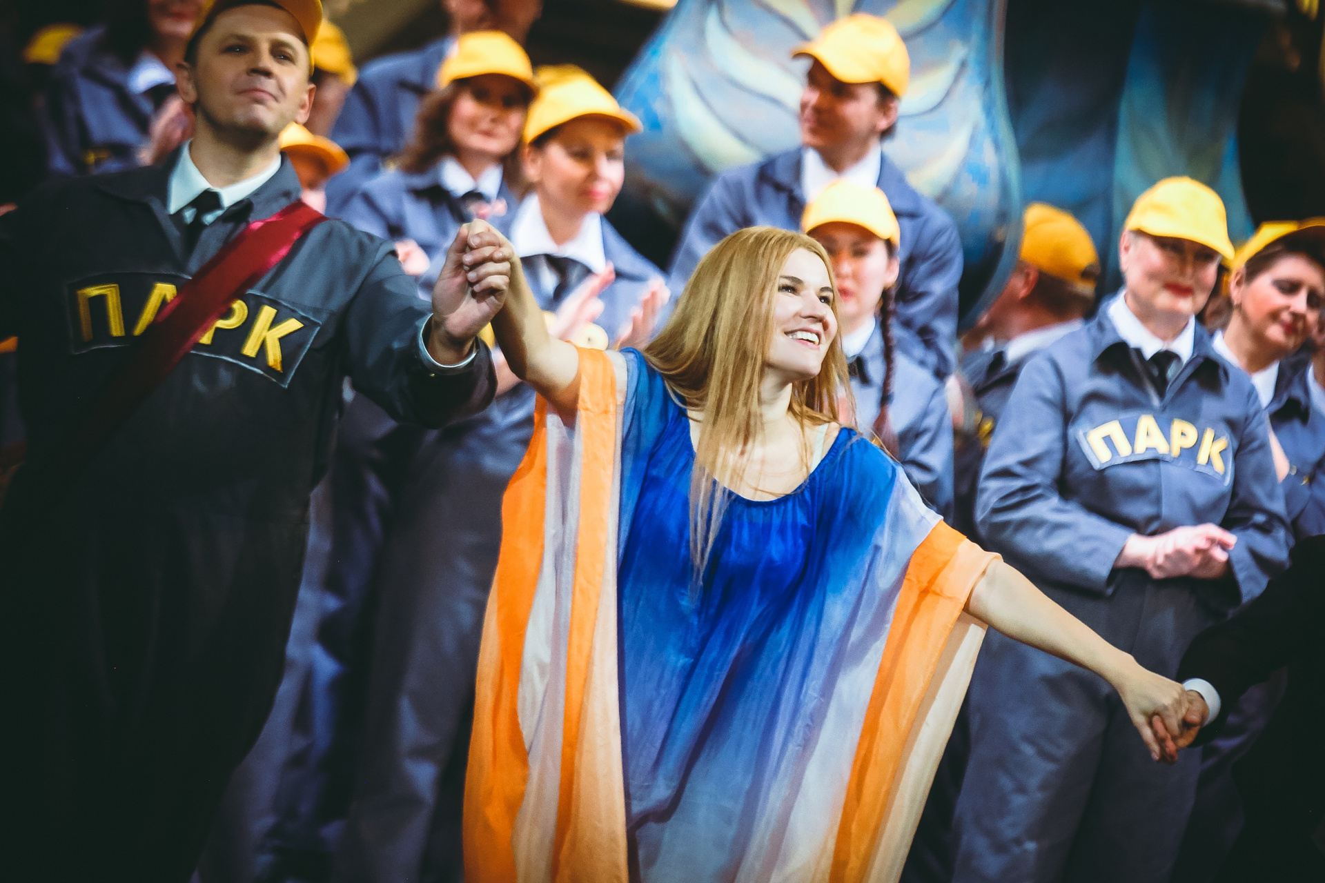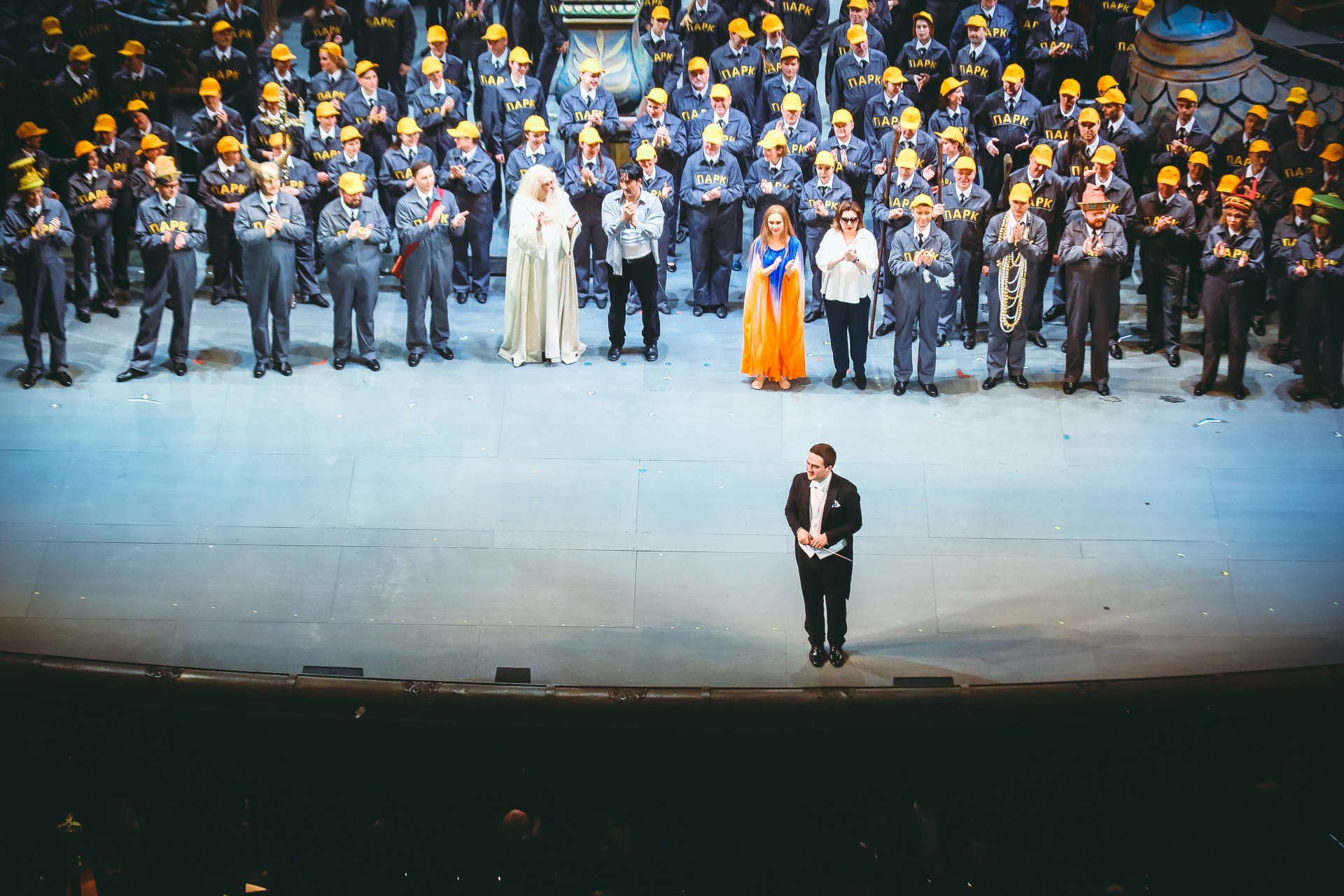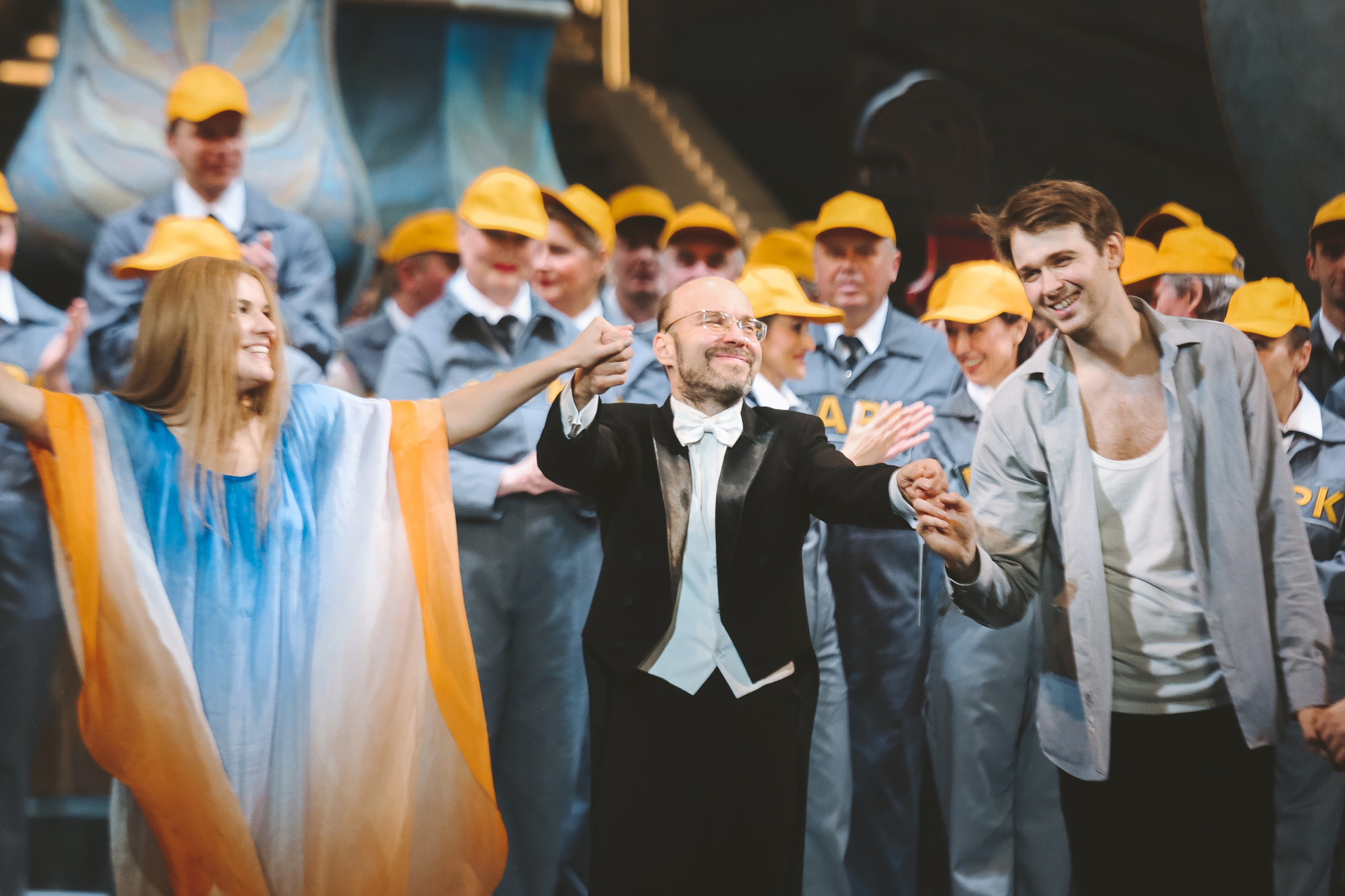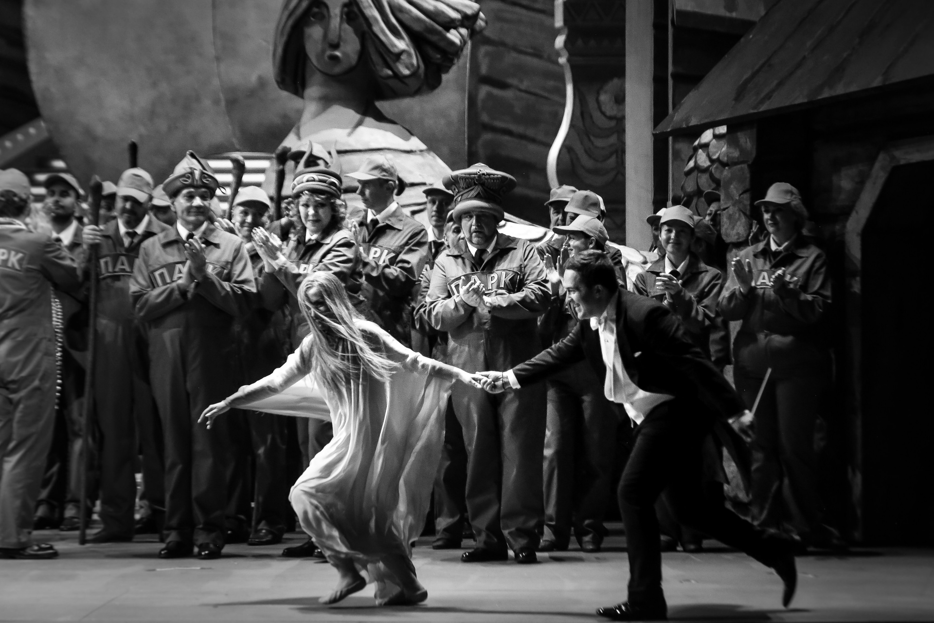 Зато главных героев набралось два состава. Если Екатерина Семенчук и Ксения Дудникова в вокальном и актерском плане выступили одинаково убедительно в роли Любавы, то из двух Волхов ближе мне оказалась Надежда Павлова — более изысканная, эмоциональная (и точно интонирующая), хотя стоит признать, что Аида Гарифуллина очень точно соответствовала необходимому образу гламурной дивы — ей тут даже играть особо не нужно, просто быть собой. Настоящих драматических теноров же, способных осилить требовательную партию Садко, сейчас днем с огнем не сыщешь, но тут, надо сказать, нам повезло: у Нажмиддина Мавлянова из первого состава, незаурядный талант и уникальный голос, будто созданный для данной партии, а Иван Гынгазов взял органичностью и драматическим дарованием, тем более задача была поставлена незаурядная — сыграть человека, который лишь изображает былинного Садко. Так что чутье не подвело Чернякова и позволило ему блестяще использовать типажи всех солистов.