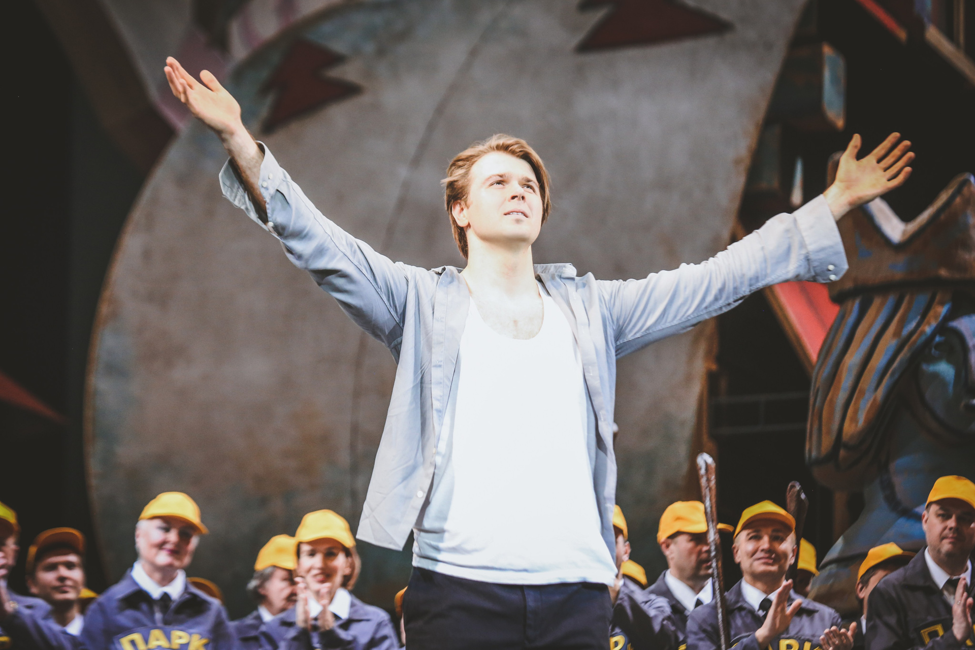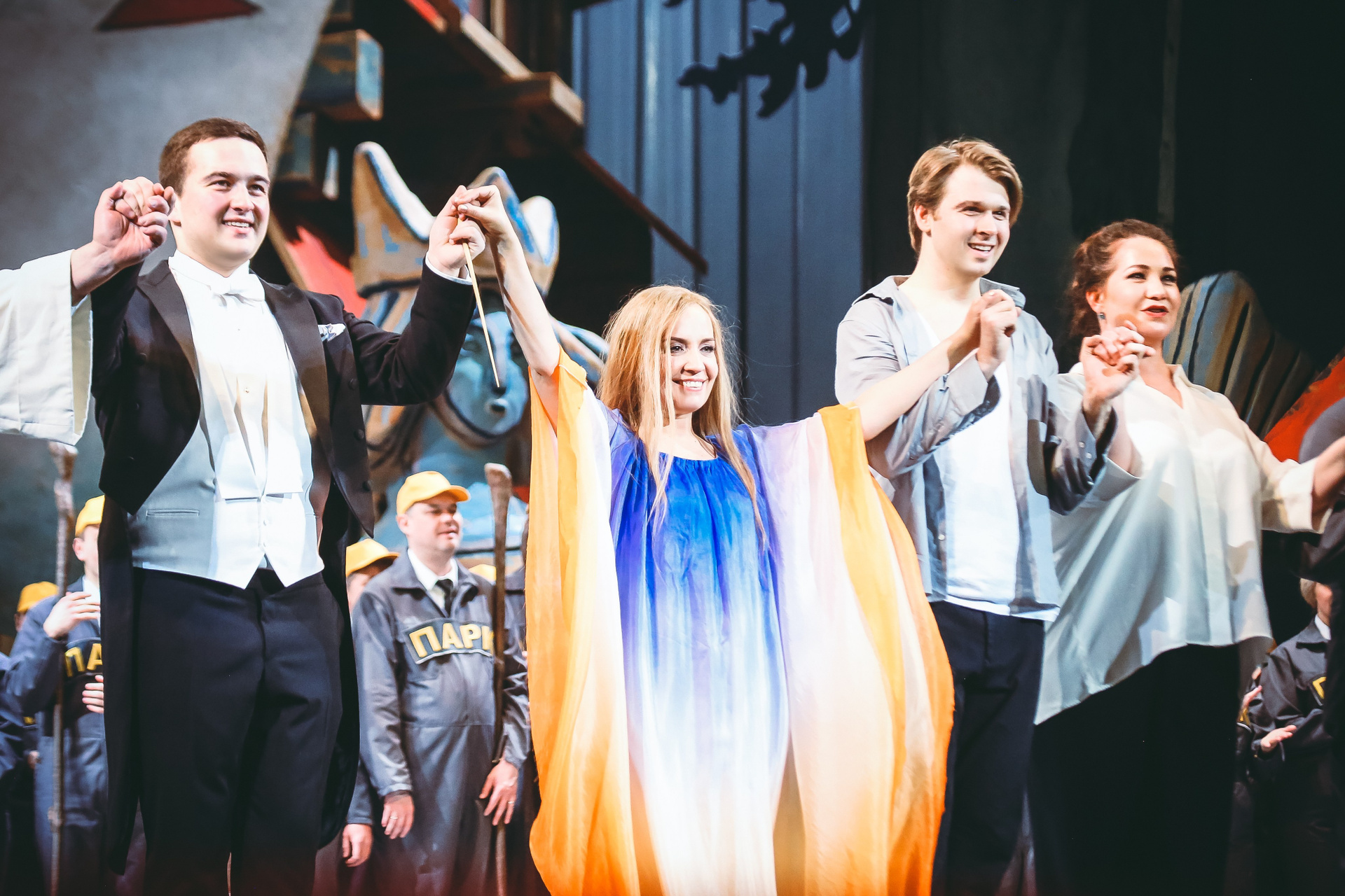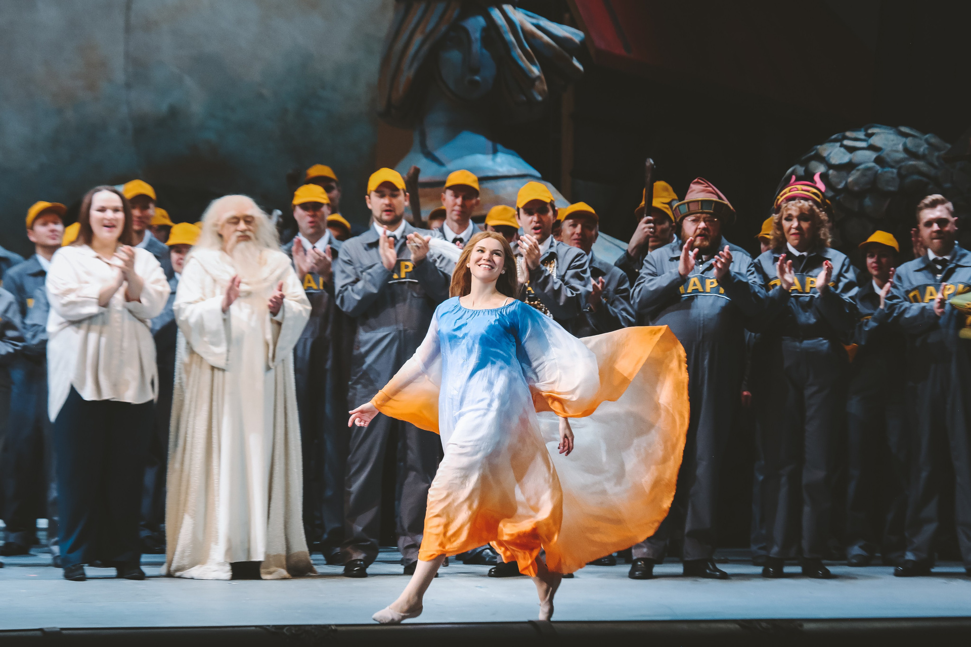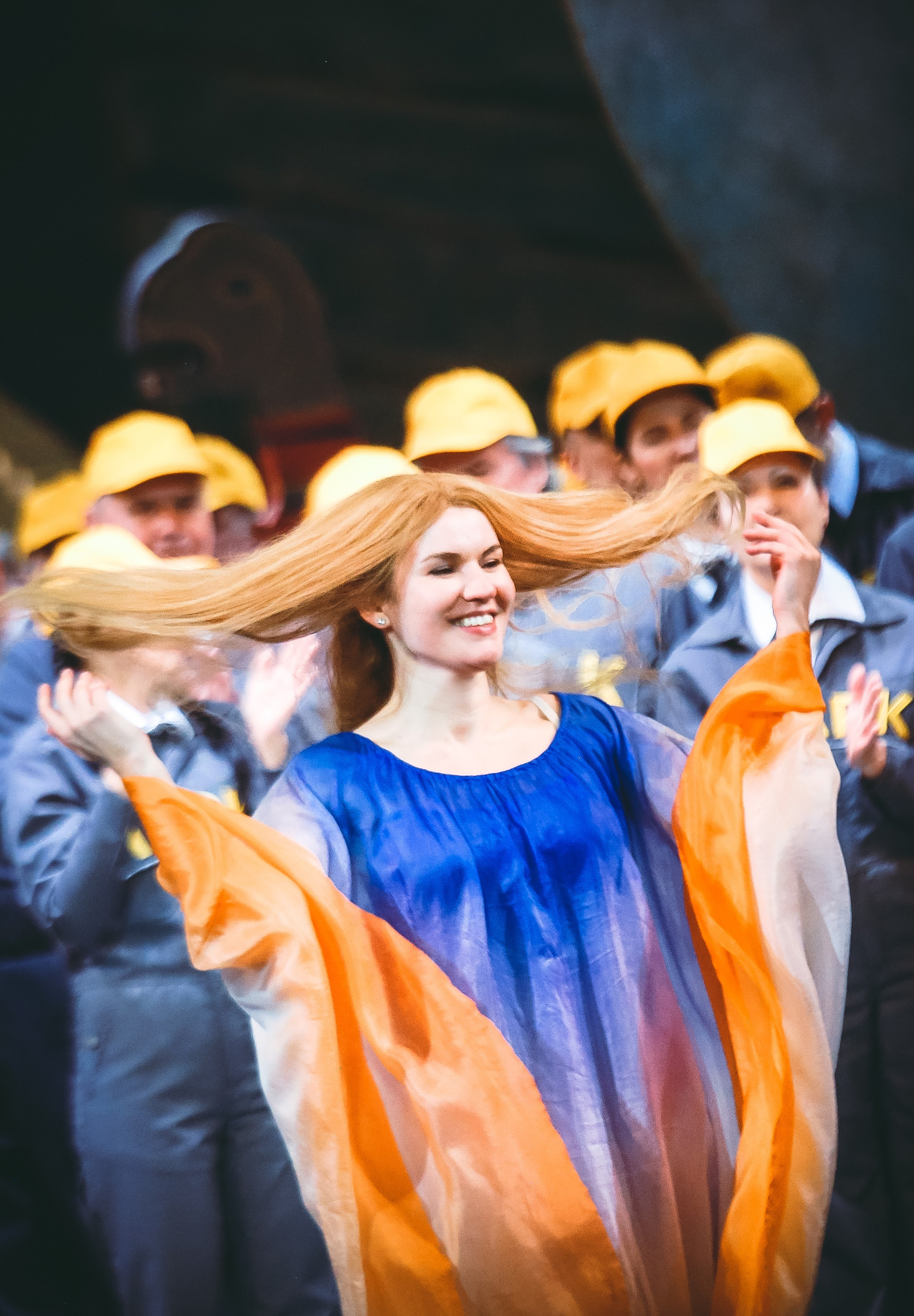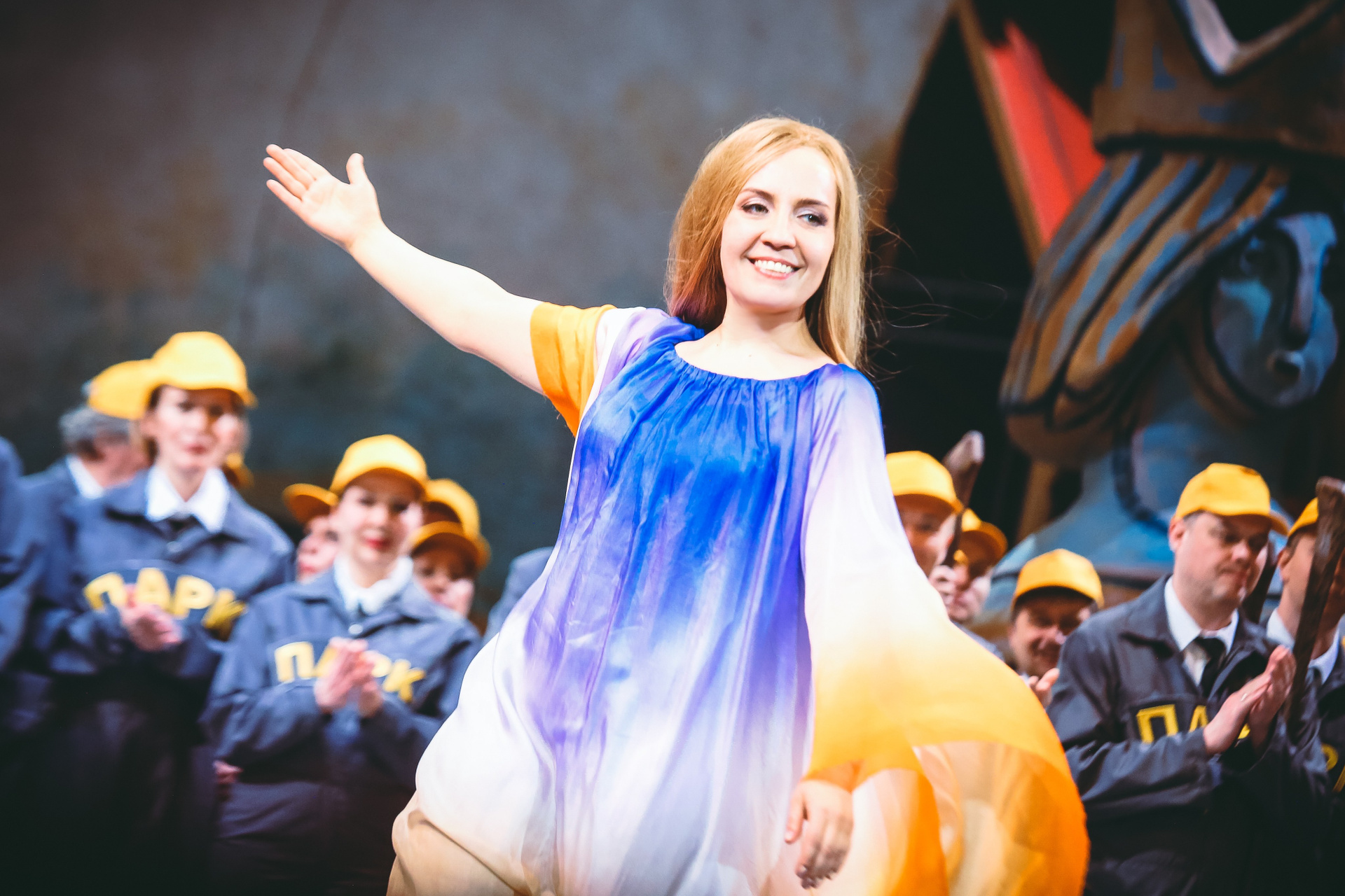 Зато главных героев набралось два состава. Если Екатерина Семенчук и Ксения Дудникова в вокальном и актерском плане выступили одинаково убедительно в роли Любавы, то из двух Волхов ближе мне оказалась Надежда Павлова — более изысканная, эмоциональная (и точно интонирующая), хотя стоит признать, что Аида Гарифуллина очень точно соответствовала необходимому образу гламурной дивы — ей тут даже играть особо не нужно, просто быть собой. Настоящих драматических теноров же, способных осилить требовательную партию Садко, сейчас днем с огнем не сыщешь, но тут, надо сказать, нам повезло: у Нажмиддина Мавлянова из первого состава, незаурядный талант и уникальный голос, будто созданный для данной партии, а Иван Гынгазов взял органичностью и драматическим дарованием, тем более задача была поставлена незаурядная — сыграть человека, который лишь изображает былинного Садко. Так что чутье не подвело Чернякова и позволило ему блестяще использовать типажи всех солистов.
