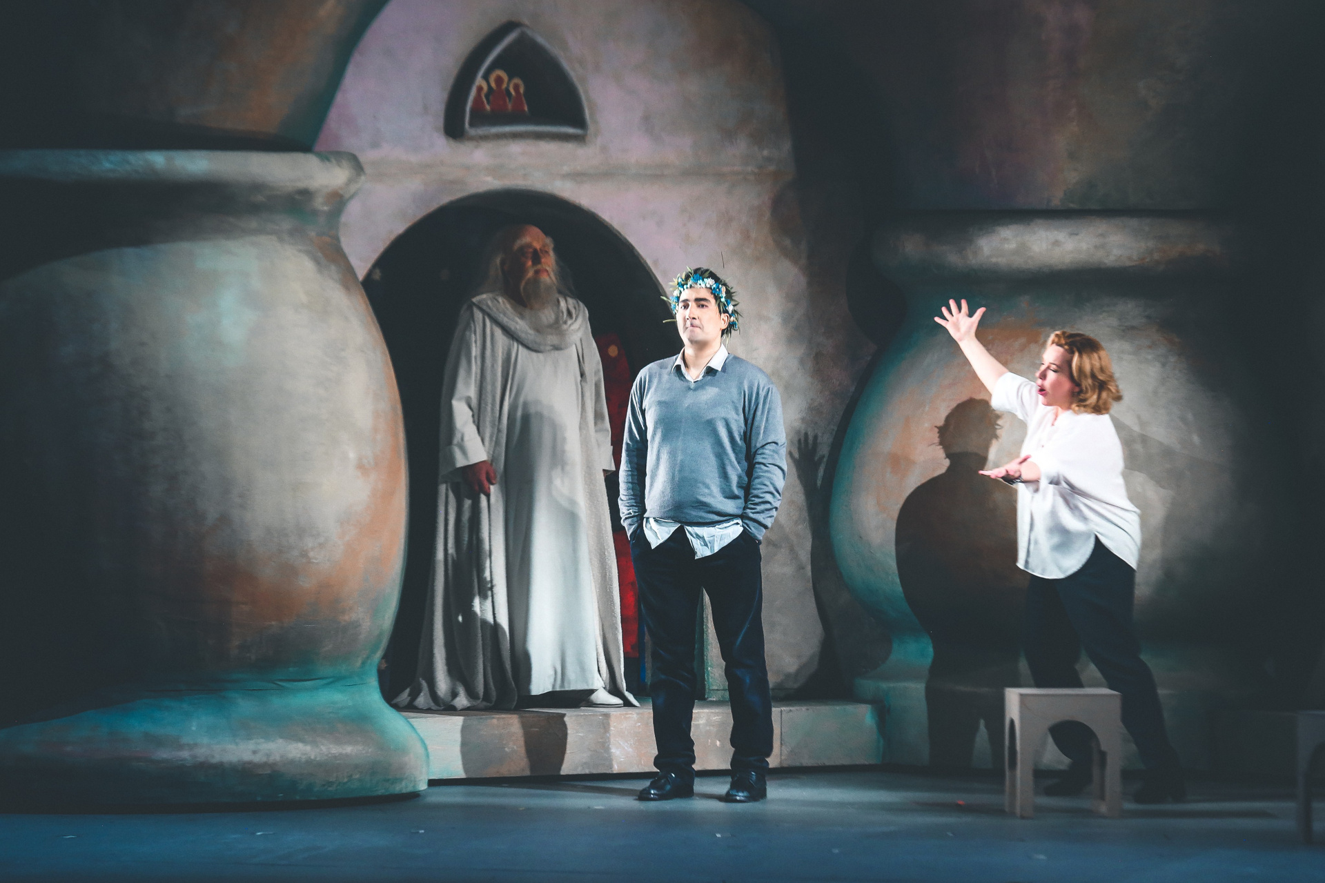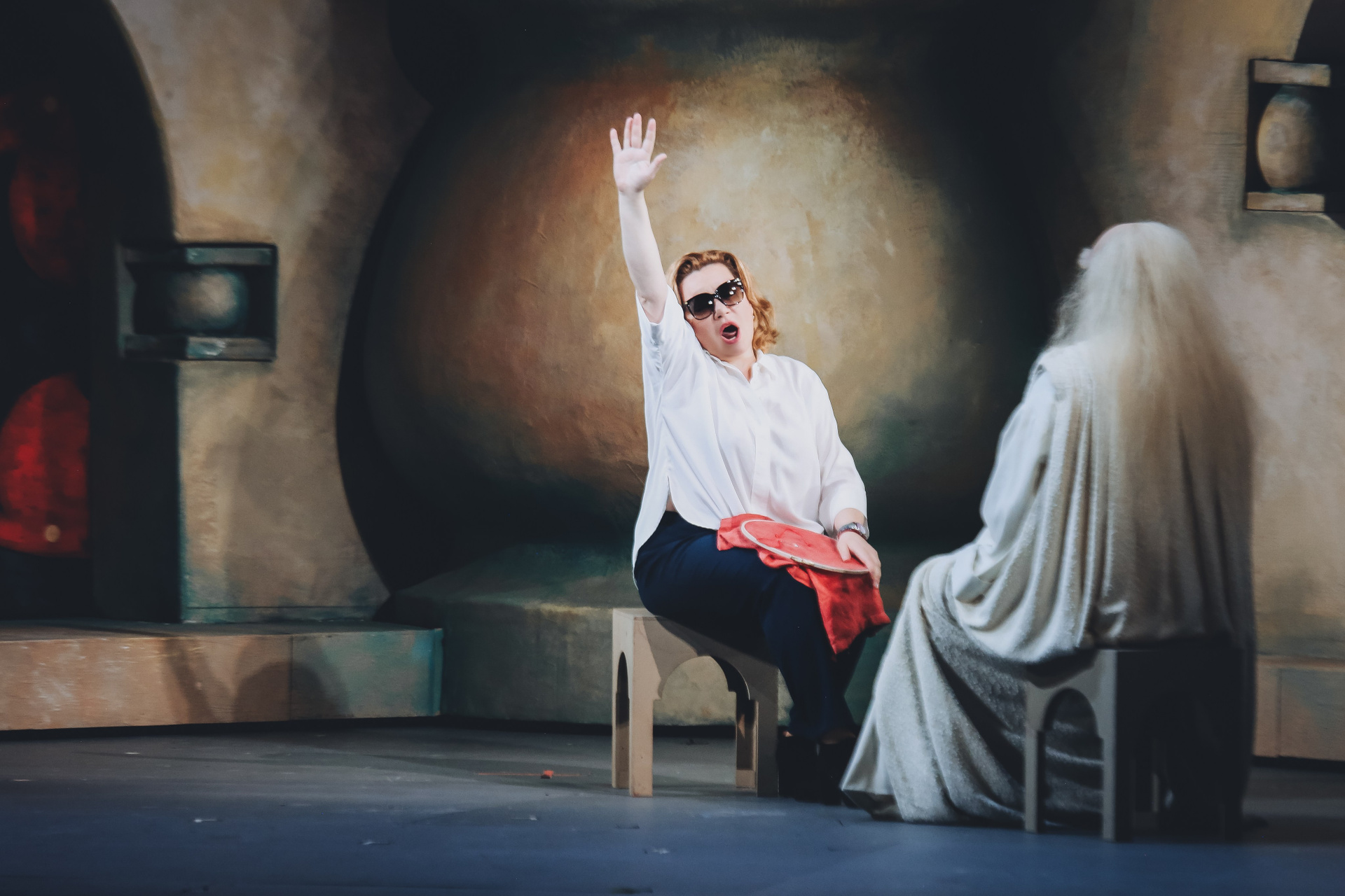 Впрочем, трое главных героев — наши современники по задумке режиссера — приходят в Парк не только ради забавы. За исключением разве что Волховы, которой лишь бы развлечься да окунуться в пучину страсти. Любава же хочет избавиться от синдрома вечной брошенки, Садко — почувствовать себя былинным героем, побороть страхи и обрести уверенность. Но по большому счету каждый жаждет сбежать от реальности и разобраться в себе. Их персональным Вергилием, помогающим сориентироваться в сказочном пространстве парка, становится Старчище — внешне копия Старца Фура из «Форта Боярд», логично — у нас ведь квест. Но вместе с персонажами его проходят и зрители, чтобы ответить на тот же вопрос, что и герои в видеопреамбуле: «Зачем вы здесь?» — то есть с какой целью в наши дни люди в принципе приходят в оперный театр.