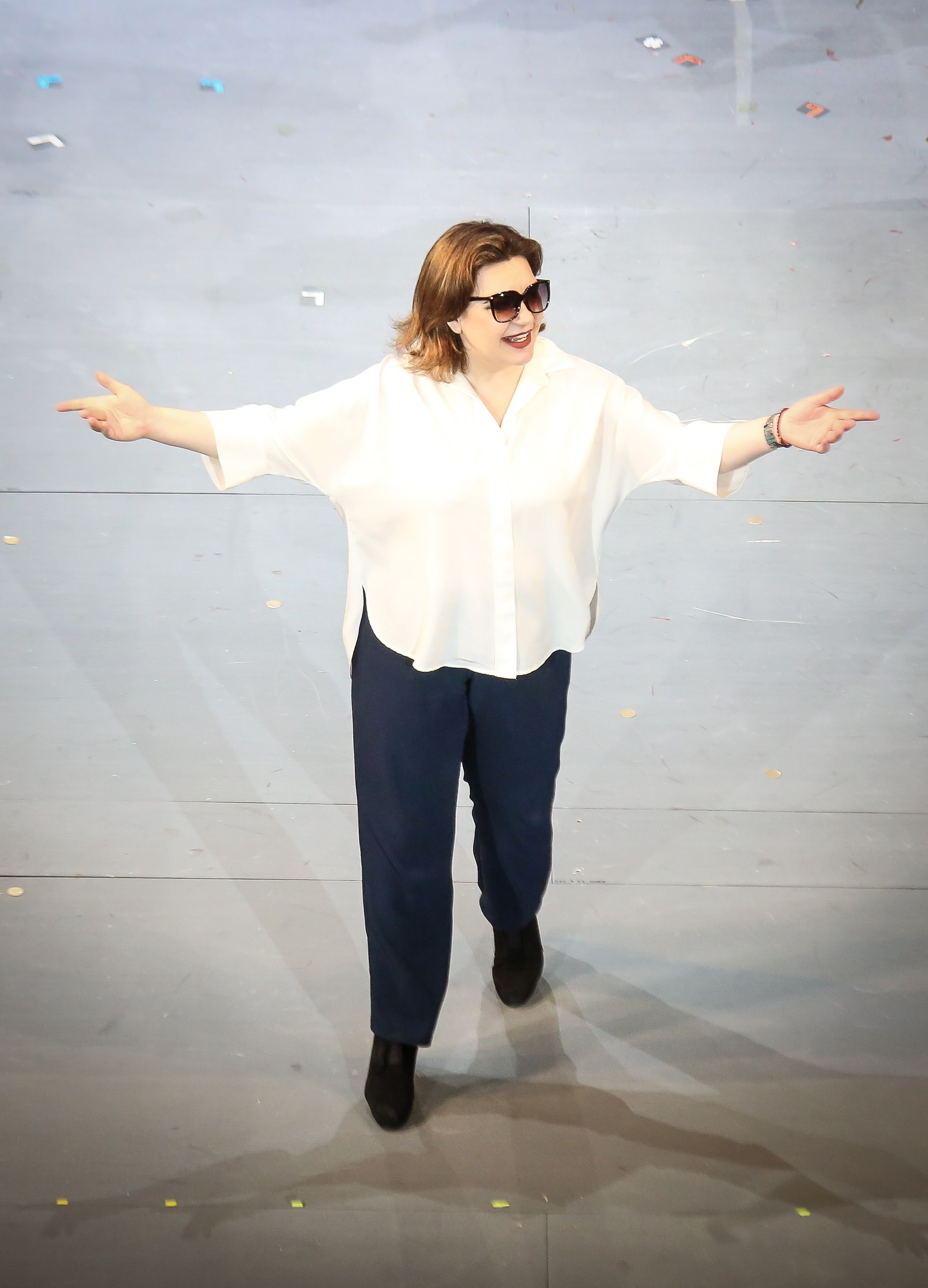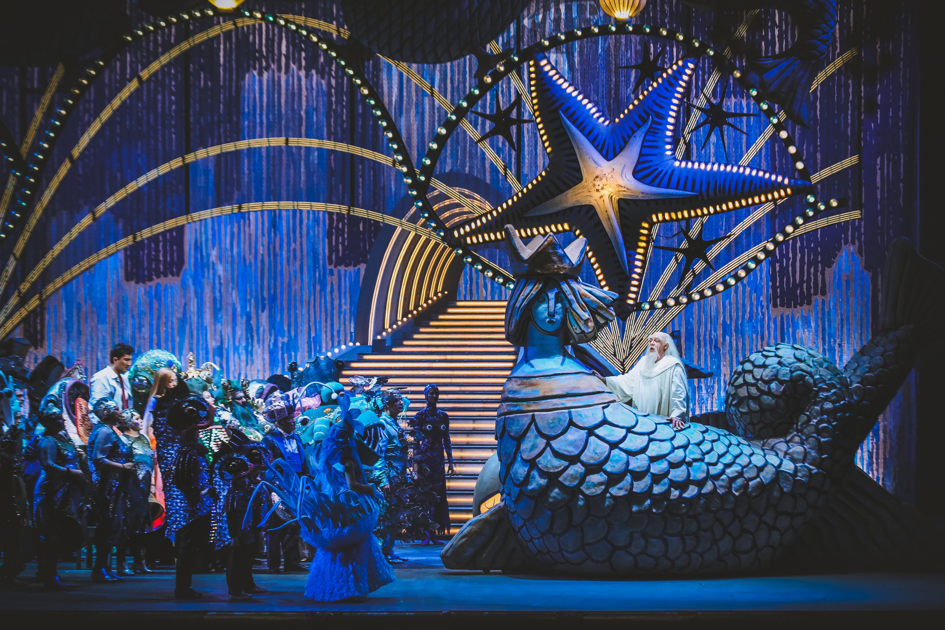 После такого тотального провала и унижения неудивительно, что Садко остается наедине с алкоголем и суицидальными мыслями (именно потому хор корабельщиков звучит за сценой), и лишь Волхова приводит неудачливого возлюбленного в чувство, буквально вытаскивая из петли и увлекая в свой подводный мир. Очевидно, рожденный ее собственной фантазией, потому отражающий представления гламурной дивы о прекрасном: неоновый дворец, безвкусные фанерные декорации, намеренно гротескные и словно одолженные в провинциальном ТЮЗе уморительные костюмы морских жителей (художник Елена Зайцева постаралась на славу!). Эта картина настоящий апофеоз бутафории, в ней Черняков пародирует и осеннего «Салтана» Франдетти в БТ, и десятки других спектаклей, поп-концертов, модных показов, да и сам себя. Чудятся тут даже намеки на вычурный Остров Мечты (вот уж точно спектакль на злобу дня!), который только открылся в Нагатинской пойме, и в целом на страсть нынешнего градоначальства к бездумному украшательству. Поразительно, что многие зрители приняли эту мишуру за чистую монету, в то время как режиссер, виртуозно работая с эстетикой китча, подтрунивает над преувеличенной роскошью оперы большого стиля. И вместе с тем признается ей в любви.