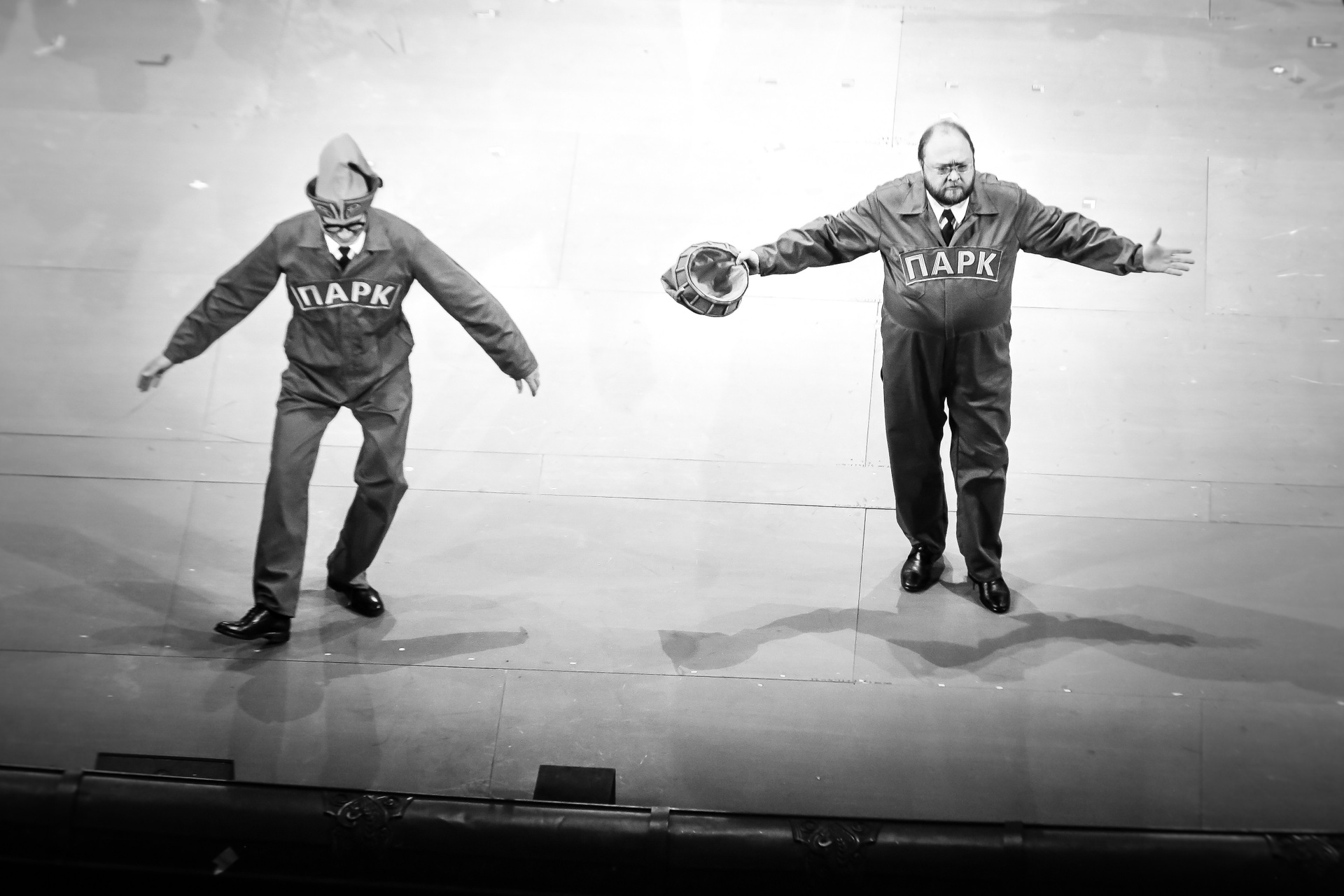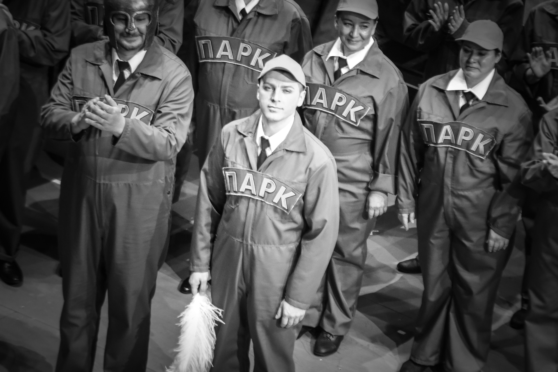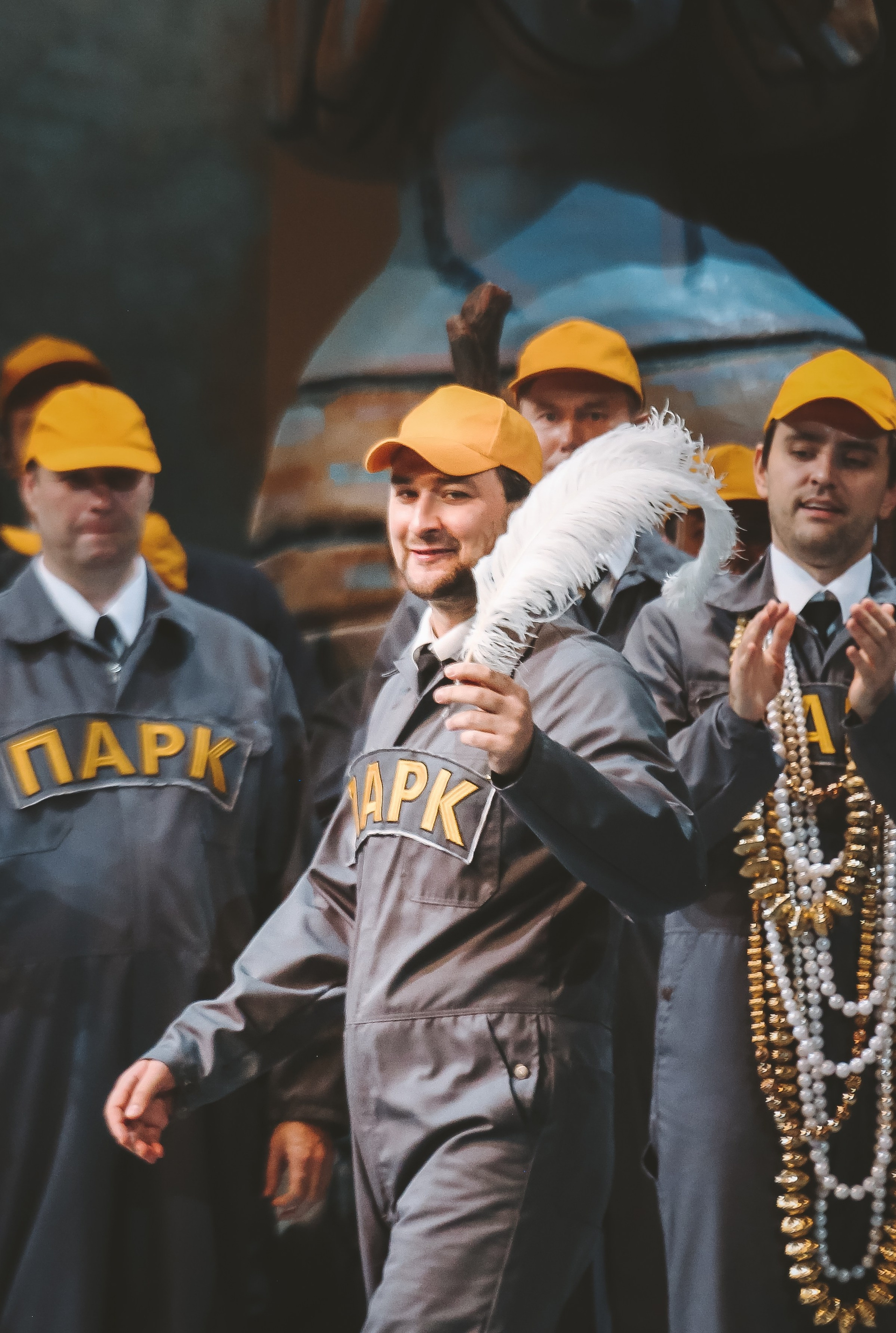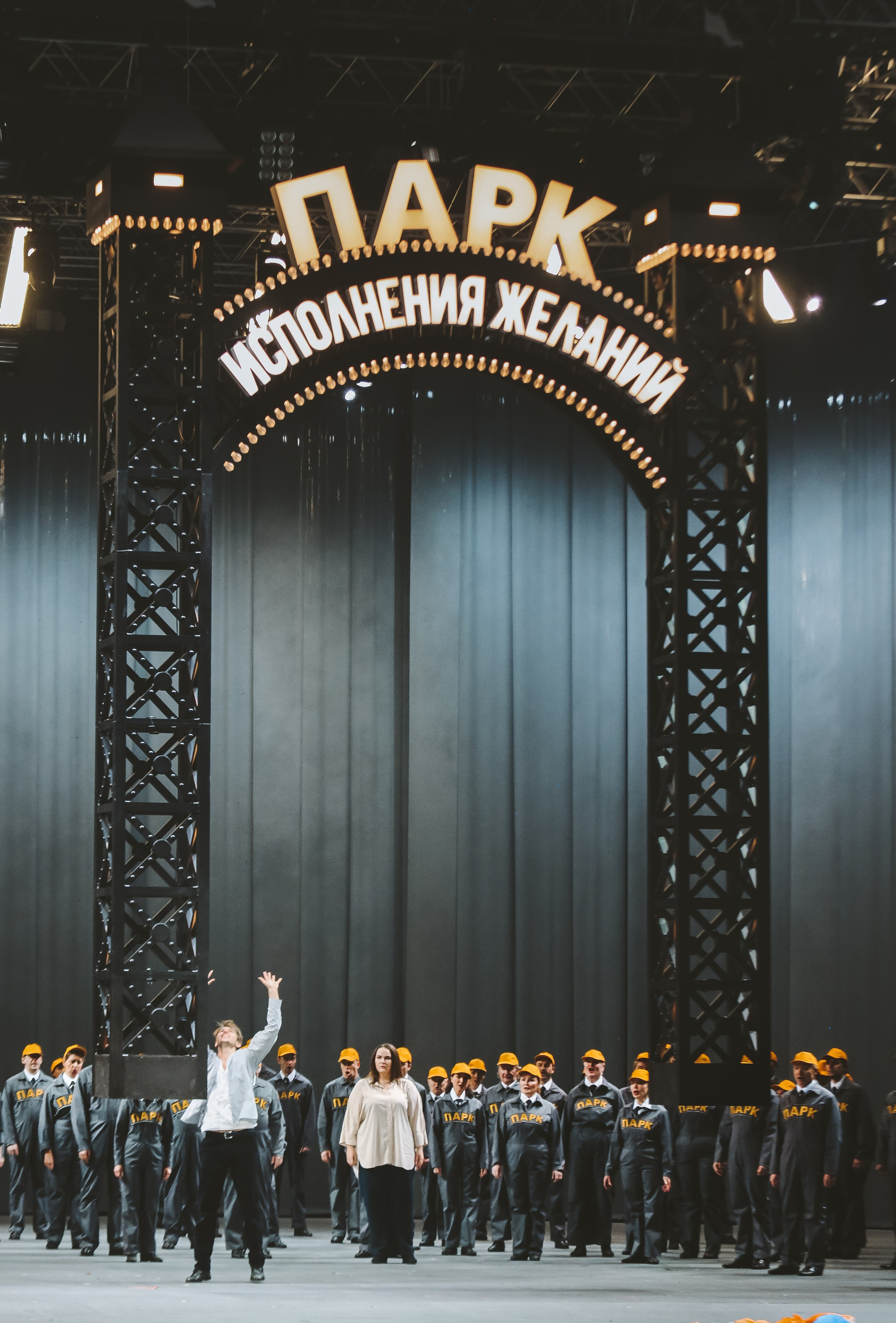 В «Садко» Черняковым придуман гигантский аттракцион — Парк исполнения желаний, в котором разыгрывается сюжет былины. Естественно, источники и параллели тут бесчисленны: приходит на ум и «Шоу Трумана», и «Парк советского периода», и сериал «Westworld». Могу поспорить, режиссер использовал также свой опыт посещения съемок «Дау» Ильи Хржановского. Несколько лет назад в рамках данного арт-проекта, изменившего мир кинематографа, в Харькове построили исполинских размеров декорацию — Институт, ставший не только съемочной площадкой, но и жилым пространством для команды фильма, в которой не было почти ни одного профессионального актера. Все попадавшие в Институт участники съемок — ученые, писатели, музыканты, гэбэшники, уборщики — оставались сами собой, однако должны были жить по законам советского времени и подчиняться придуманной легенде. Всё настоящее и в то же время нет: чувства подлинные, диалоги импровизированные, люди самостоятельно управляют тем, что говорят и делают, — однако по-прежнему находятся в условном мире кино. В данном жанре «Дау» является, пожалуй, самым небывалым альянсом вымысла и реальности, но при этом вопрос этичности происходившего до сих пор остается открытым, а многие участники покидали проект психологически сломленными. Спойлер — схожий финал ждет и черняковского Садко.