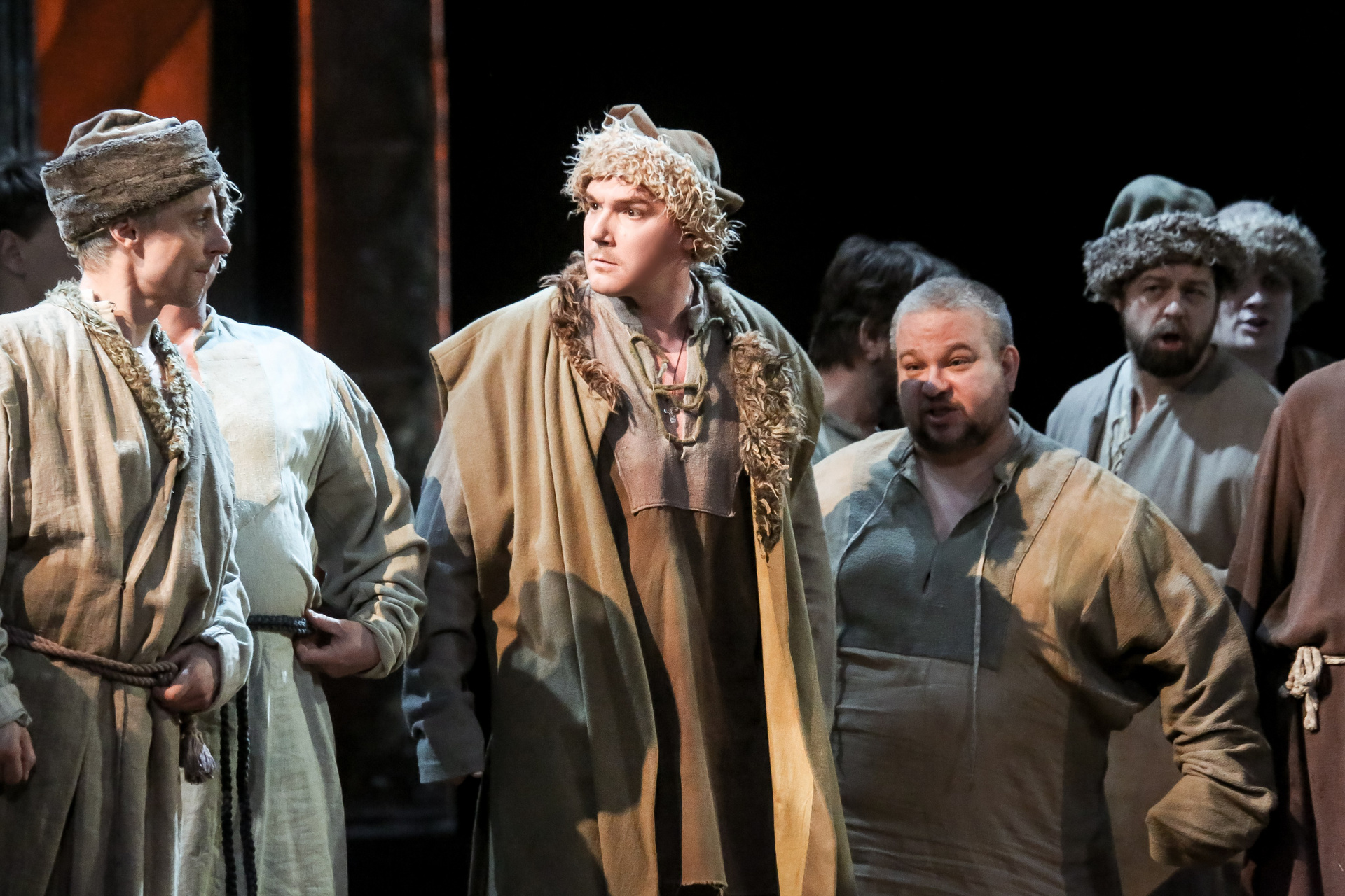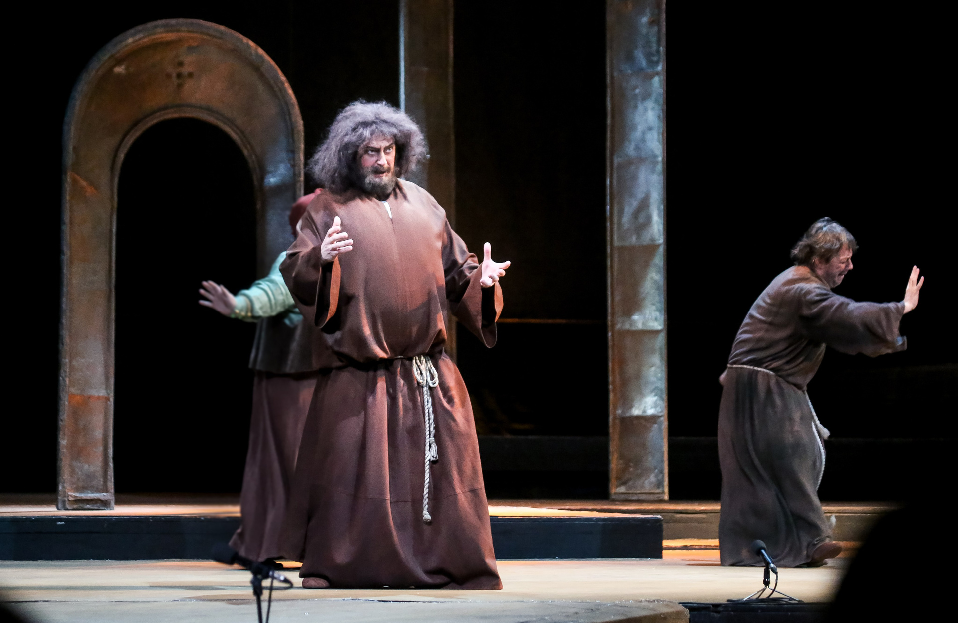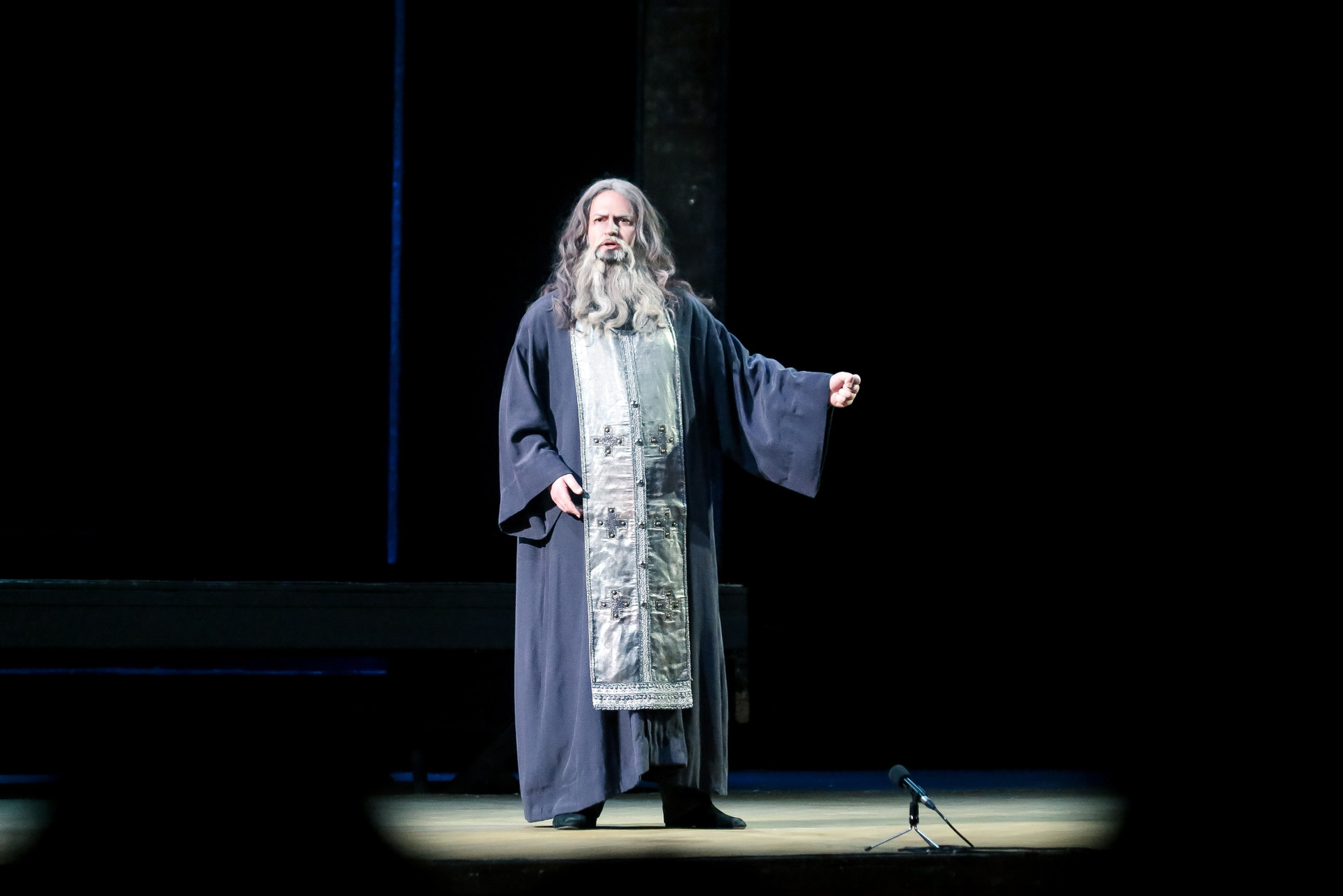 Но если «Аида» это спектакль, который почему-то стыдливо притворяется концертным исполнением, то «Годунов» напротив постановка, вызывающая ощущение некой недосказанности и недоделанности. Да, здесь в наличии вполне традиционные костюмы, кочующие из одного воплощения оперы в другое: шапка Мономаха, боярские шубы, монашеские подрясники и крестьянские рубища — получите, распишитесь. Правда, сценическое оформление при этом не напоминает пышные эпические декорации в духе Федоровского, а наоборот предельно лаконично: опускающиеся и поднимающиеся подвесные конструкции символизируют и апсиды соборов, и дворцовые своды, и оклады икон, а через оркестровую яму по обеим сторонам перекинуты помосты, куда выходят герои исполнять свои монологи, — на том, в общем-то, и всё. Впрочем, это большое пустое пространство преображает и заставляет «играть» волшебный изменчивый свет мастера своего дела Глеба Фильштинского.
