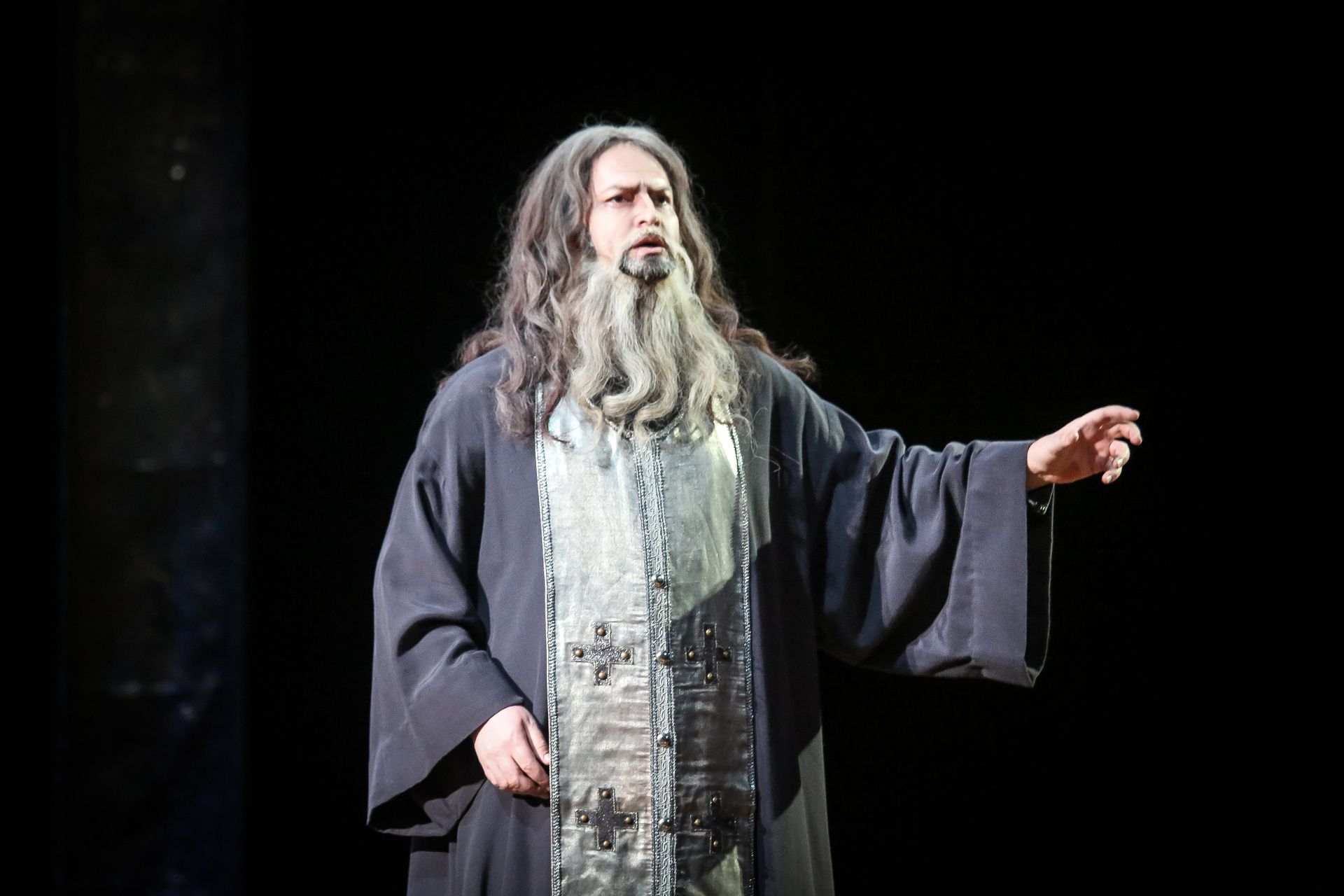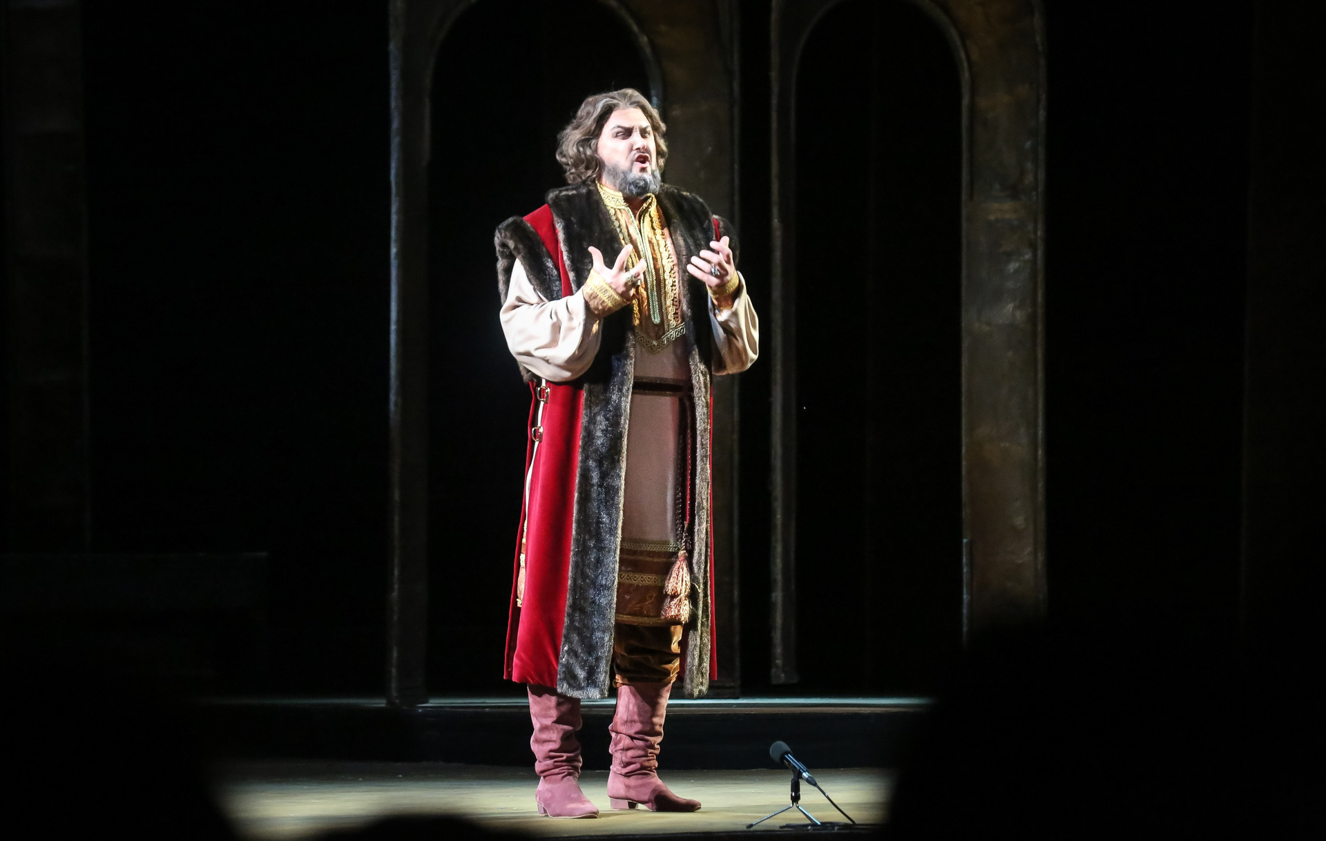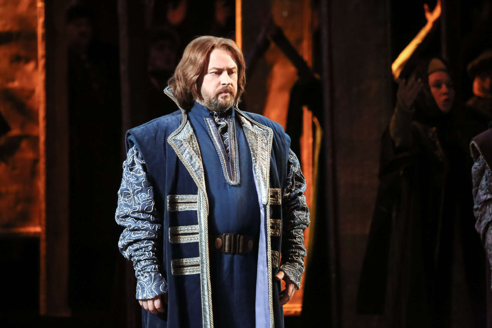 Но если «Аида» это спектакль, который почему-то стыдливо притворяется концертным исполнением, то «Годунов» напротив постановка, вызывающая ощущение некой недосказанности и недоделанности. Да, здесь в наличии вполне традиционные костюмы, кочующие из одного воплощения оперы в другое: шапка Мономаха, боярские шубы, монашеские подрясники и крестьянские рубища — получите, распишитесь. Правда, сценическое оформление при этом не напоминает пышные эпические декорации в духе Федоровского, а наоборот предельно лаконично: опускающиеся и поднимающиеся подвесные конструкции символизируют и апсиды соборов, и дворцовые своды, и оклады икон, а через оркестровую яму по обеим сторонам перекинуты помосты, куда выходят герои исполнять свои монологи, — на том, в общем-то, и всё. Впрочем, это большое пустое пространство преображает и заставляет «играть» волшебный изменчивый свет мастера своего дела Глеба Фильштинского.