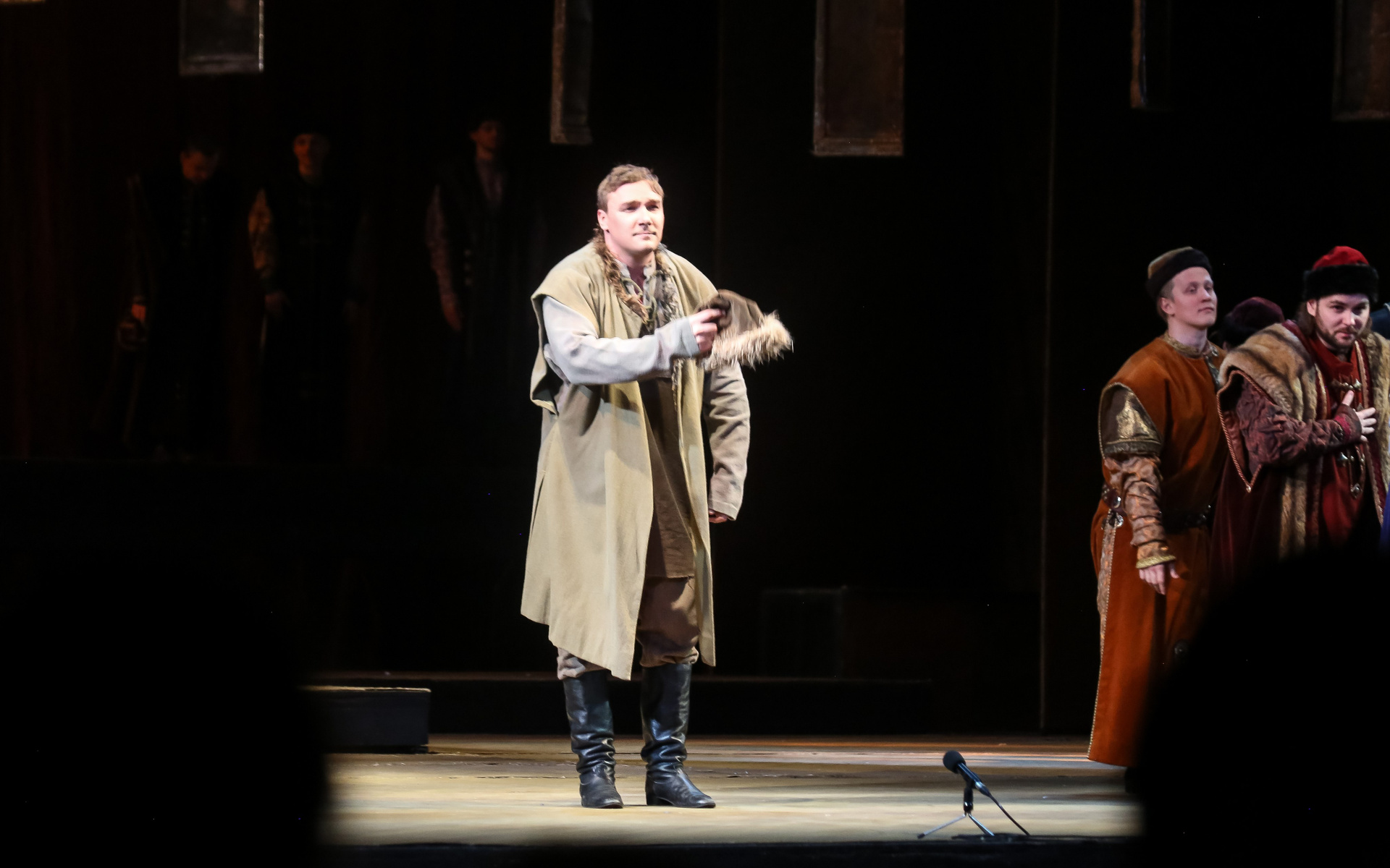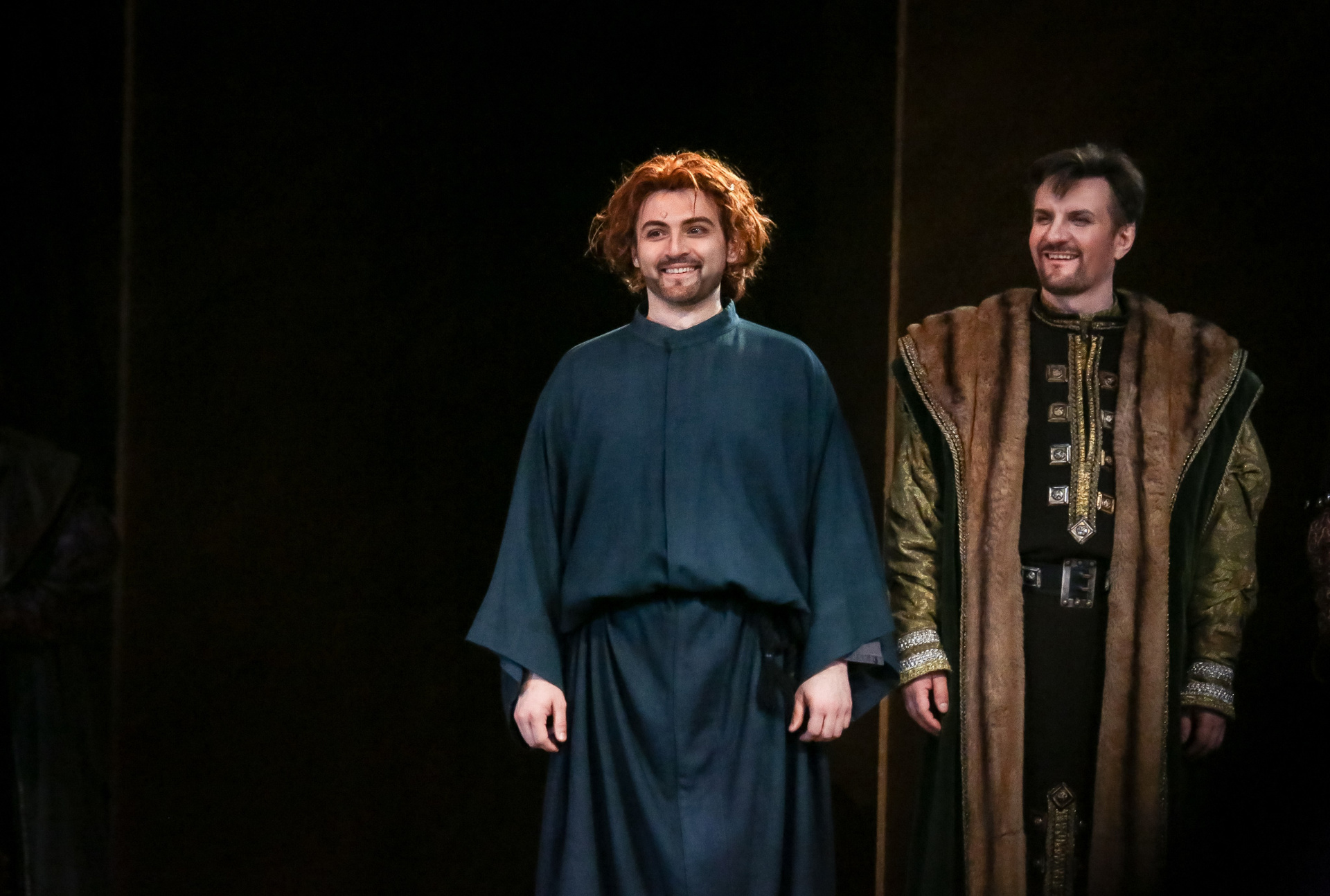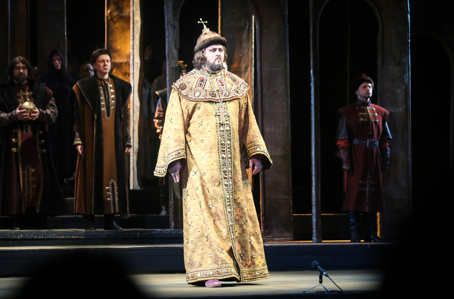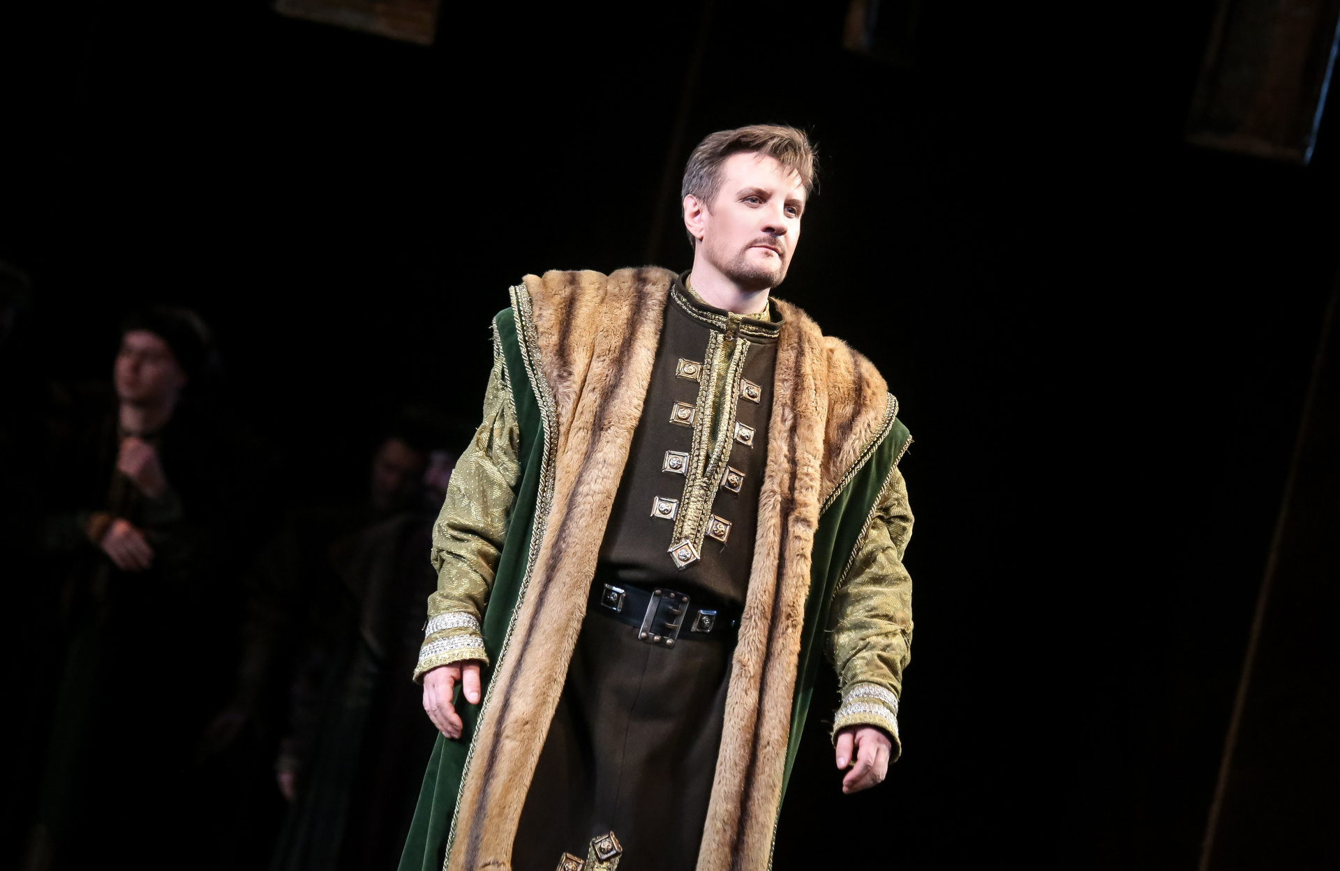Нежданным и щедрым подарком стало выступление Евгения Ставинского в роли Пимена — красивый свободный голос солиста вкупе с величественной статью очень выразительно напоминали, кстати, о том, что его герой не всю жизнь провел благочестивым отшельником, а «воевал под башнями Казани, рать Литвы при Шуйском отражал, видел двор и роскошь Иоанна…» и свою спокойную мудрость обрел как раз-таки в испытаниях. Его сцена с Отрепьевым стала одной из самых запоминающихся в спектакле, а финал с рассказом Пимена (который не просто смиренный старец, а бывший воин, что приходит рассчитаться) и смертью Бориса Годунова в принципе превратился в настоящий басовый бенефис. Тем более заглавную роль исполнял Алексей Тихомиров. И тут можно было бы долго рассуждать о душевной экспрессии, тончайшей психологической и вокальной отделке, где каждый звук оттеняет глубину переживаний Бориса… Но всё это будет неполным и недостаточным. Потому как сложно даже объяснить, где заканчивается солист и начинается образ: то ли он идеально заточен под роль, то ли она под Алексея. Самая точная характеристика нашлась в антракте в обсуждениях с друзьями: «царь, который играет человека, который играет царя!»