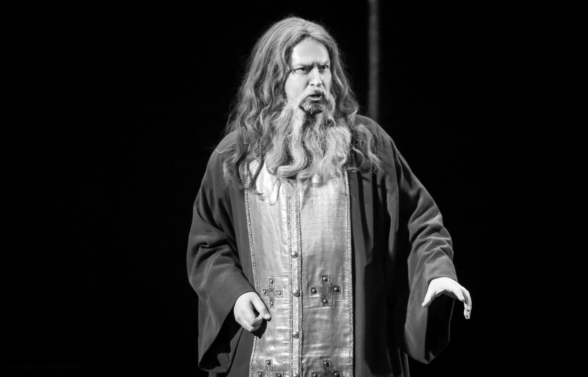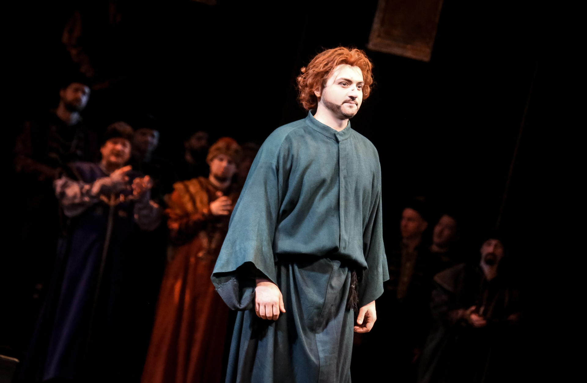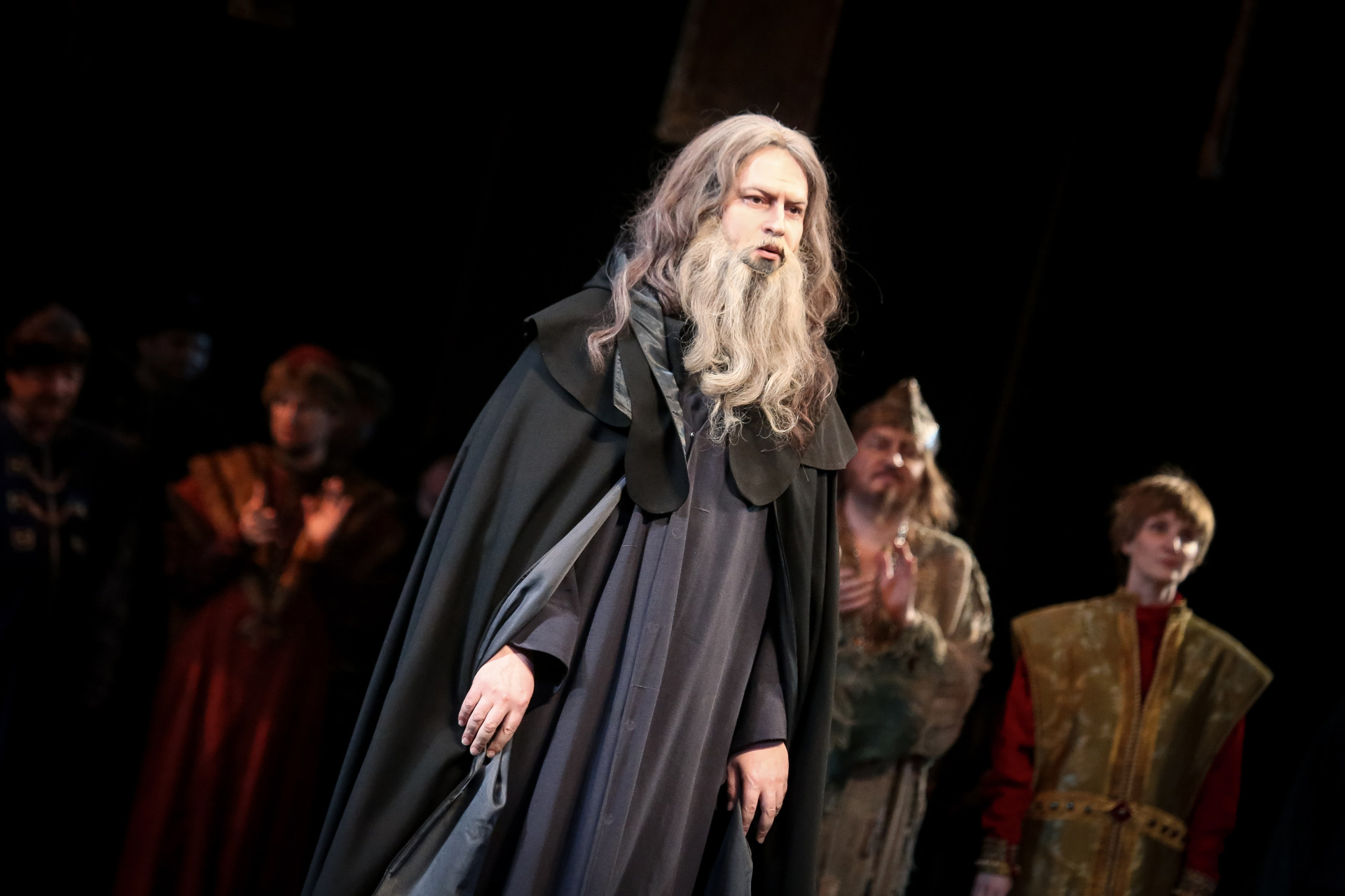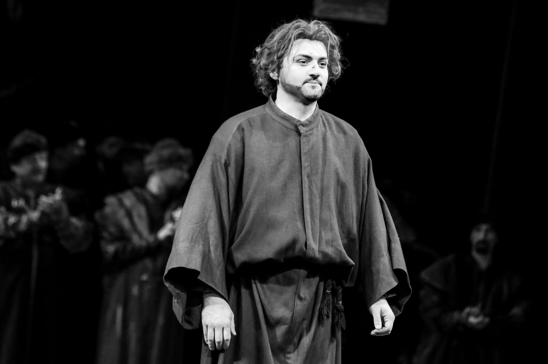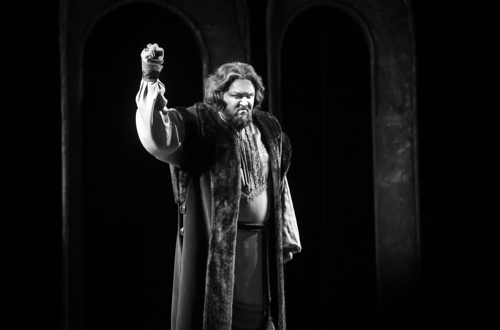 Нежданным и щедрым подарком стало выступление Евгения Ставинского в роли Пимена — красивый свободный голос солиста вкупе с величественной статью очень выразительно напоминали, кстати, о том, что его герой не всю жизнь провел благочестивым отшельником, а «воевал под башнями Казани, рать Литвы при Шуйском отражал, видел двор и роскошь Иоанна…» и свою спокойную мудрость обрел как раз-таки в испытаниях. Его сцена с Отрепьевым стала одной из самых запоминающихся в спектакле, а финал с рассказом Пимена (который не просто смиренный старец, а бывший воин, что приходит рассчитаться) и смертью Бориса Годунова в принципе превратился в настоящий басовый бенефис. Тем более заглавную роль исполнял Алексей Тихомиров. И тут можно было бы долго рассуждать о душевной экспрессии, тончайшей психологической и вокальной отделке, где каждый звук оттеняет глубину переживаний Бориса… Но всё это будет неполным и недостаточным. Потому как сложно даже объяснить, где заканчивается солист и начинается образ: то ли он идеально заточен под роль, то ли она под Алексея. Самая точная характеристика нашлась в антракте в обсуждениях с друзьями: «царь, который играет человека, который играет царя!»