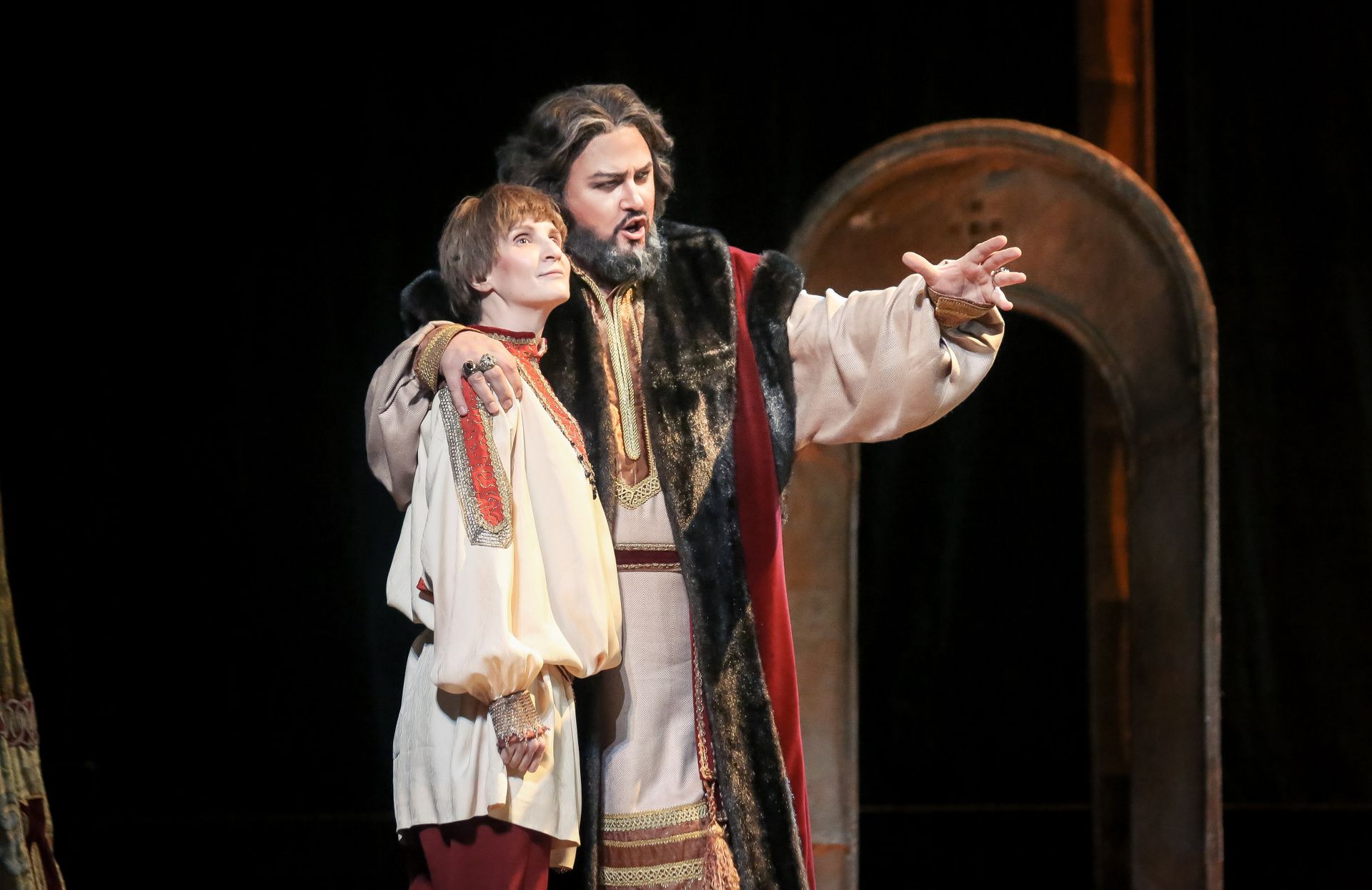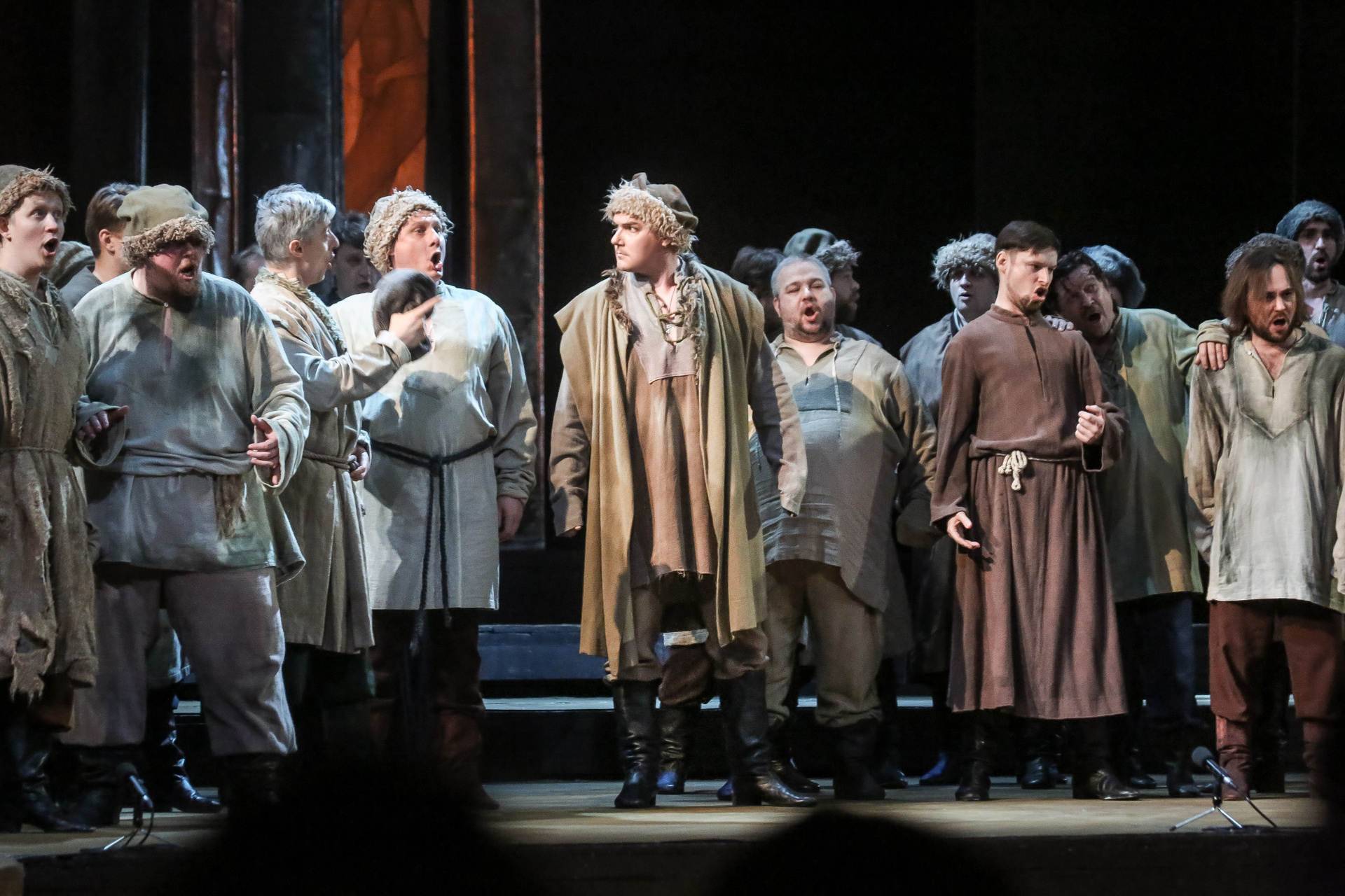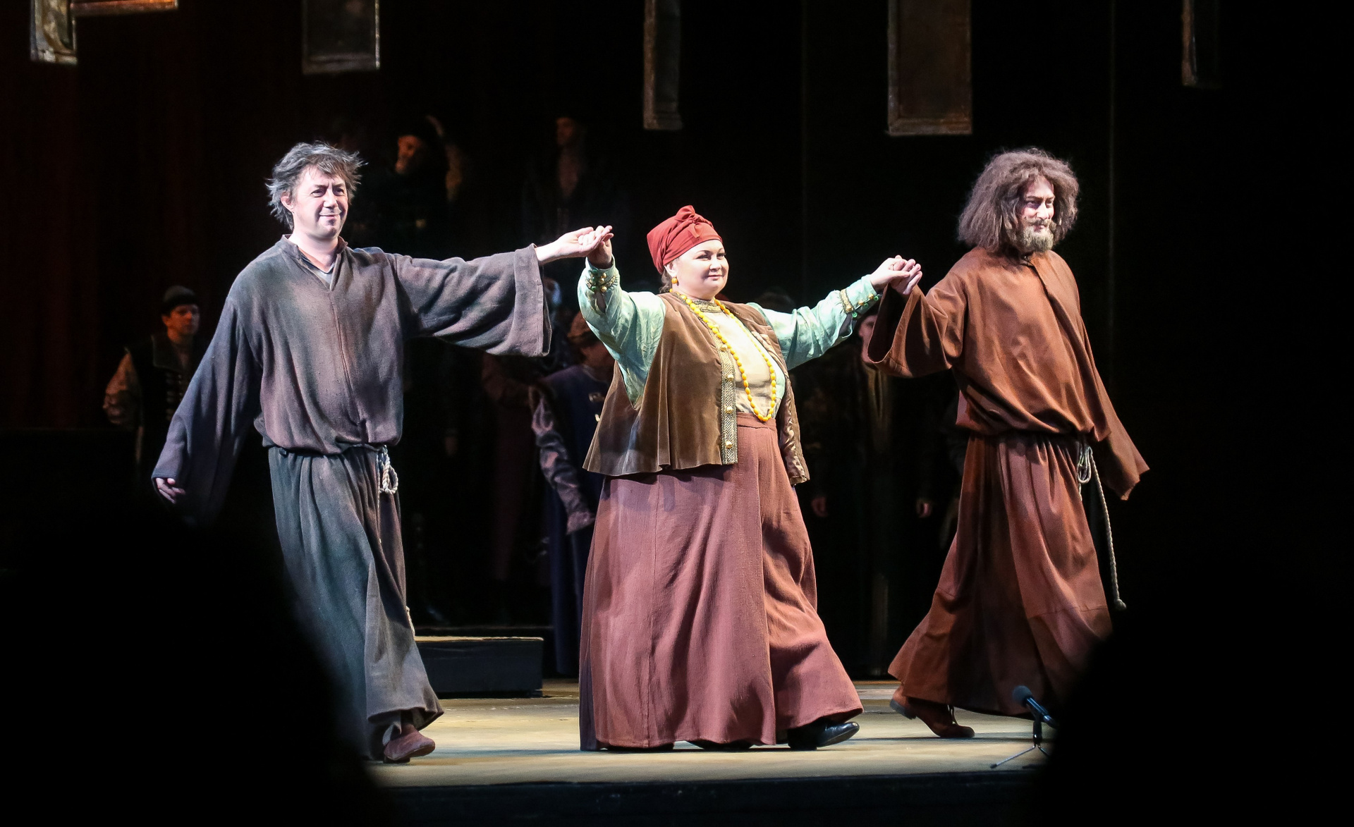 Сгладить такие неуместности, оправдать всё и наполнить смыслом может лишь сильный состав исполнителей — настоящих поющих актеров. И подобный ансамбль мечты случился в Новой опере 23 марта — не иначе в честь прошедшего за два дня до этого 180-летнего юбилея Модеста Петровича! Идеальные попадания вышли и в больших, и в маленьких ролях — даже грубоватый звук Олега Шагоцкого вписался именно так, как следует, в партию Пристава, эпизодическая роль Митюхи получилась заметной, колоритной и обаятельной в исполнении Михаила Первушина, радовали точность и трогательность Галины Королевой — царевны Ксении, по-мальчишески свежий и сильный голос Марии Патрушевой — царевича Федора,. Изумительный тенор Георгий Васильев придал объем обрисованной достаточно контурно в данной версии роли Самозванца. Сергей Артамонов, который фактурно, казалось бы, не слишком сочетается с образом забулдыги Варлаама, не только добротно исполнил свои две песни, но и ярко, убедительно сыграл, да и в целом их искрометное вокально-актерское трио с Мисаилом (Максим Остроухов) и шинкаркой (Маргарита Некрасова) оставляло ярчайшие впечатления.