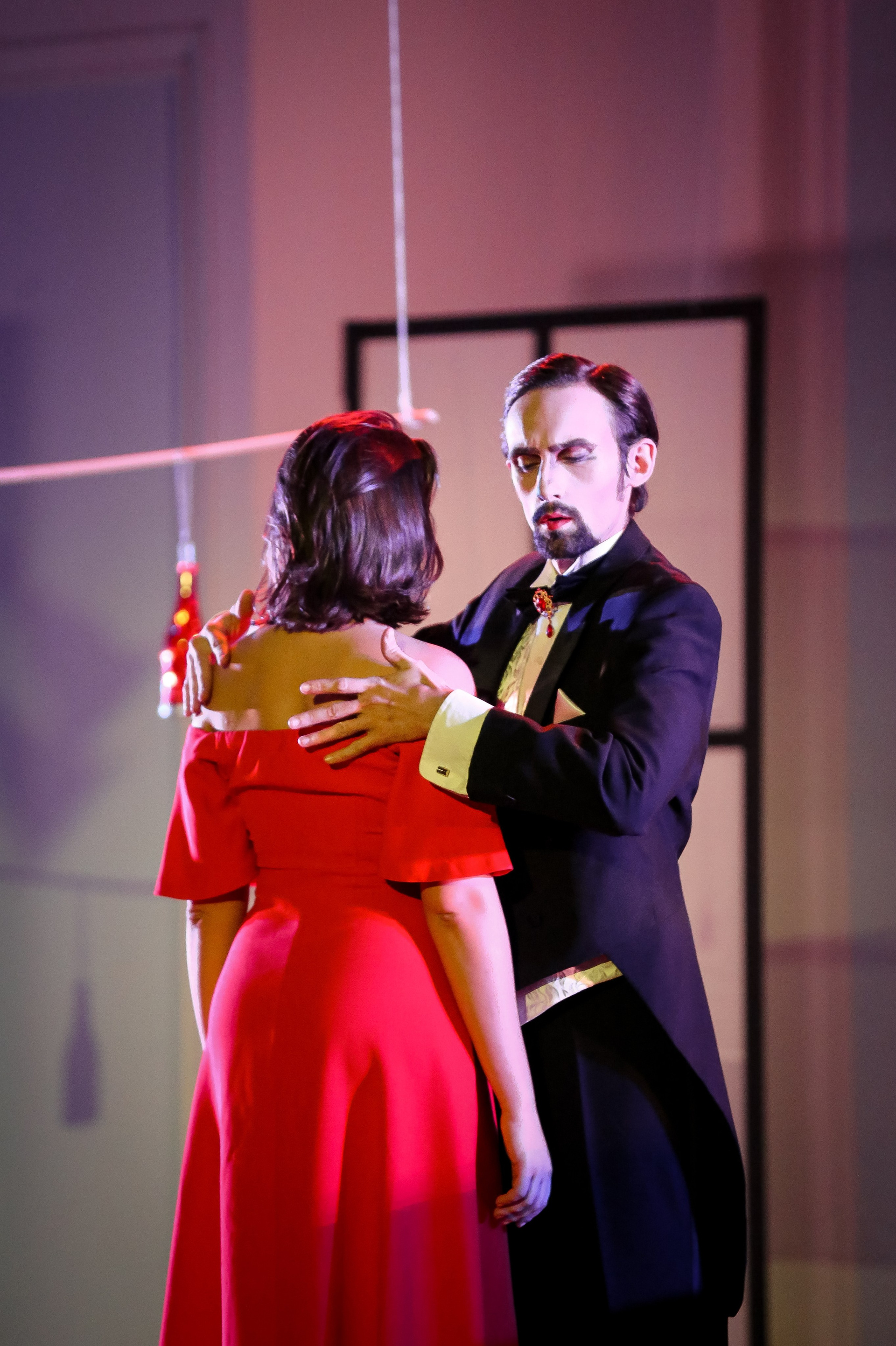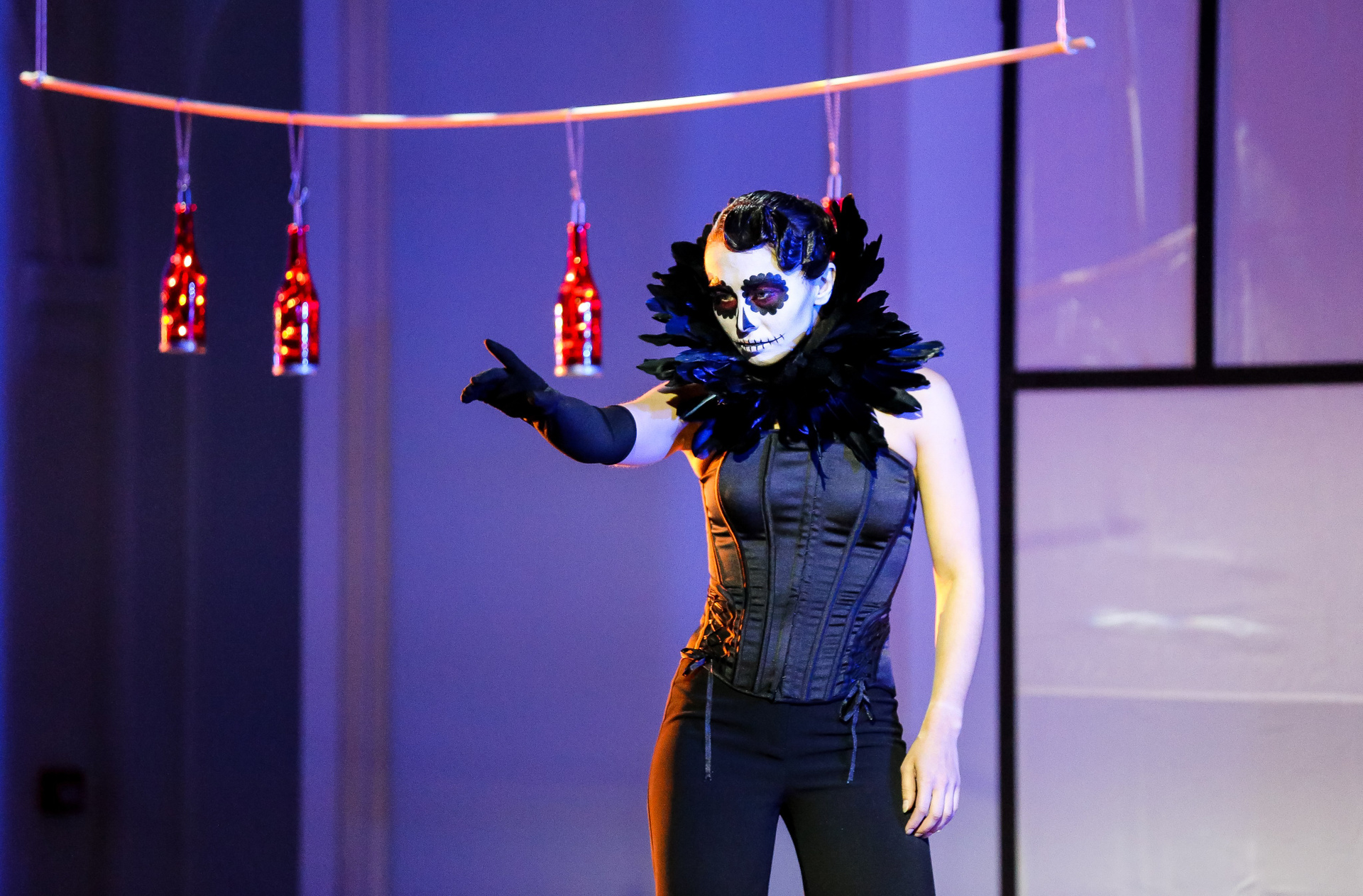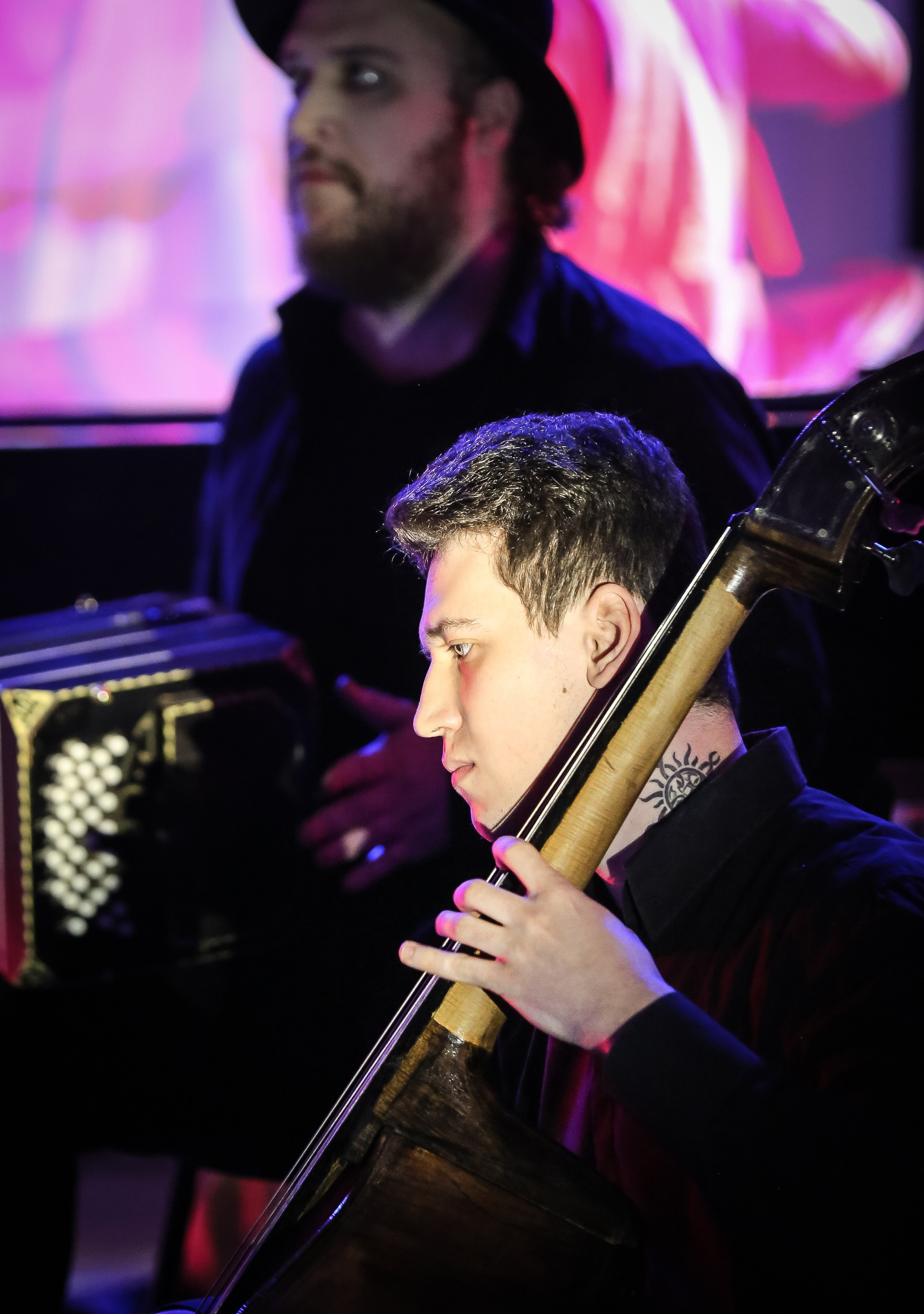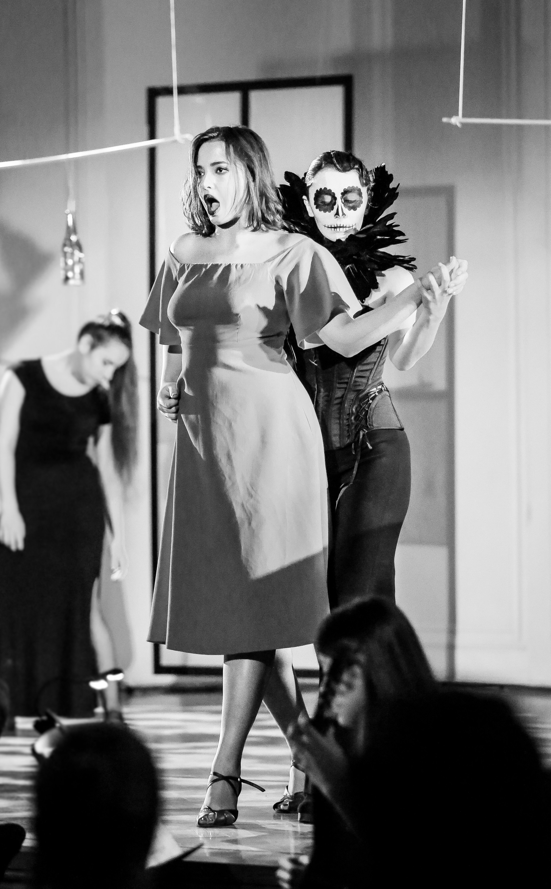 Поющих в этой постановке всего двое — Паядор, эдакий аргентинский мейстерзингер (мощный, звонкий и красивый бас-баритон Ильи Варанкина был впечатляющ) и, собственно, сама Мария — ее партия написана теоретически для меццо-сопрано, но традиционно исполняется чаще всего певицами танго. В обсуждаемом спектакле заглавную роль играла артистка также не с академическим, а эстрадным голосом — Дарья Антонюк, и ее низкий, терпкий, чуть с хрипотцой тембр слушался в таком жанре весьма органично. Непрерывно присутствуют в зале, хоть и не поют, еще чтец-Дуэнде (от голоса Игоря Витковского по спине то и дело пробегали мурашки!) и бессловесная, меланхоличная, неповторимо изящная и почти нежная, но беспощадная Смерть — исполнительница ее роли Мария Почукаева также отвечала за хореографию, в подобном спектакле имеющую ключевое значение.