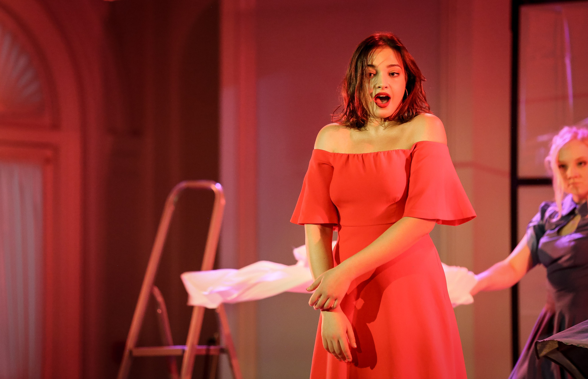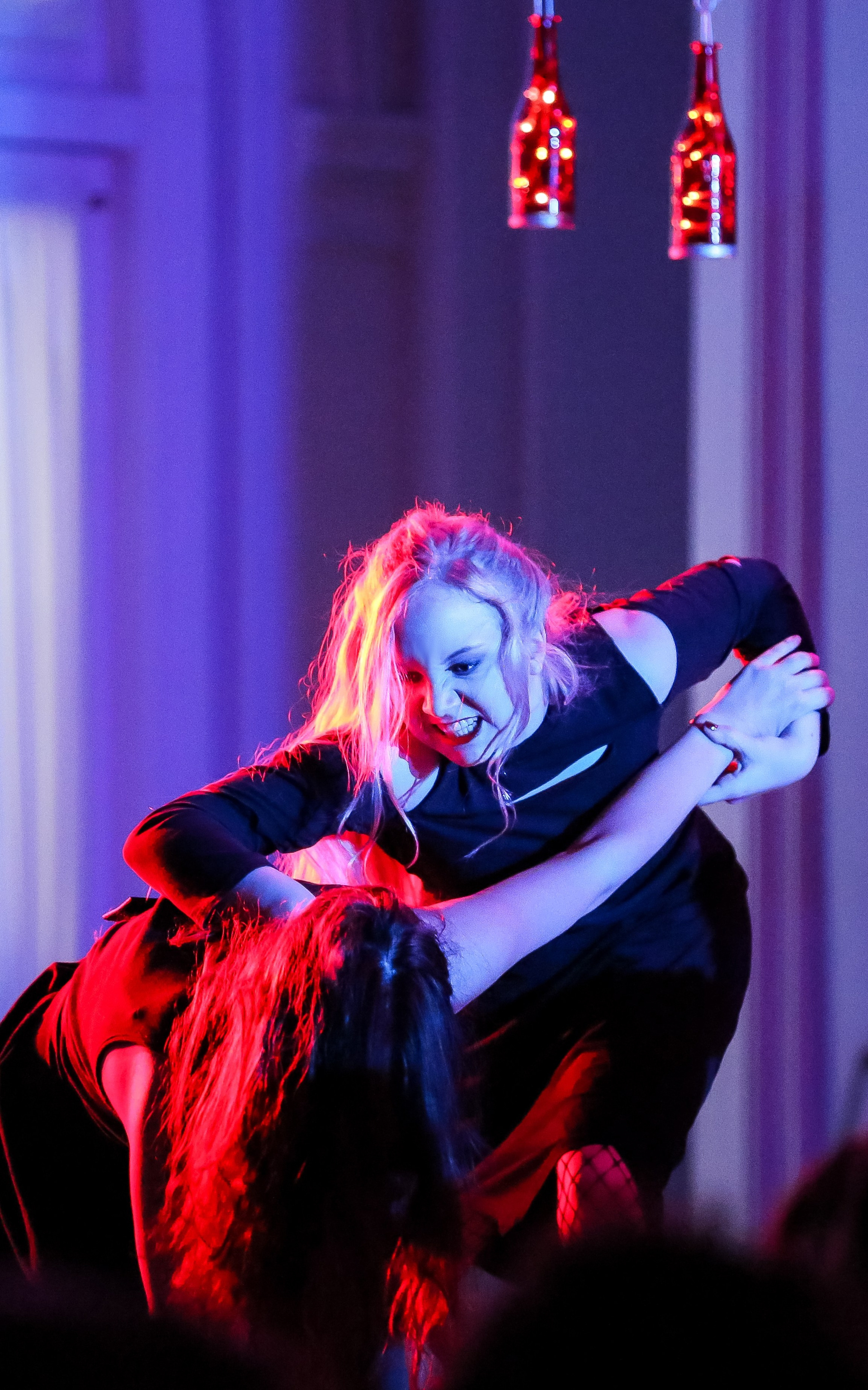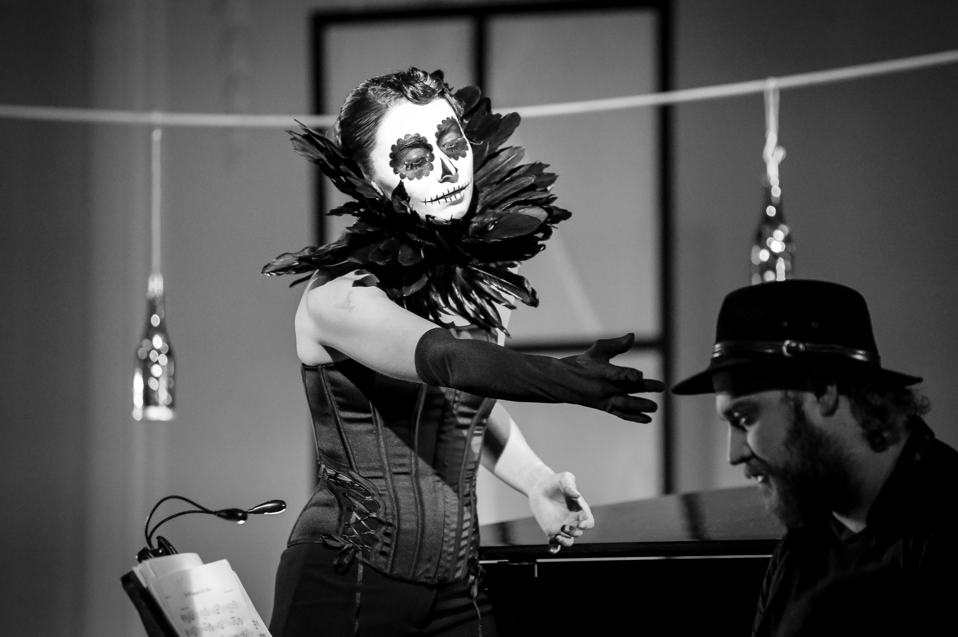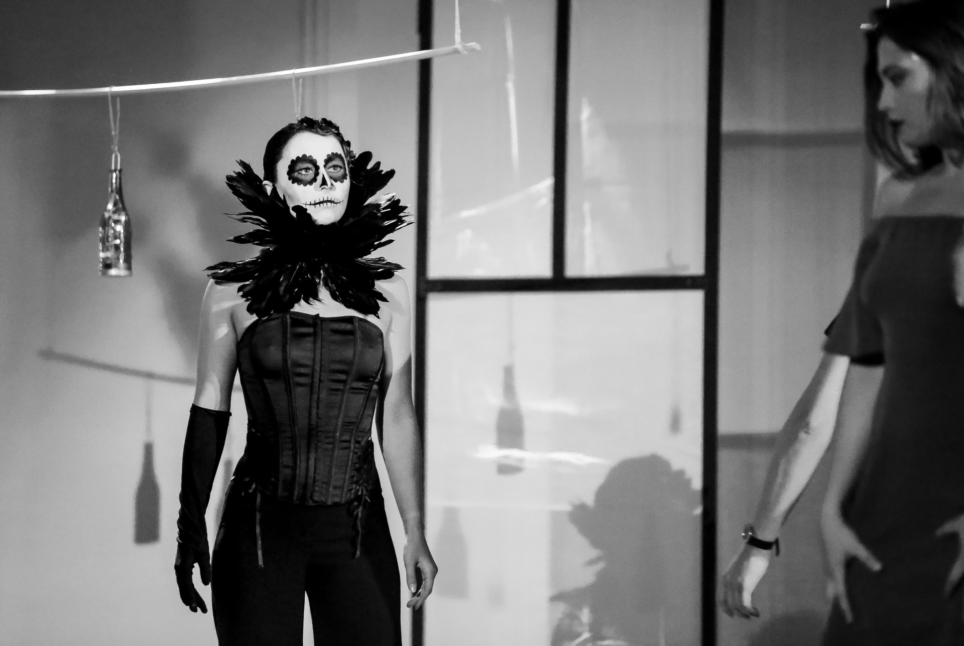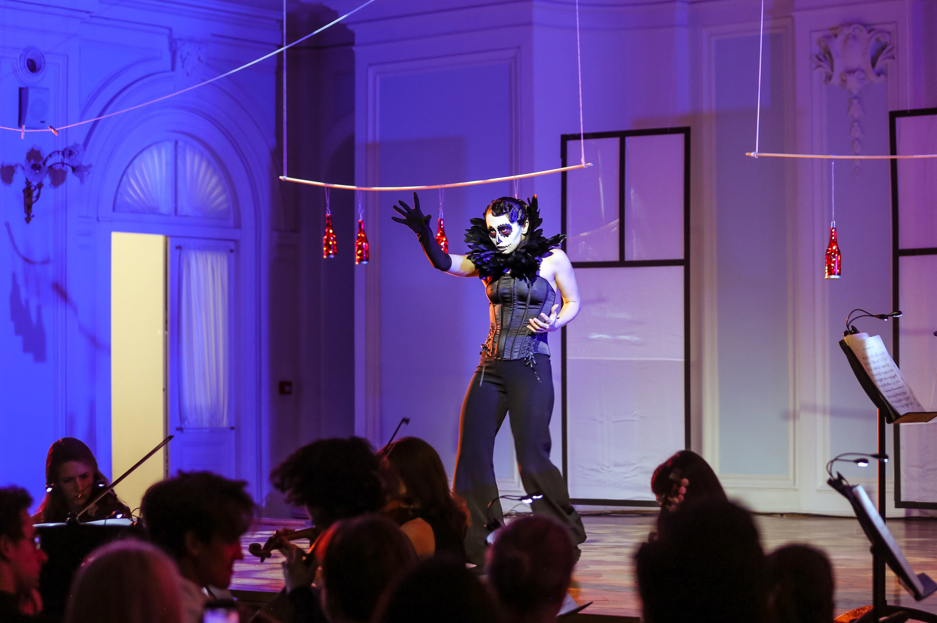 Поющих в этой постановке всего двое — Паядор, эдакий аргентинский мейстерзингер (мощный, звонкий и красивый бас-баритон Ильи Варанкина был впечатляющ) и, собственно, сама Мария — ее партия написана теоретически для меццо-сопрано, но традиционно исполняется чаще всего певицами танго. В обсуждаемом спектакле заглавную роль играла артистка также не с академическим, а эстрадным голосом — Дарья Антонюк, и ее низкий, терпкий, чуть с хрипотцой тембр слушался в таком жанре весьма органично. Непрерывно присутствуют в зале, хоть и не поют, еще чтец-Дуэнде (от голоса Игоря Витковского по спине то и дело пробегали мурашки!) и бессловесная, меланхоличная, неповторимо изящная и почти нежная, но беспощадная Смерть — исполнительница ее роли Мария Почукаева также отвечала за хореографию, в подобном спектакле имеющую ключевое значение.