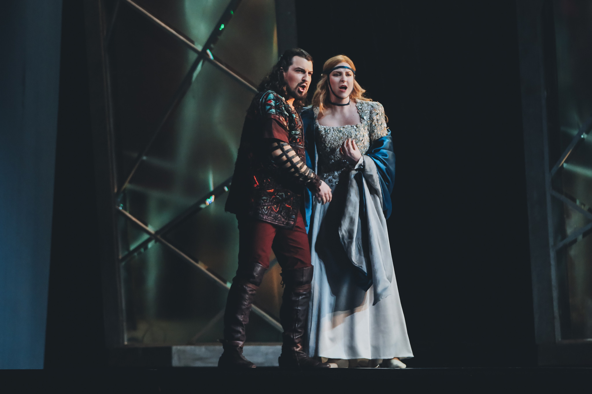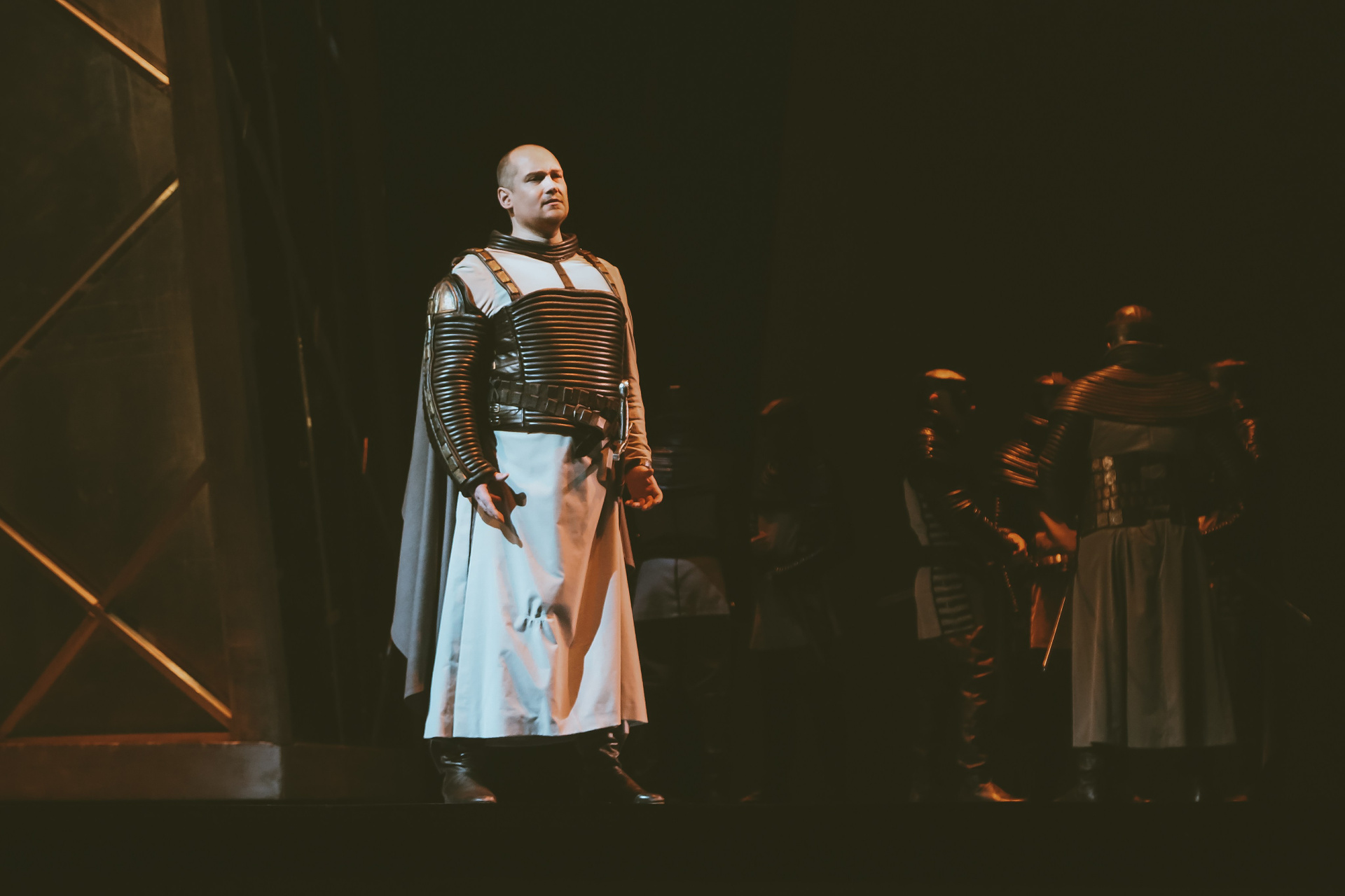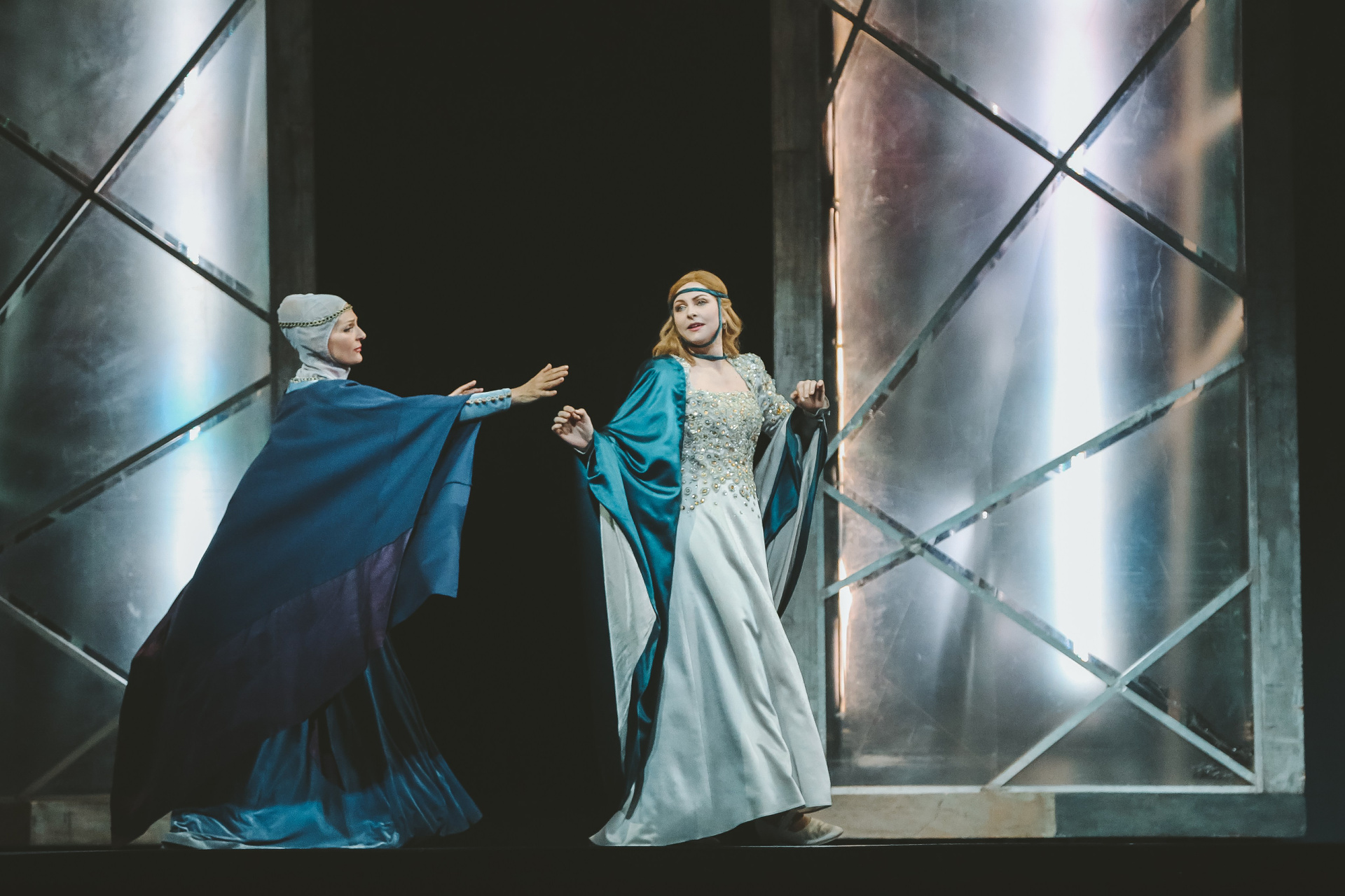 В этом смысле «Трубадура», который ещё с 2012-го года идёт в «Новой опере» (в постановке итальянской команды) можно назвать довольно компромиссным. С одной стороны, сценография по-современному минималистичная, абстрактная и стильная: три огромных башни-призмы, каждая с тремя сторонами, символизирующие, соответственно, миры героев — графа ди Луна, Леоноры и цыган, при этом большое значение придаётся цвету и в целом световой партитуре, а в остальном всё довольно традиционно. В общем, крепкий такой спектакль, который радует глаз красочностью и эстетизмом, а слух — отменной работой оркестра и хора, потому по возможности всегда иду, если вижу в афише. Так что ради очередного показа в начале февраля даже нарушила свое декретное затворничество. Хотя были для этого и дополнительные веские поводы. Например, послушать новый для меня в этой постановке состав солистов. Как известно, без великолепной пятерки голосов к «Трубадуру» и приступать даже не стоит, но в этом смысле заявленный каст был многообещающим, сильным и гармоничным, так что не обманул ожиданий (Азучена — Агунда Кулаева, Манрико — Михаил Новиков, Граф ди Луна — Андрей Борисенко, Леонора — Кристина Пономарева, Феррандо — Константин Федотов).