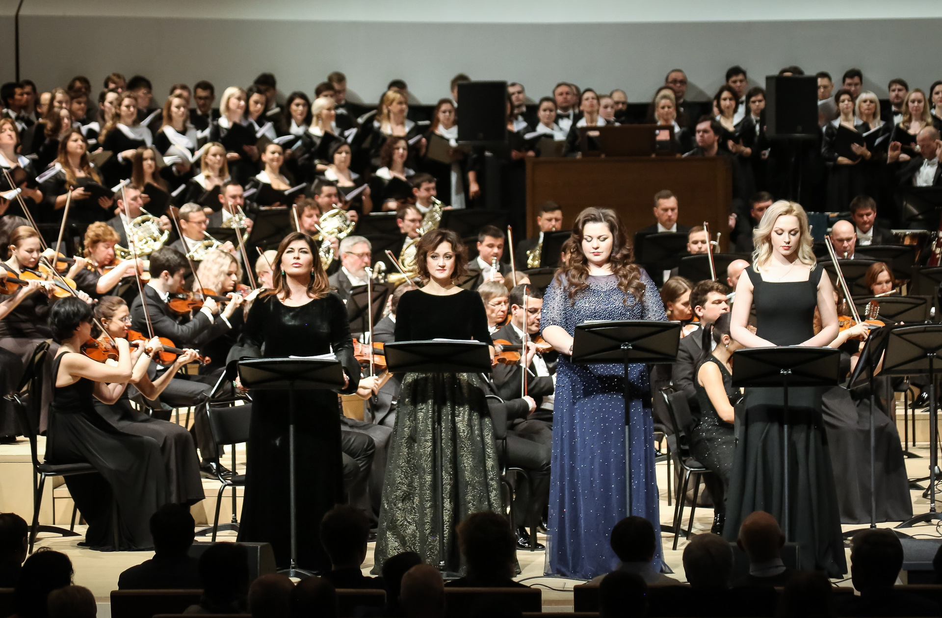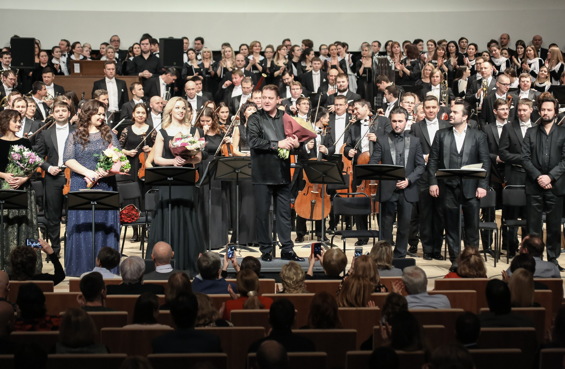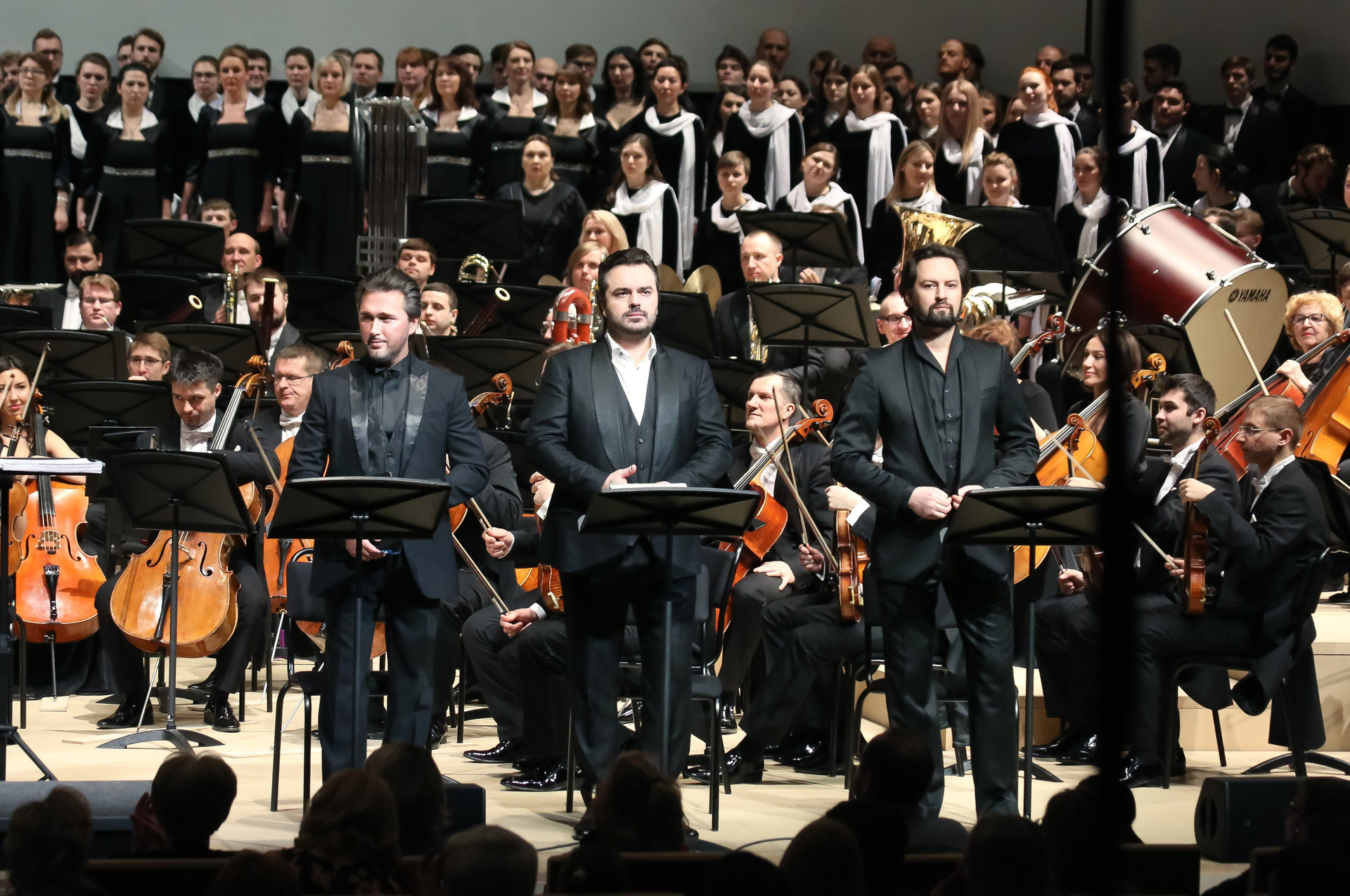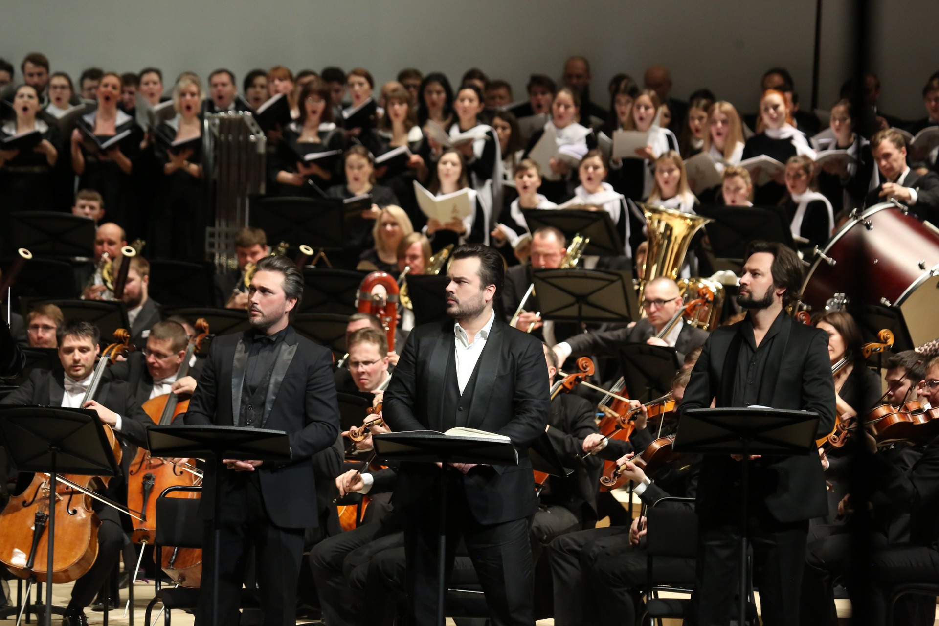 Это созвездие певцов, к сожалению, понесло определенные потери — перед началом симфонии ведущий предупредил о болезни Алексея Татаринцева, но поскольку практически нет вокалистов, готовых сходу «влететь» в подобное произведение, замены не оказалось и Алексею стоически пришлось выступать самому. При этом надо отметить, хоть голос звучал легко, почти безвибратно, однако не тонул в массе оркестра. Да и в целом сольные фрагменты прослушивались отлично, вызывая восторг и трепет — в особенности парящее в поднебесной фактуре сопрано Ирины Боженко, густое меццо Олеси Петровой, изумительные арии Василия Ладюка и Евгения Ставинского во второй части.
