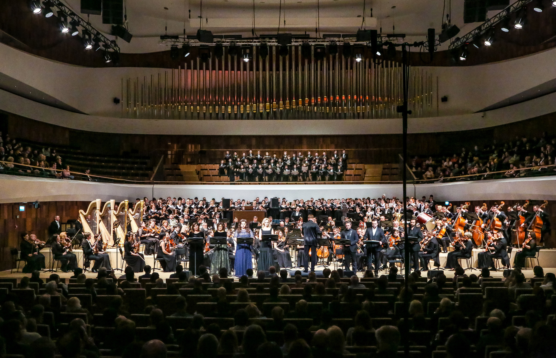 Помимо ГСО Республики Татарстан, выступавшего расширенным составом, в исполнении участвовал хор мальчиков Свешниковского училища, два взрослых смешанных хора — «Мастера хорового пения» Льва Конторовича и коллектив АХИ им. Попова, а также октет солистов, причем нерядовых, а сплошь выдающихся — сопрано Вероника Джиоева, Ирина Боженко, Ирина Поливанова, меццо Олеся Петрова и Мария Заикина, тенор Алексей Татаринцев, баритон Василий Ладюк и бас Евгений Ставинский. В общем, исполнительский аппарат потрясал воображение, хотя, конечно, о тысяче участников речи не шло (рекламность этого хода в принципе Малера возмущала, правда, сам он придумал еще более броский — о звучащей вселенной).