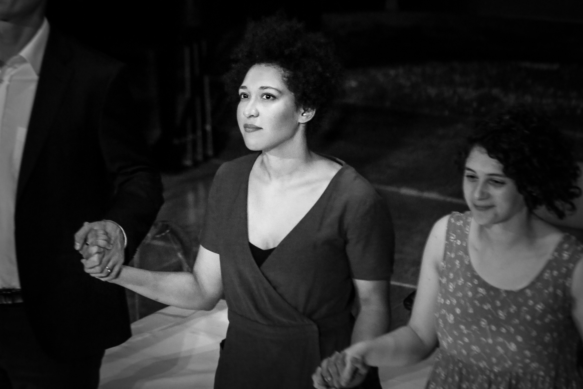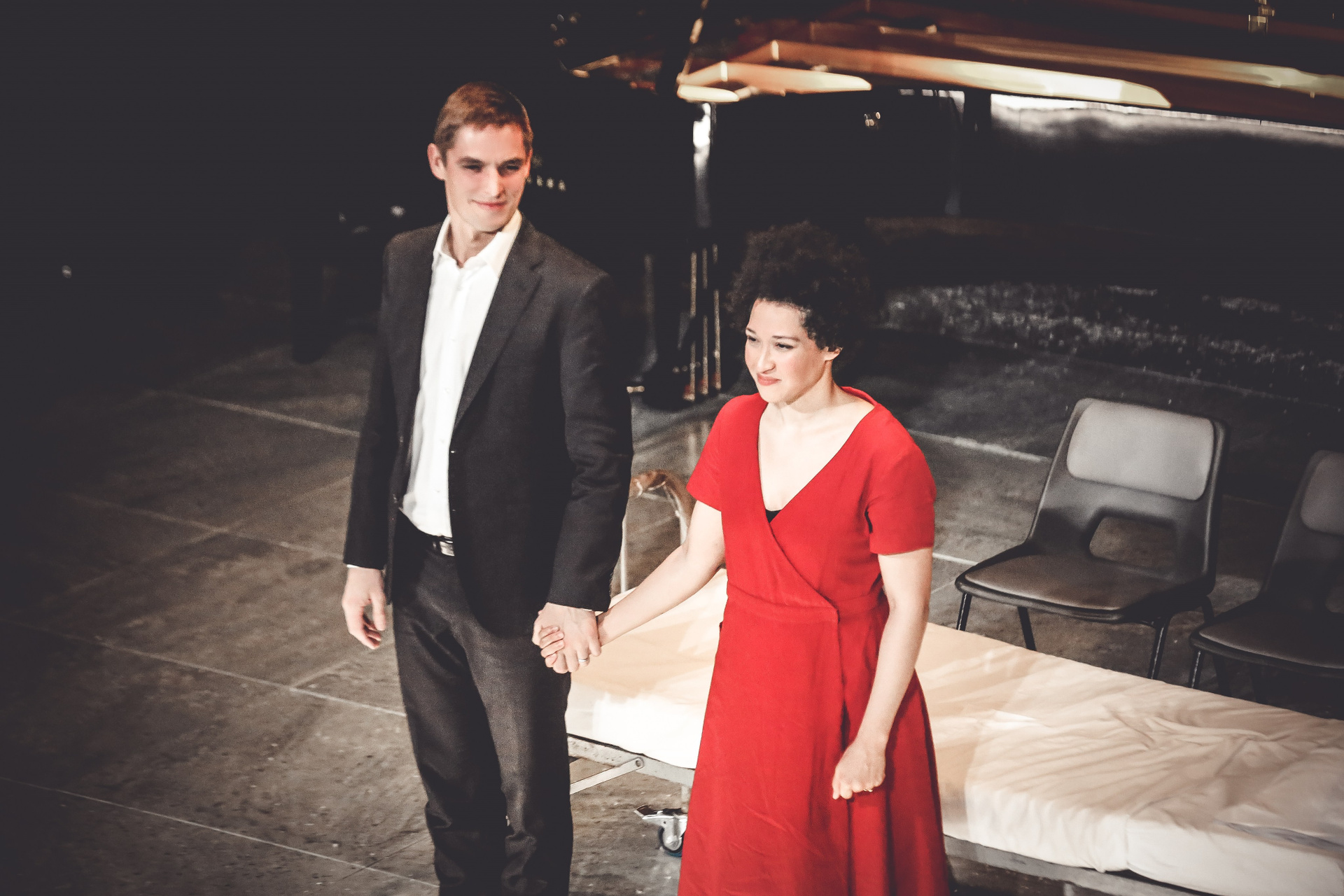 На протяжении 80 минут спектакля музыка звучит практически без пауз: сперва цикл Шумана, куда в нескольких местах вклиниваются диссонансы современности. Завершающая же «Любовь поэта» фортепианная постлюдия служит отправной точкой для песен Фокруля, музыкальный язык которых сочетает элементы двенадцатитоновости и пуантилизма с романтическими шумановскими отголосками: автор словно открывает окно в пейзажи 1840-го, но только для того, чтобы захлопнуть его — с каждым разом всё жестче. Притом головоломные пассажи бельгийского композитора давались солистке Джулии Баллок чуть ли не легче шумановских Lieder — оттого, может, что музыку 19-го века она почти не пела прежде, однако благодаря этой особенности «Любовь поэта» в ее исполнении звучала, пожалуй, особенно свежо и трогательно. Отдельная особенность и сложность также в том, что Баллок не просто пела, но находилась в центре всего сценического действия, непрерывно в движении — очень резком, агрессивном: ее постоянно раздевали-одевали, насильно усаживали и толкали с такой грубостью, что порой было волнительно за артистку. Тем не менее, Баллок оставалась невозмутима, и голос ее ни разу не дрогнул — вместе со своим партнером, прекрасным пианистом Седриком Тибергьяном они стали главными героями и триумфаторами спектакля.